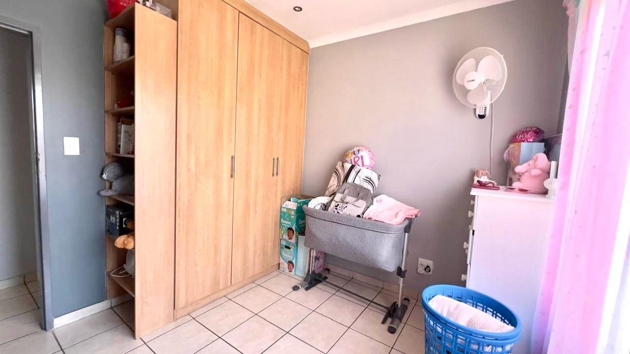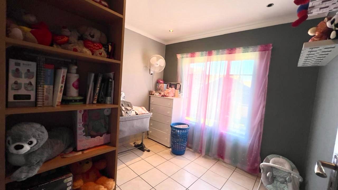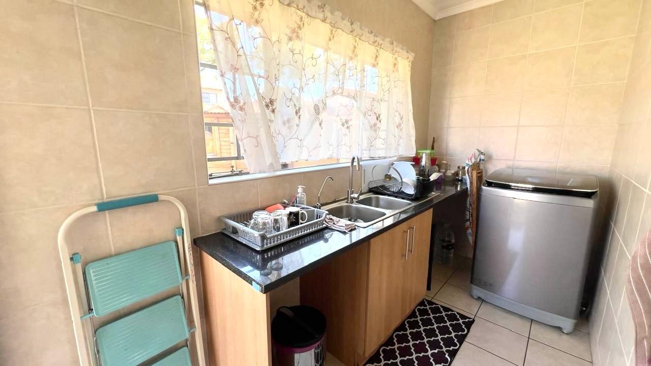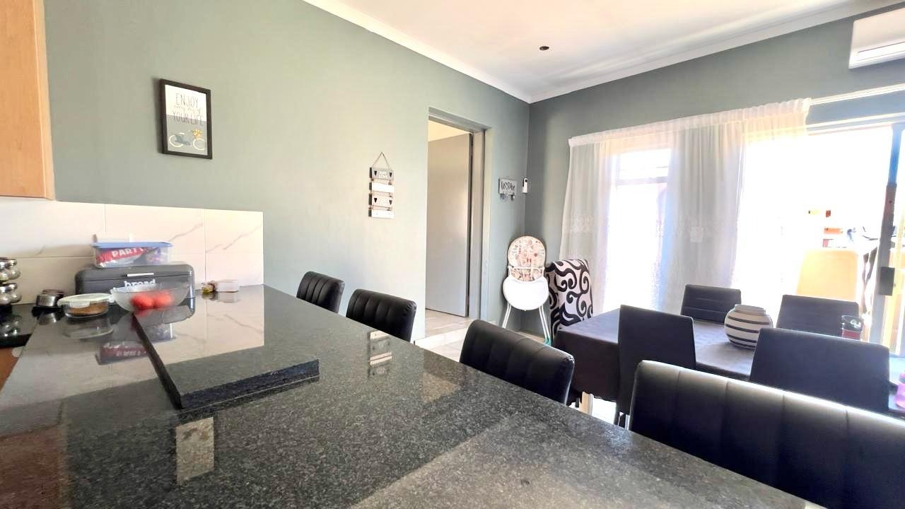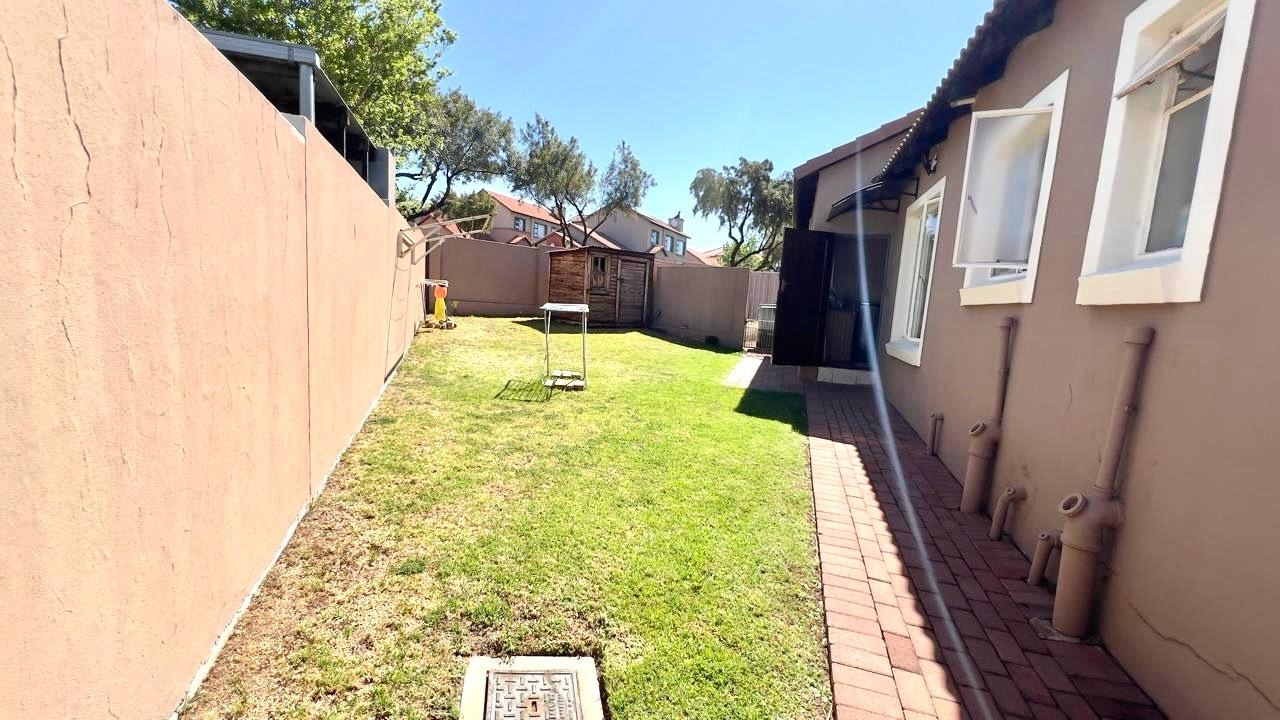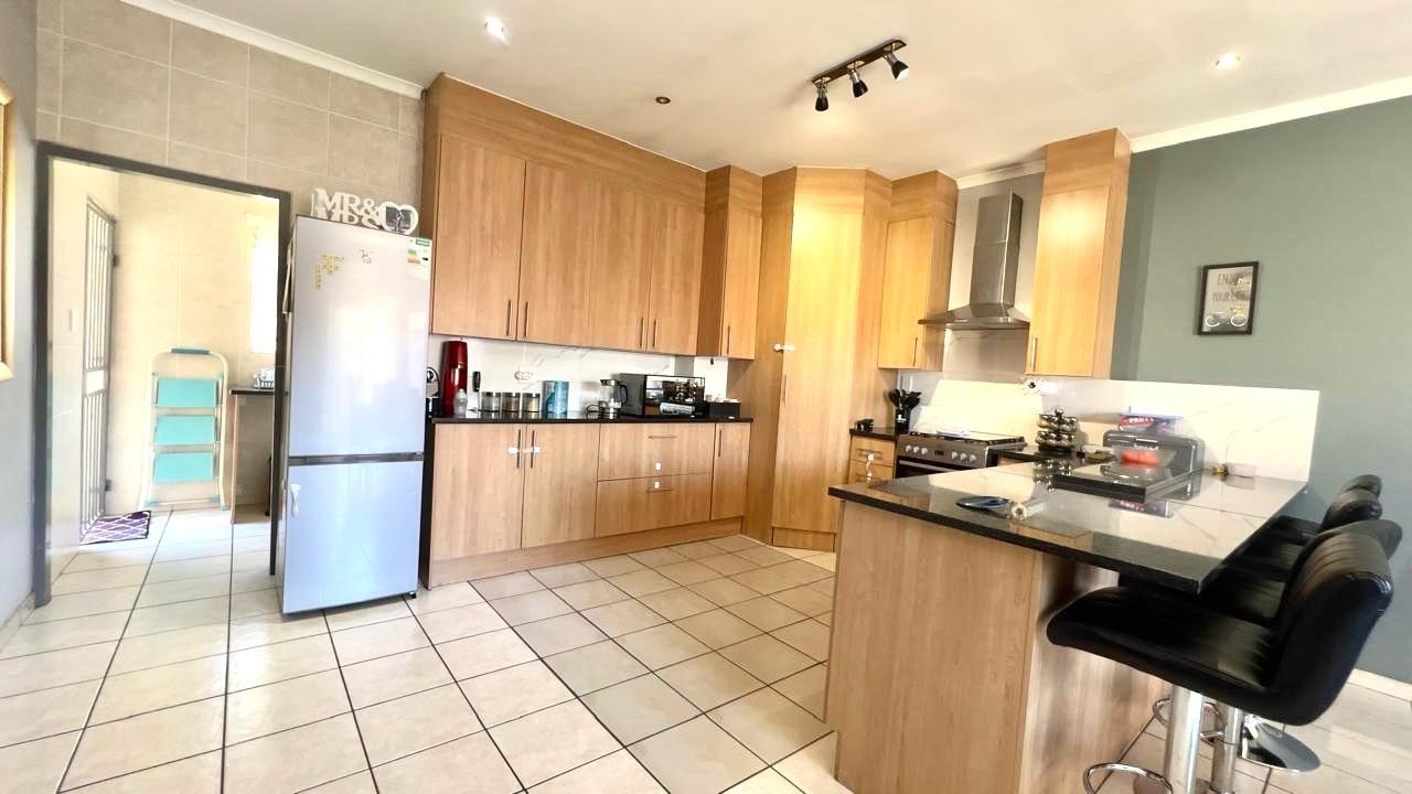 Discover this inviting 3-bedroom, 2-bathrooms home situated in the secure Thatchfield Estate, Centurion, South Africa. The residence features a practical open-plan layout, seamlessly connecting a modern kitchen with ample wood-toned cabinetry and dark countertops to the dining and lounge areas. Tiled flooring and recessed lighting extend throughout, with an air conditioning unit ensuring comfort. Outside, the property includes a private garden, a double garage, and an additional parking space. Enjoy peace of mind within this security complex, benefiting from 24-hour security, access gates, burglar bars, and fibre connectivity, offering a comfortable and connected lifestyle.
