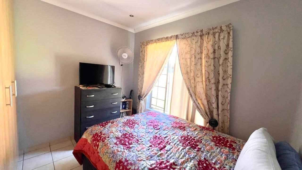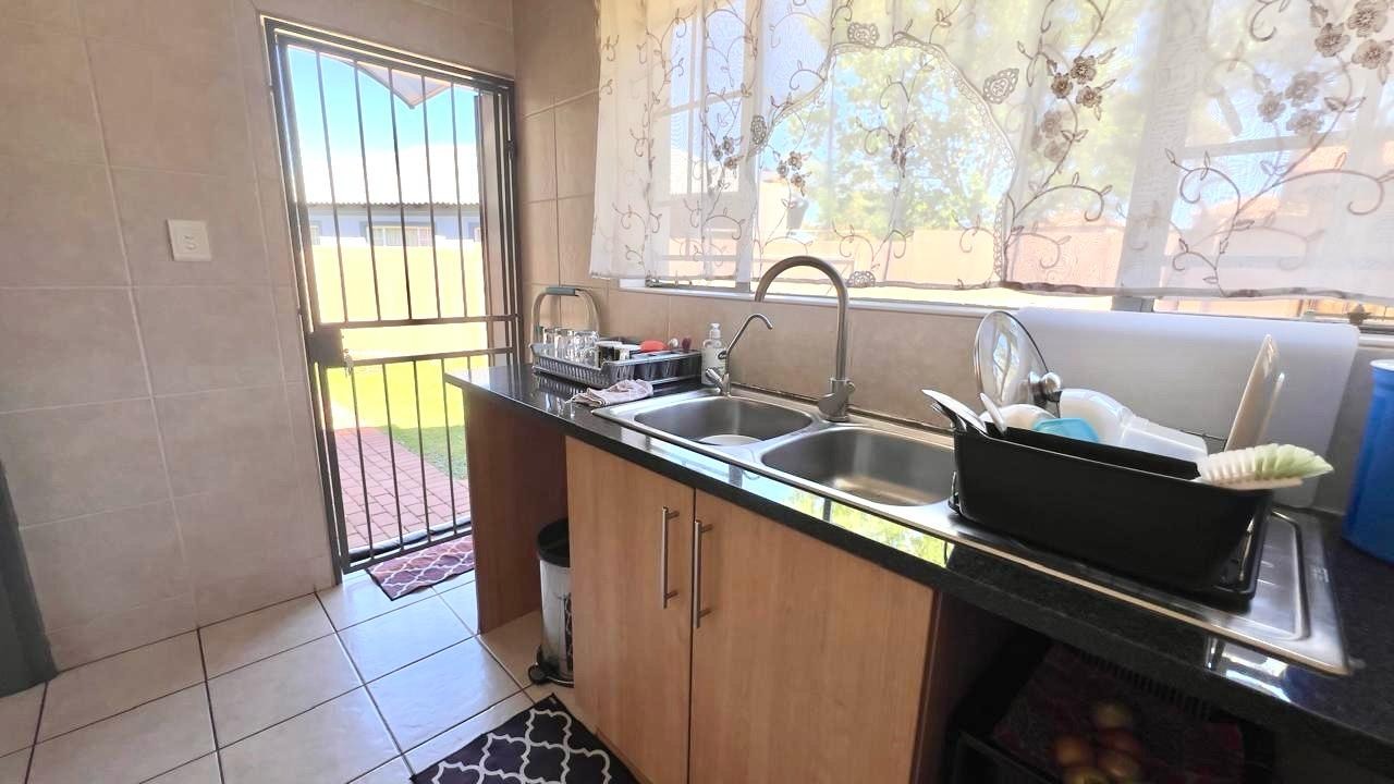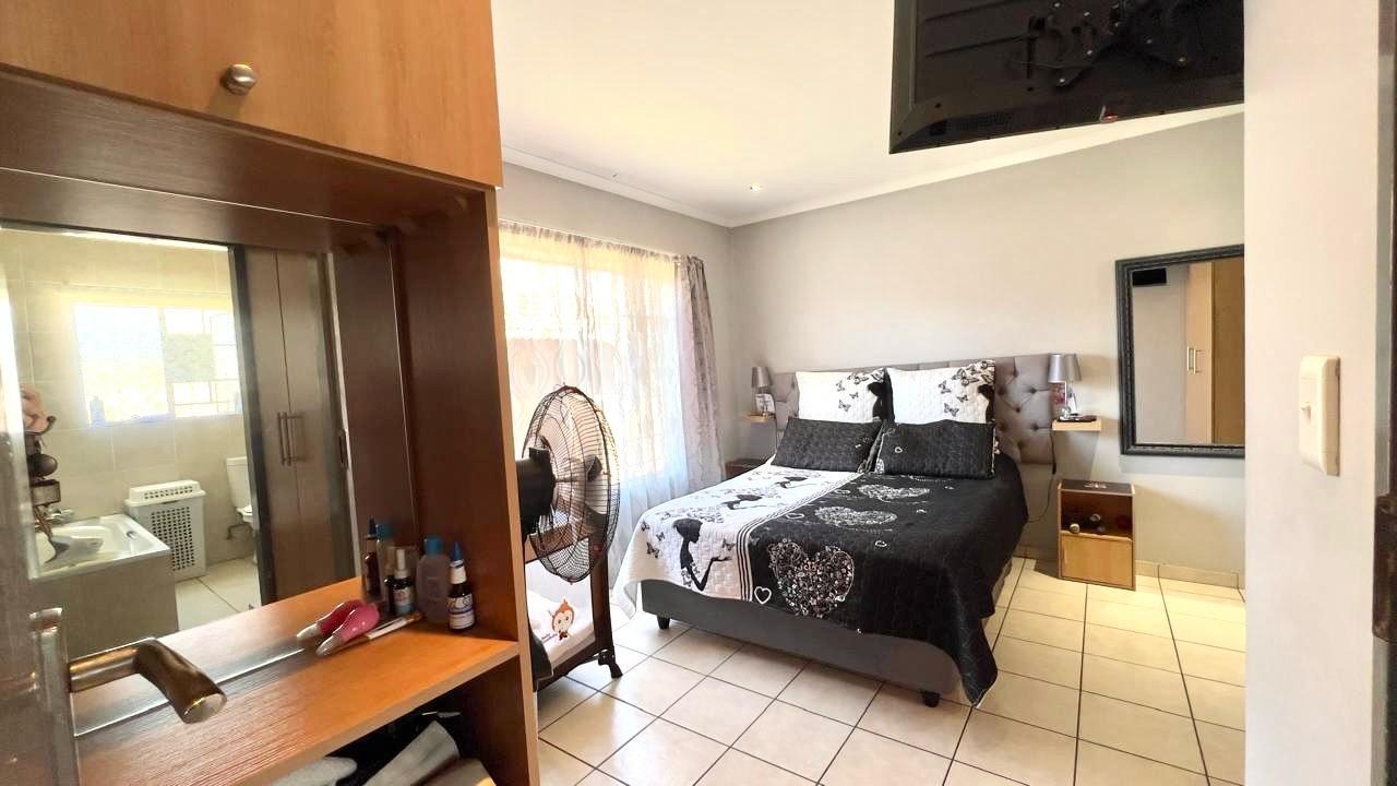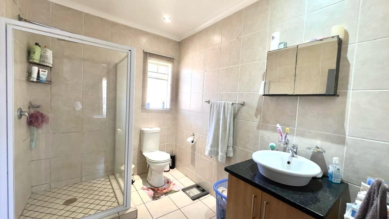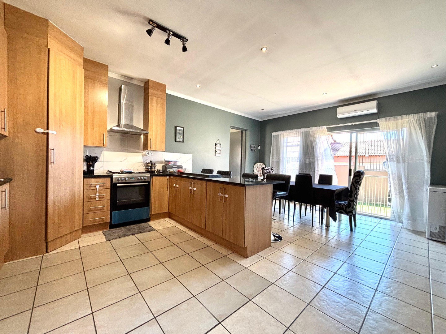 Discover this inviting 3-bedroom, 2-bathrooms home situated in the secure Thatchfield Estate, Centurion, South Africa. The residence features a practical open-plan layout, seamlessly connecting a modern kitchen with ample wood-toned cabinetry and dark countertops to the dining and lounge areas. Tiled flooring and recessed lighting extend throughout, with an air conditioning unit ensuring comfort. Outside, the property includes a private garden, a double garage, and an additional parking space. Enjoy peace of mind within this security complex, benefiting from 24-hour security, access gates, burglar bars, and fibre connectivity, offering a comfortable and connected lifestyle.