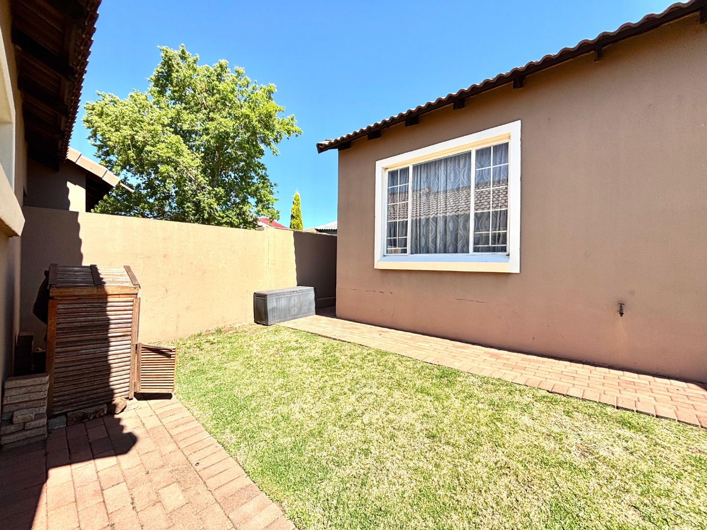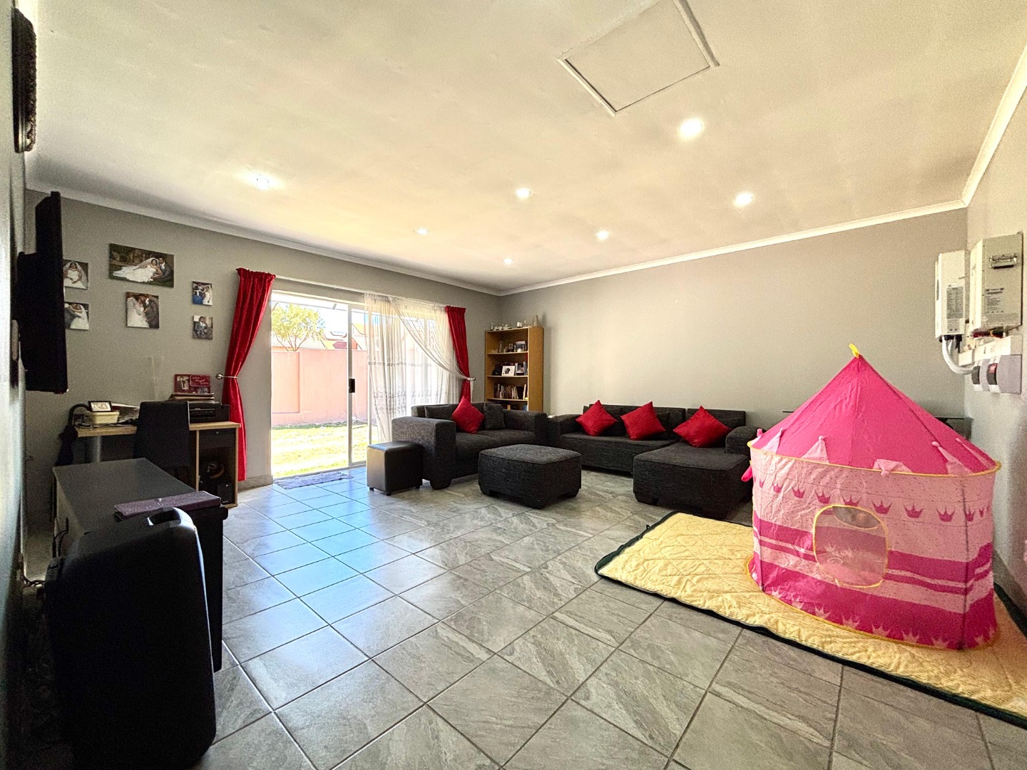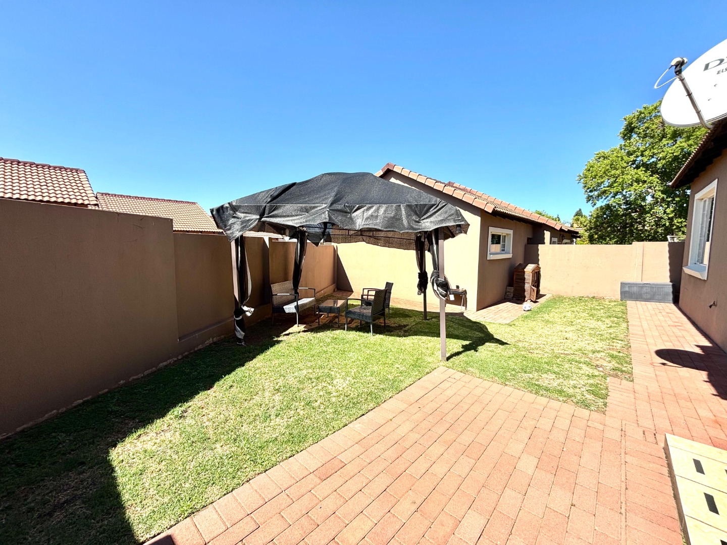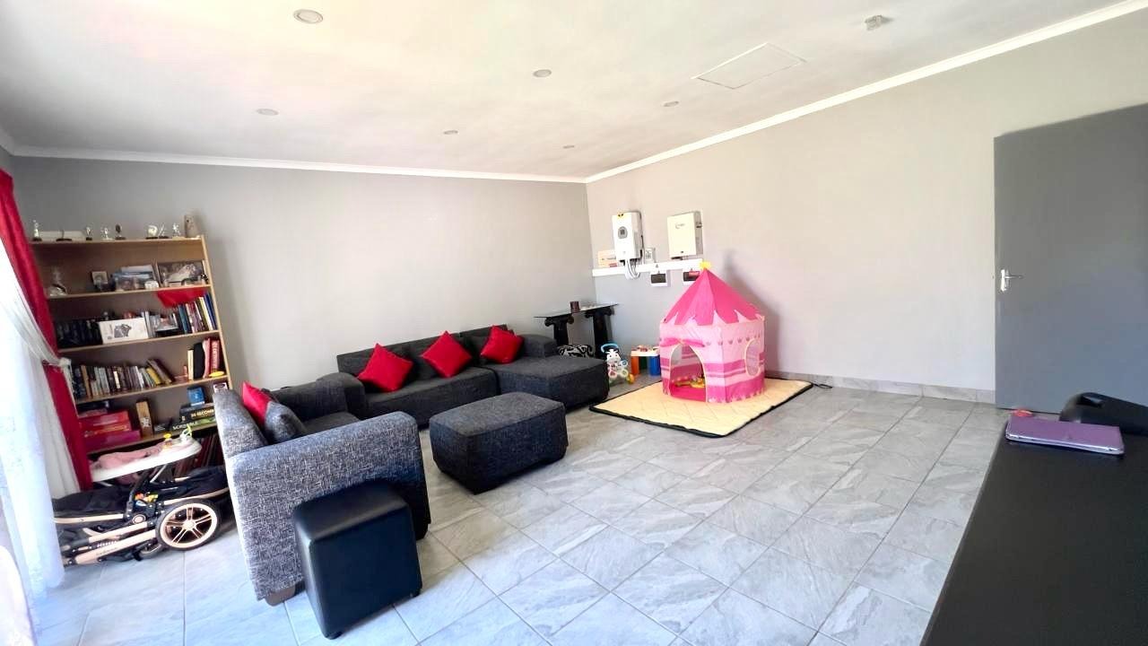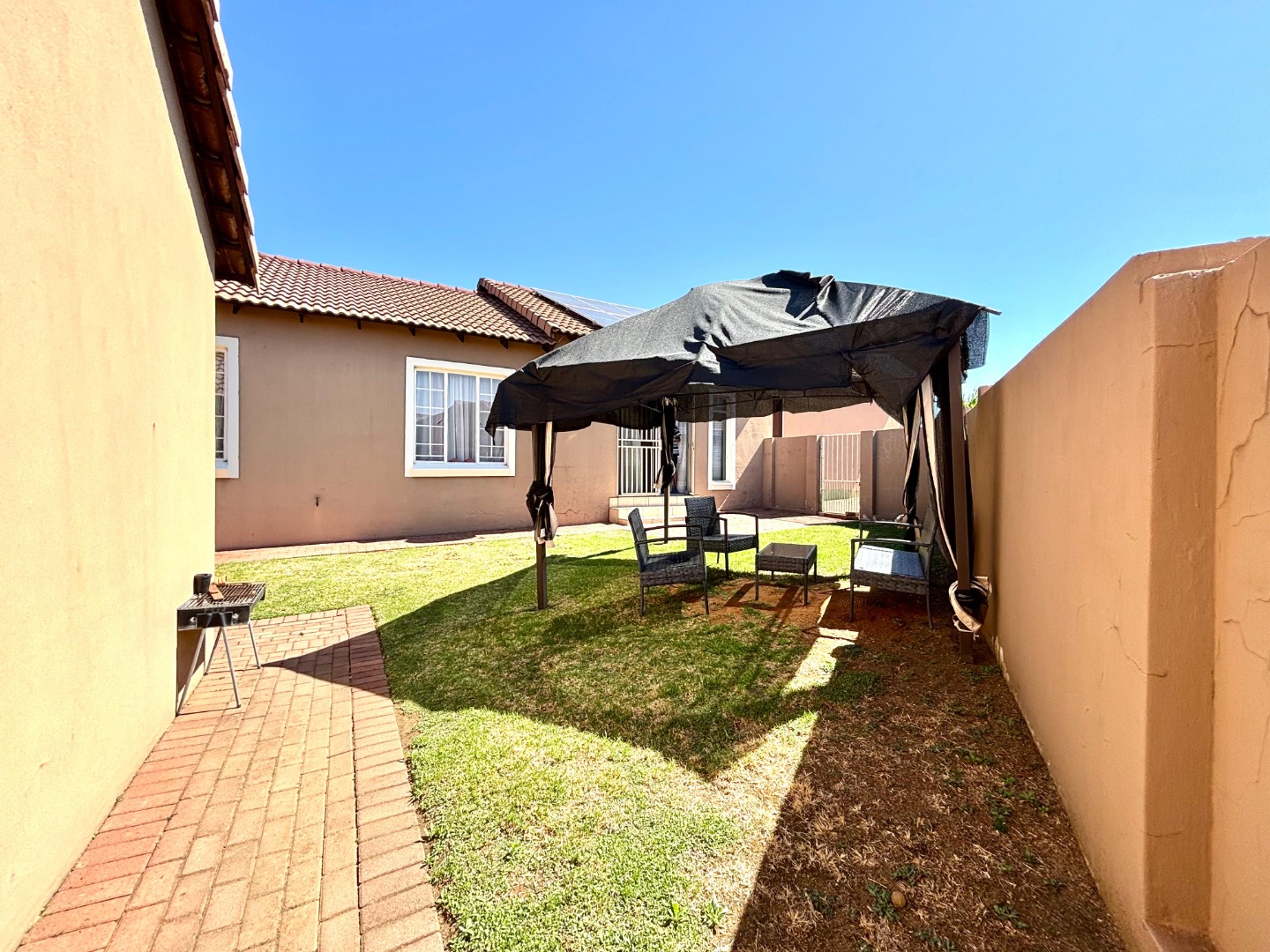 Discover this inviting 3-bedroom, 2-bathrooms home situated in the secure Thatchfield Estate, Centurion, South Africa. The residence features a practical open-plan layout, seamlessly connecting a modern kitchen with ample wood-toned cabinetry and dark countertops to the dining and lounge areas. Tiled flooring and recessed lighting extend throughout, with an air conditioning unit ensuring comfort. Outside, the property includes a private garden, a double garage, and an additional parking space. Enjoy peace of mind within this security complex, benefiting from 24-hour security, access gates, burglar bars, and fibre connectivity, offering a comfortable and connected lifestyle.