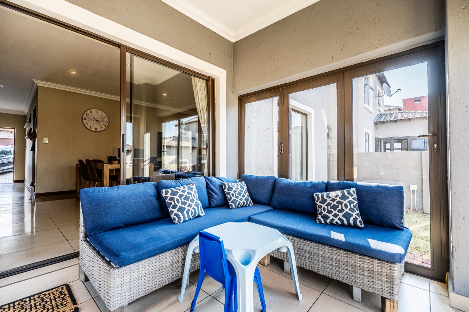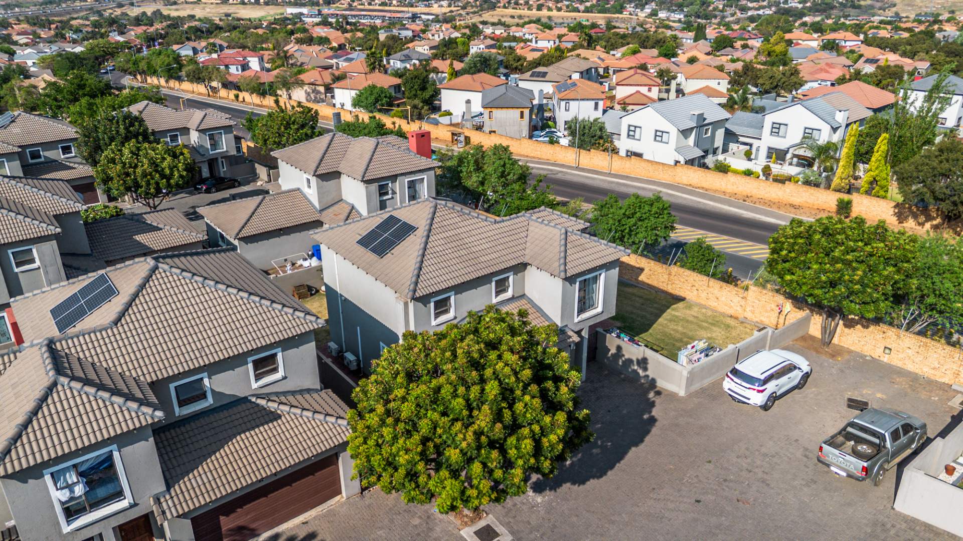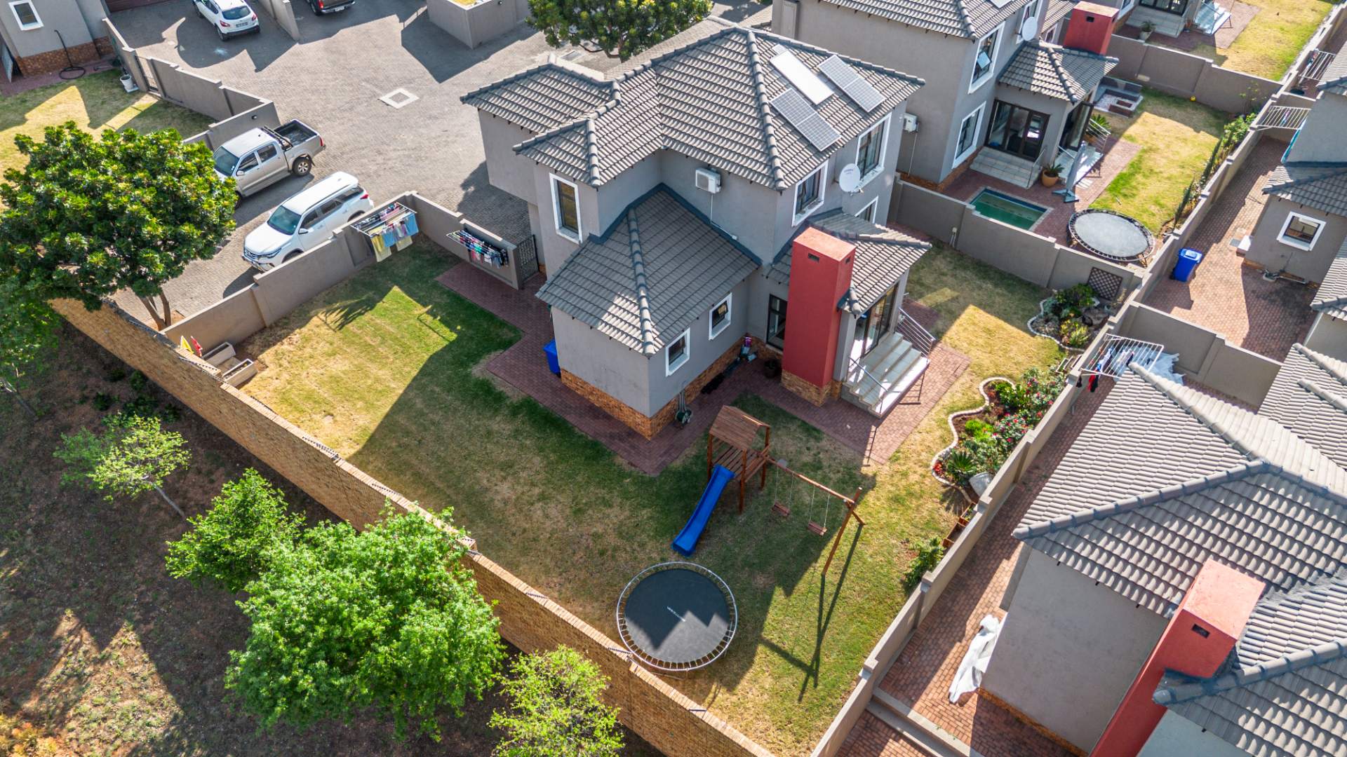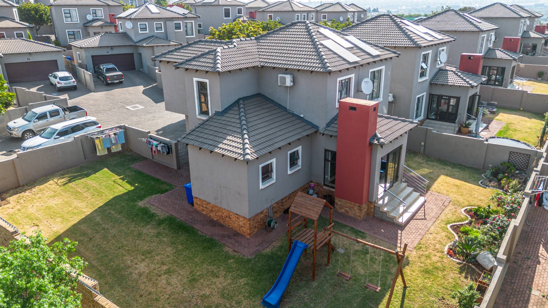 Residents benefit from comprehensive security features, including 24-hour security, an access gate, security post, and electric fencing, providing peace of mind. The home is also equipped with modern sustainability solutions, featuring solar panels, a solar geyser, a battery inverter, and fibre connectivity, ensuring energy efficiency and reliable internet.