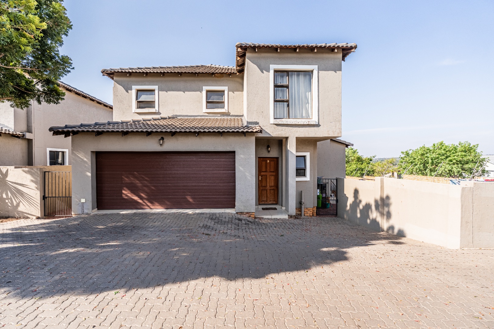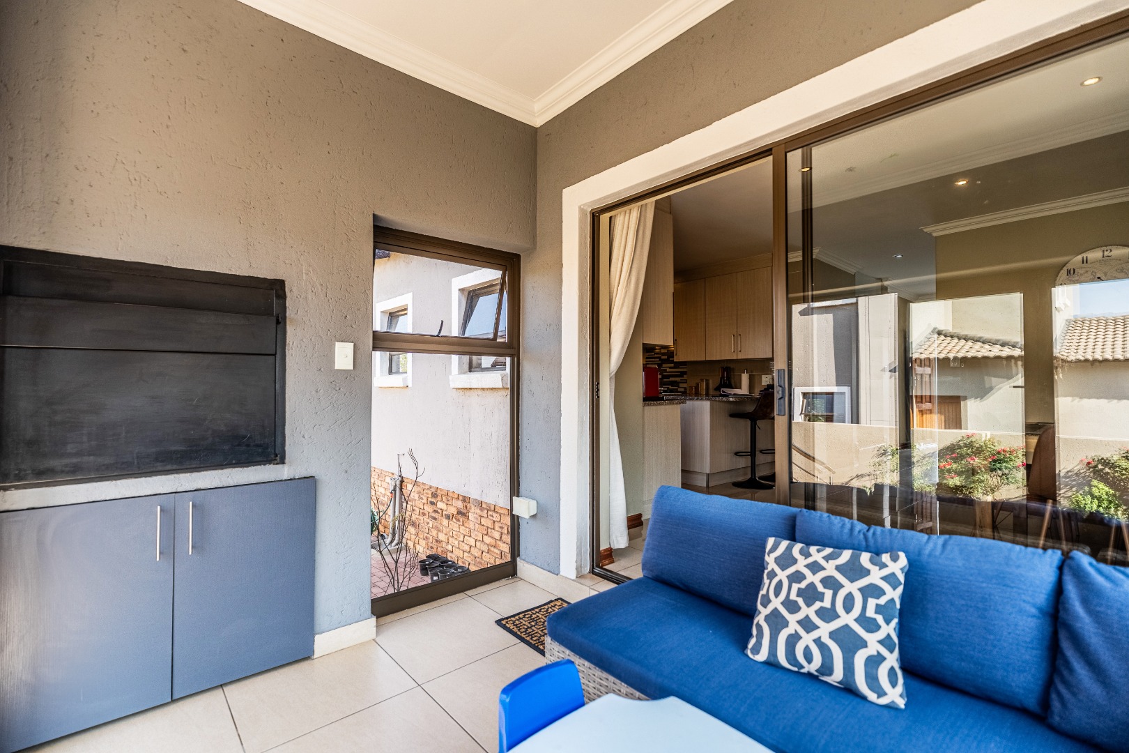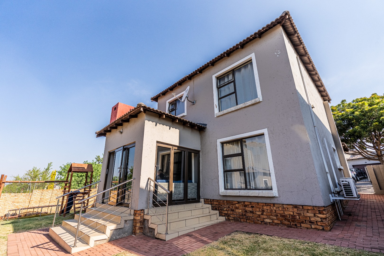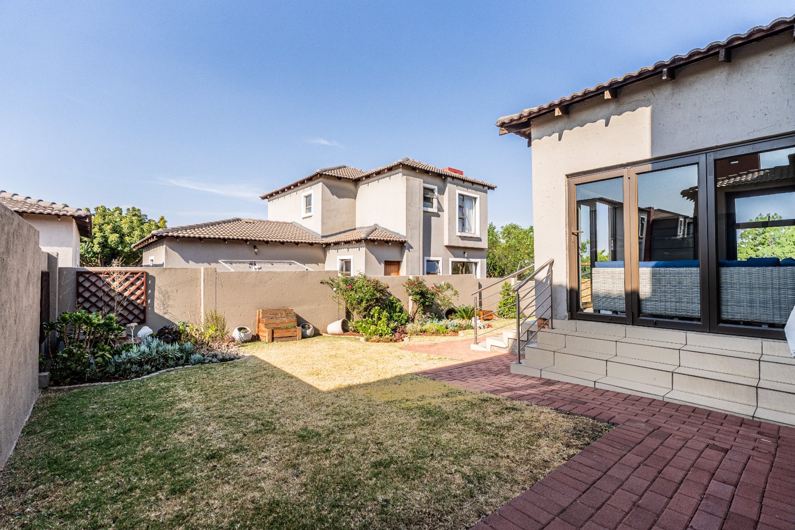 The modern kitchen is a highlight, featuring light cabinetry, gleaming granite countertops, a stylish mosaic tiled backsplash, and a breakfast bar. Equipped with a built-in oven, gas hob, stainless steel extractor, and a wine rack, it caters to all culinary needs. Upstairs, three comfortable bedrooms include a luxurious en-suite master, alongside 2.5 well-appointed bathrooms, including a guest toilet. Bedrooms offer modern finishes, air conditioning, and ample natural light. Outside, the private garden provides a spacious green retreat, perfect for family activities. A patio with a built-in braai extends the living space outdoors, ideal for entertaining. This pet-friendly home ensures a balanced indoor-outdoor lifestyle.