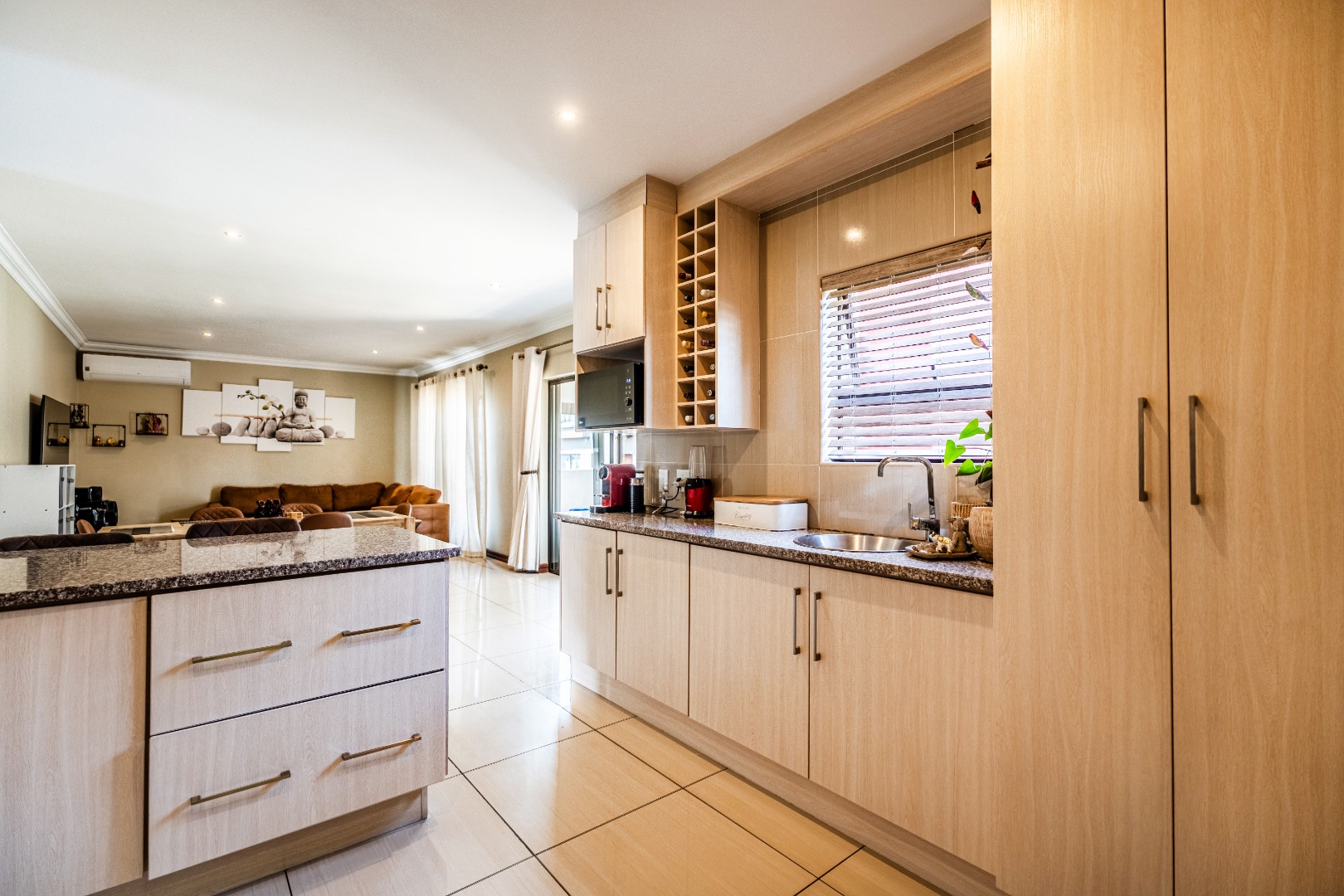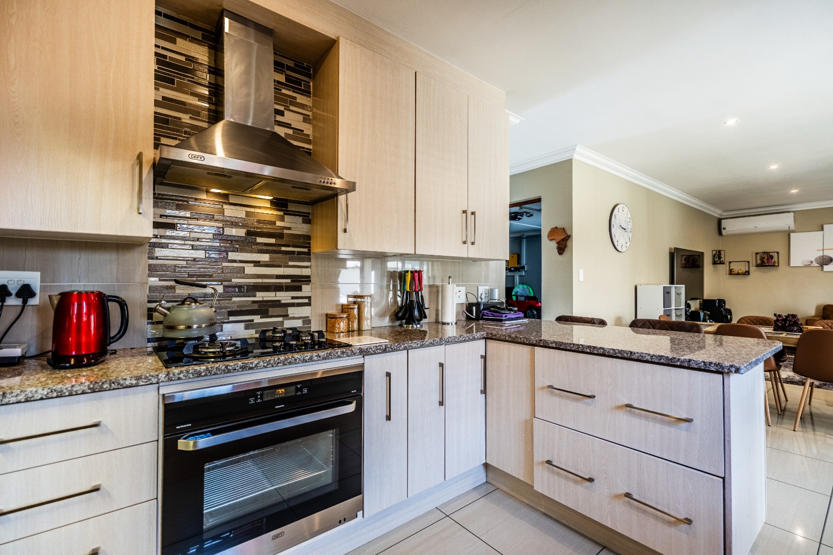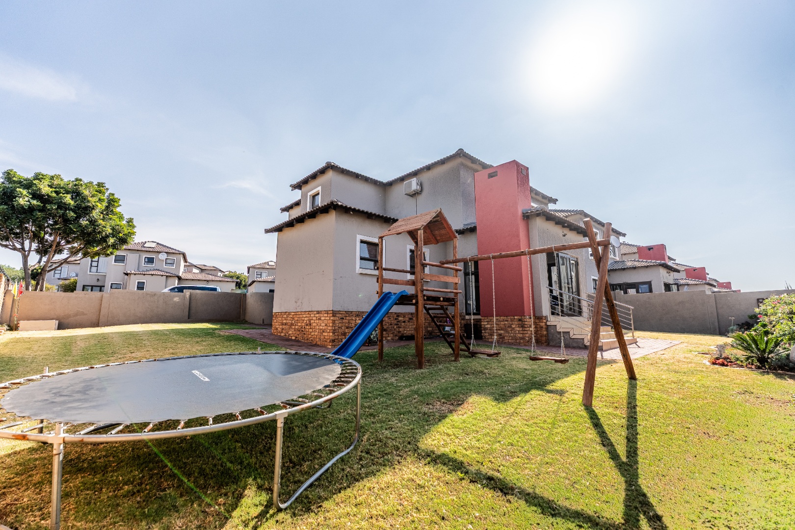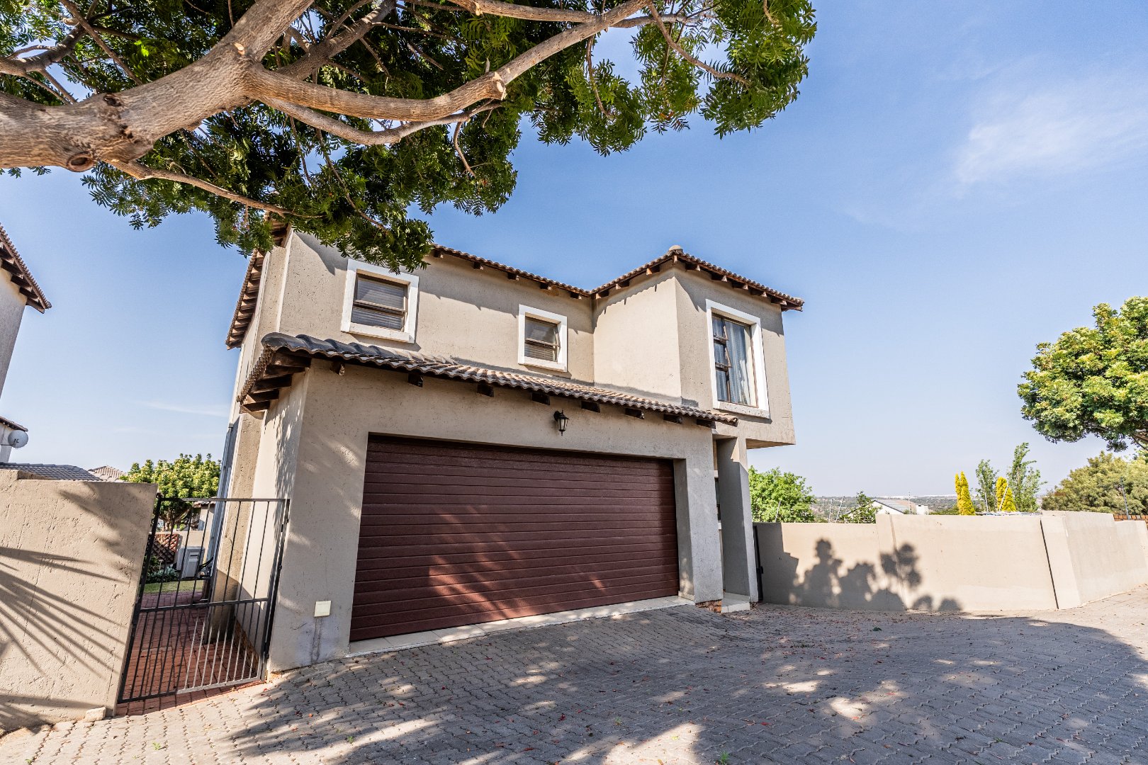 The modern kitchen is a highlight, featuring light cabinetry, gleaming granite countertops, a stylish mosaic tiled backsplash, and a breakfast bar. Equipped with a built-in oven, gas hob, stainless steel extractor, and a wine rack, it caters to all culinary needs. Upstairs, three comfortable bedrooms include a luxurious en-suite master, alongside 2.5 well-appointed bathrooms, including a guest toilet. Bedrooms offer modern finishes, air conditioning, and ample natural light. Outside, the private garden provides a spacious green retreat, perfect for family activities. A patio with a built-in braai extends the living space outdoors, ideal for entertaining. This pet-friendly home ensures a balanced indoor-outdoor lifestyle.