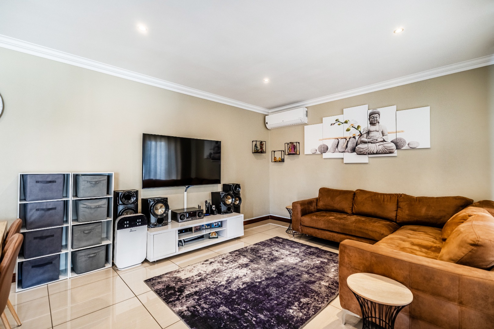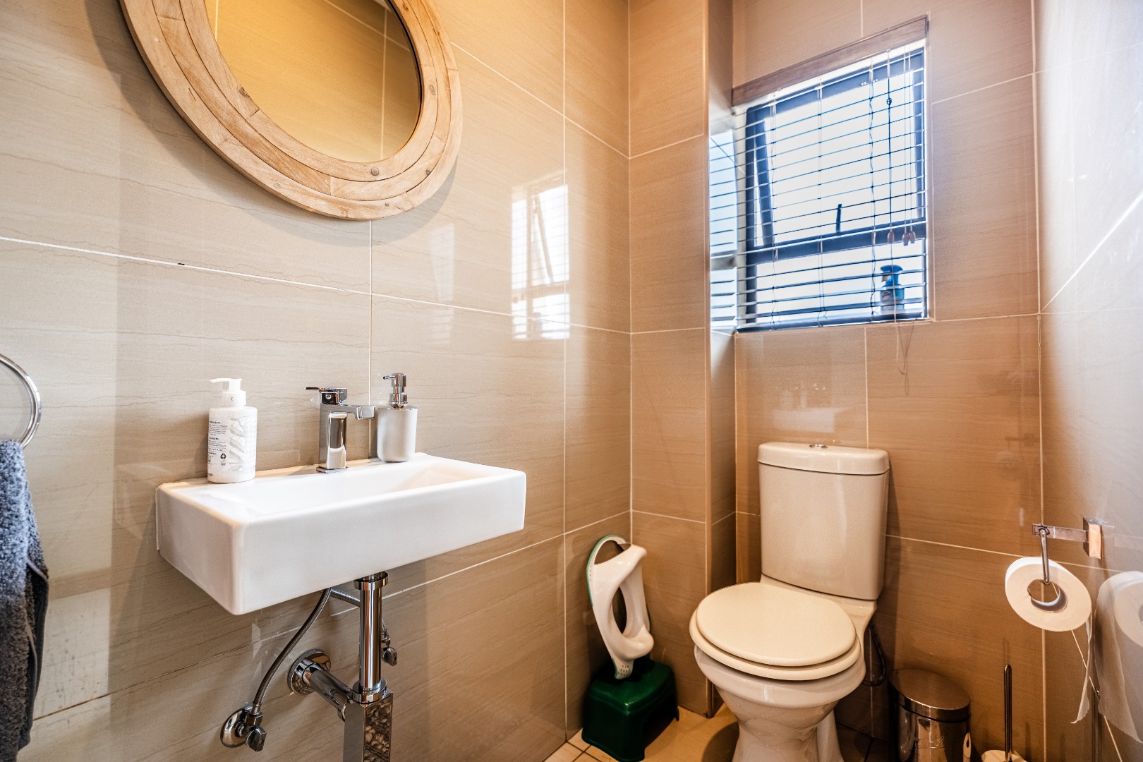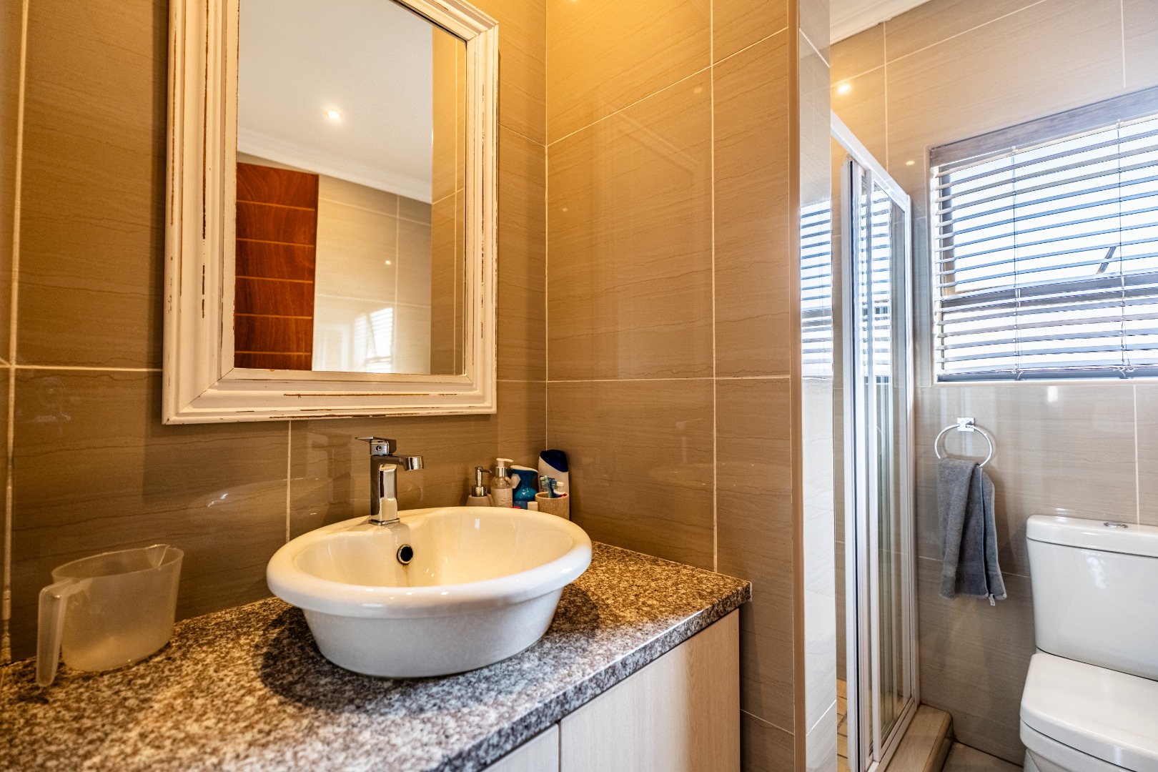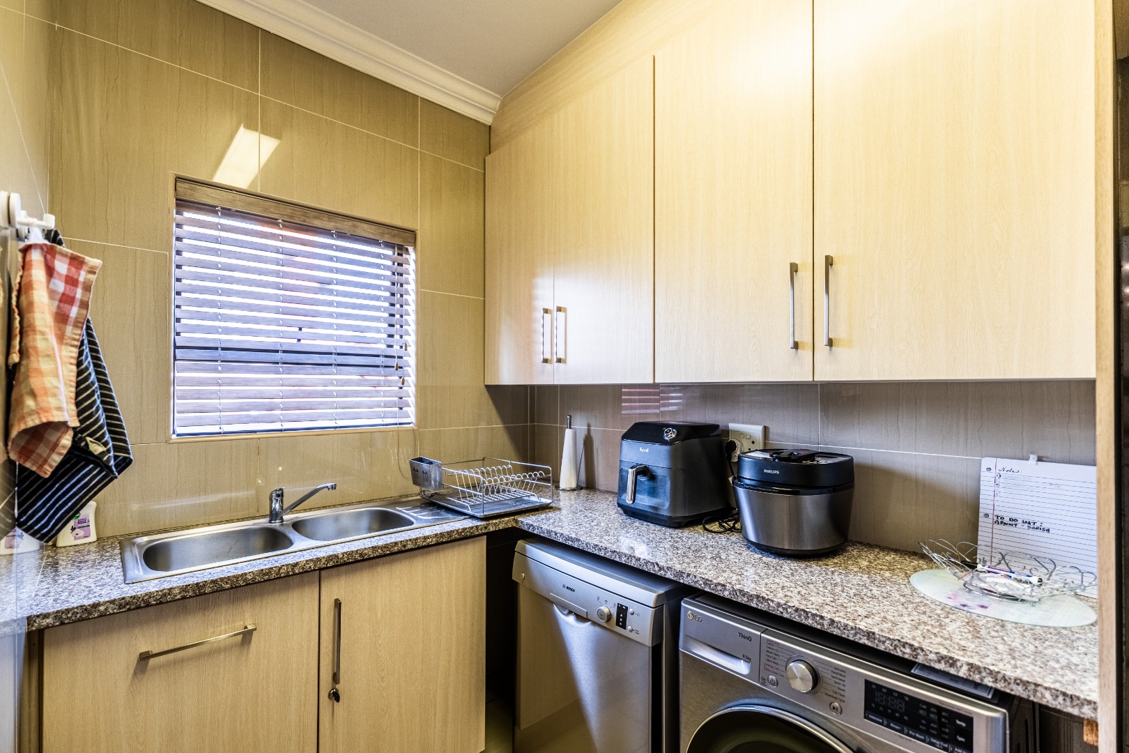 The modern kitchen is a highlight, featuring light cabinetry, gleaming granite countertops, a stylish mosaic tiled backsplash, and a breakfast bar. Equipped with a built-in oven, gas hob, stainless steel extractor, and a wine rack, it caters to all culinary needs. Upstairs, three comfortable bedrooms include a luxurious en-suite master, alongside 2.5 well-appointed bathrooms, including a guest toilet. Bedrooms offer modern finishes, air conditioning, and ample natural light. Outside, the private garden provides a spacious green retreat, perfect for family activities. A patio with a built-in braai extends the living space outdoors, ideal for entertaining. This pet-friendly home ensures a balanced indoor-outdoor lifestyle.