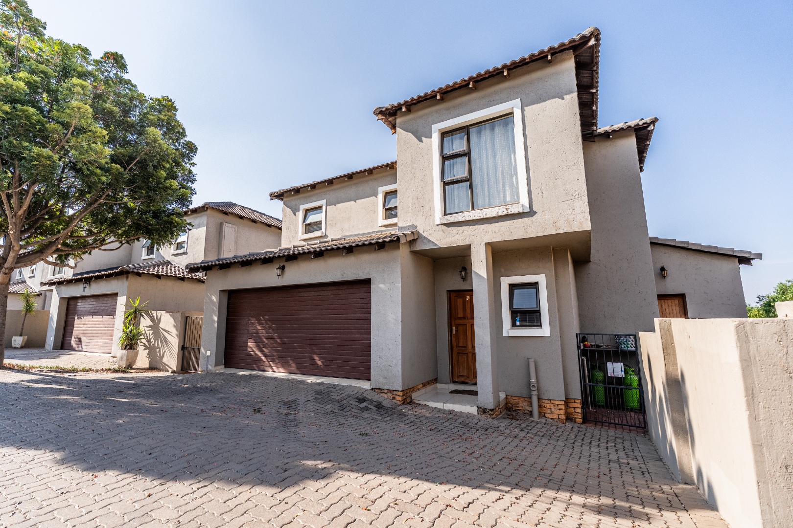 Key Features include: 3 Bedrooms, 2.5 Bathrooms (1 En-suite), Open-plan Living, Dining, and Family TV Room, Modern Kitchen with Granite Countertops and Gas Hob, Double Garage and Paved Parking, Private Garden with Patio and Built-in Braai, Security Estate with 24-Hour Security, 4 Solar Panels, Solar Geyser, and Battery Inverter 5 KVA and 5 KVA battery, Fibre Ready and also Pet-Friendly.