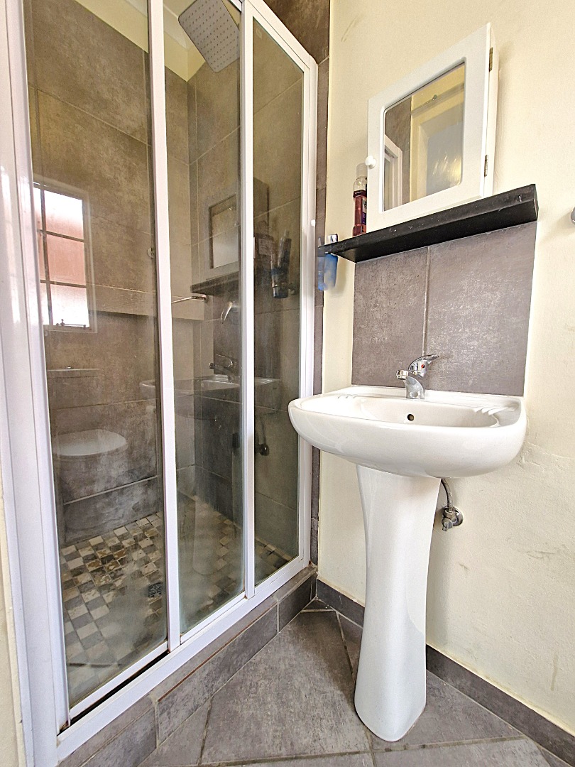 The main bedroom includes a well-appointed en-suite bathroom, complemented by a separate guest bathroom serving the second bedroom and visitors. Additional conveniences include two shaded parking bays, fibre readiness for fast internet, and pre-paid electricity for controlled, predictable billing.