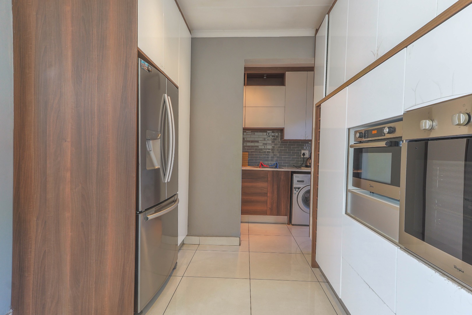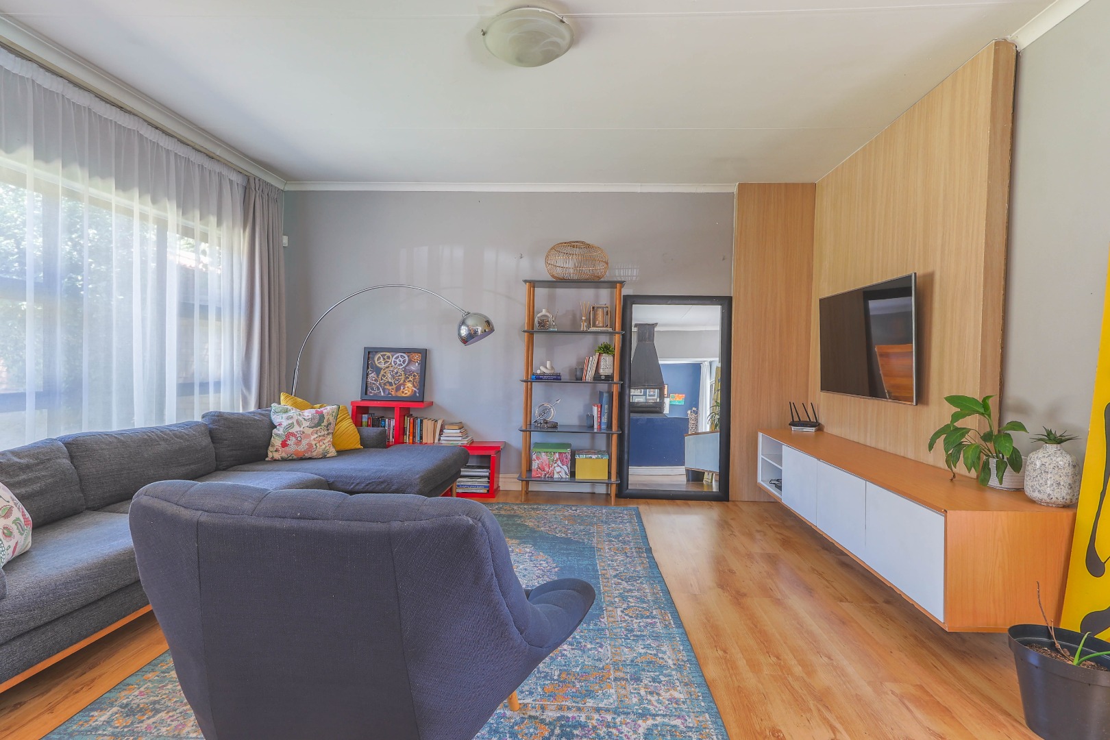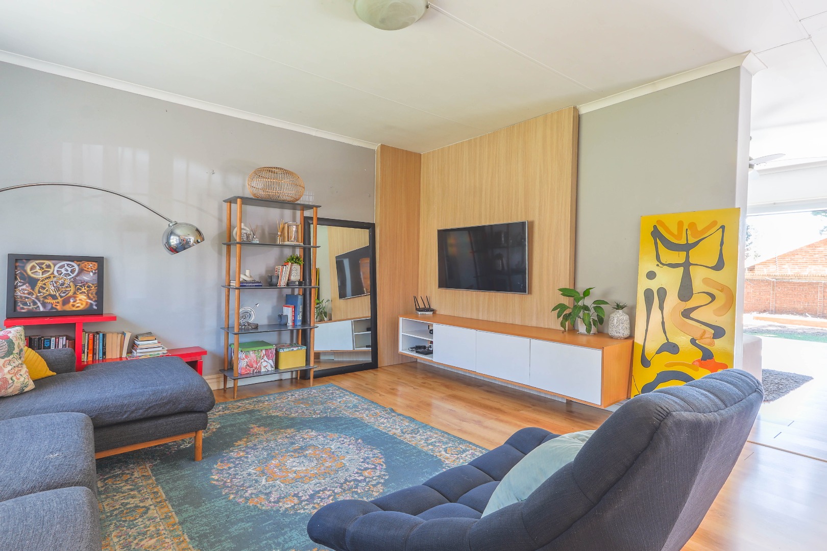 The interior boasts a thoughtful layout with a strong emphasis on natural light and seamless flow. The main living areas feature elegant laminate flooring, creating a warm and contemporary ambiance. Two distinct lounges provide ample space for family activities and quiet retreats, while the dedicated dining room is perfect for shared meals. One living area showcases a stylish accent wall, complemented by a modern built in floating TV stand, creating an ideal spot for unwinding. Another versatile living space offers excellent indoor-outdoor connectivity through large aluminum stack doors, leading directly to the garden and featuring a dedicated workspace, perfect for remote work or study.