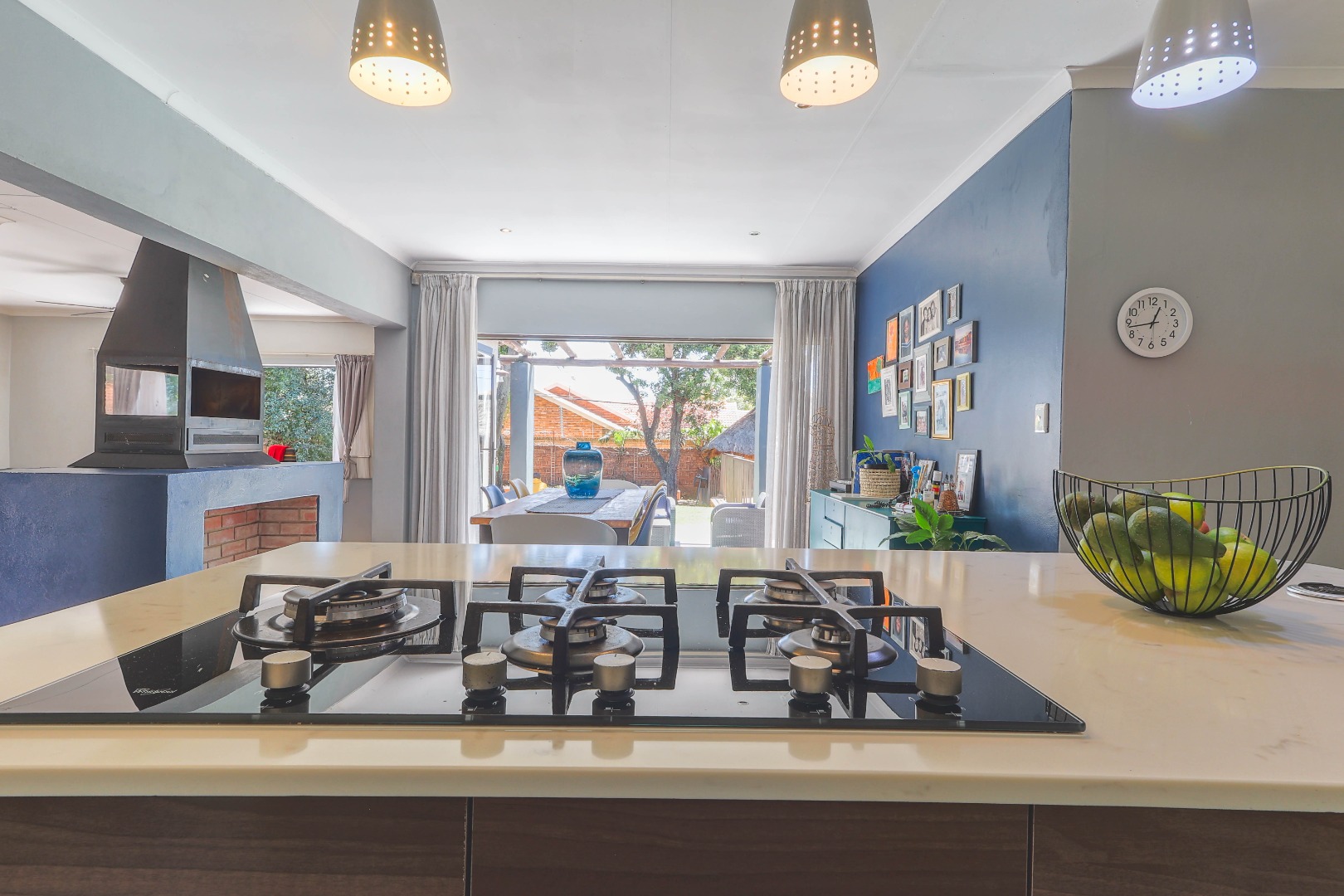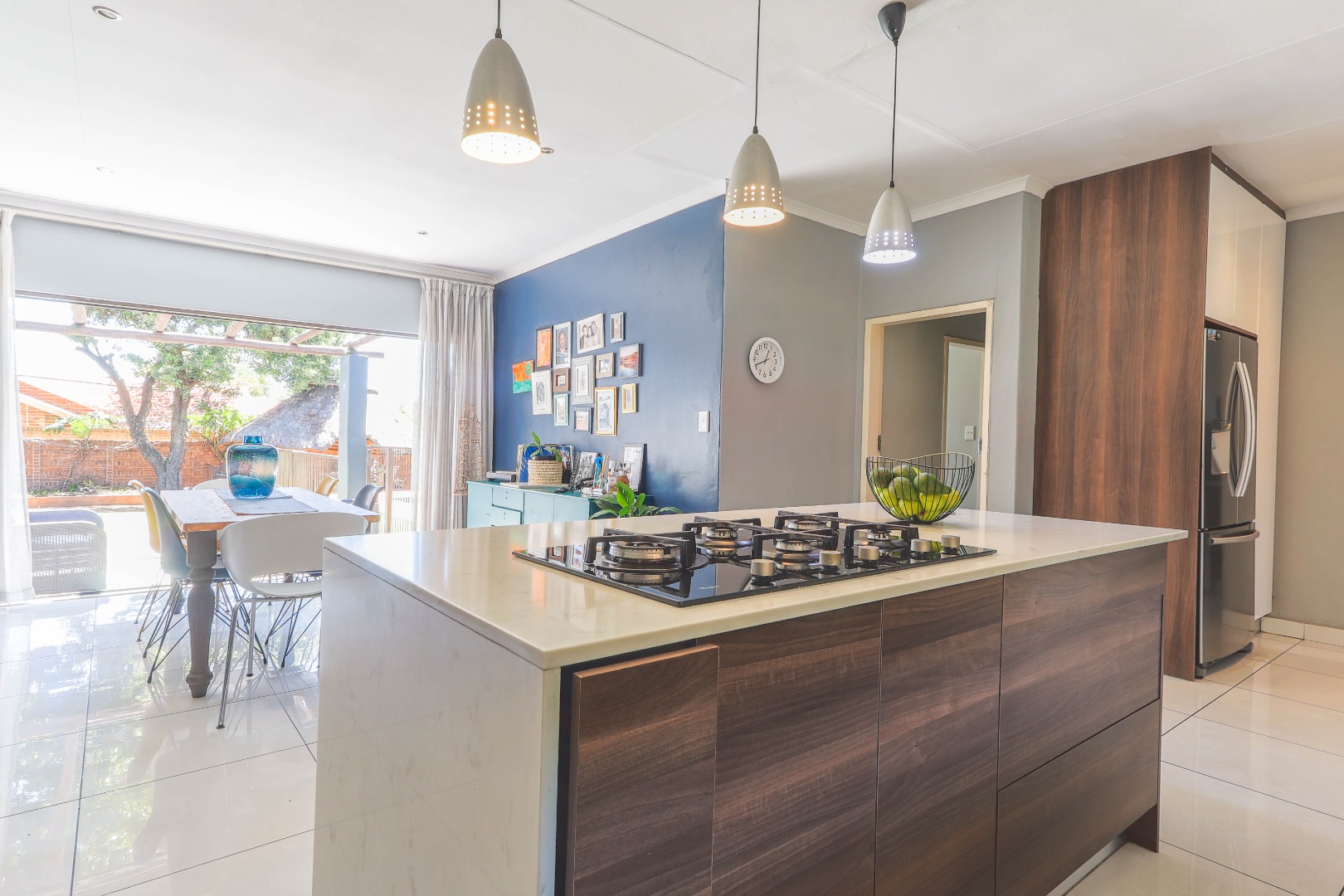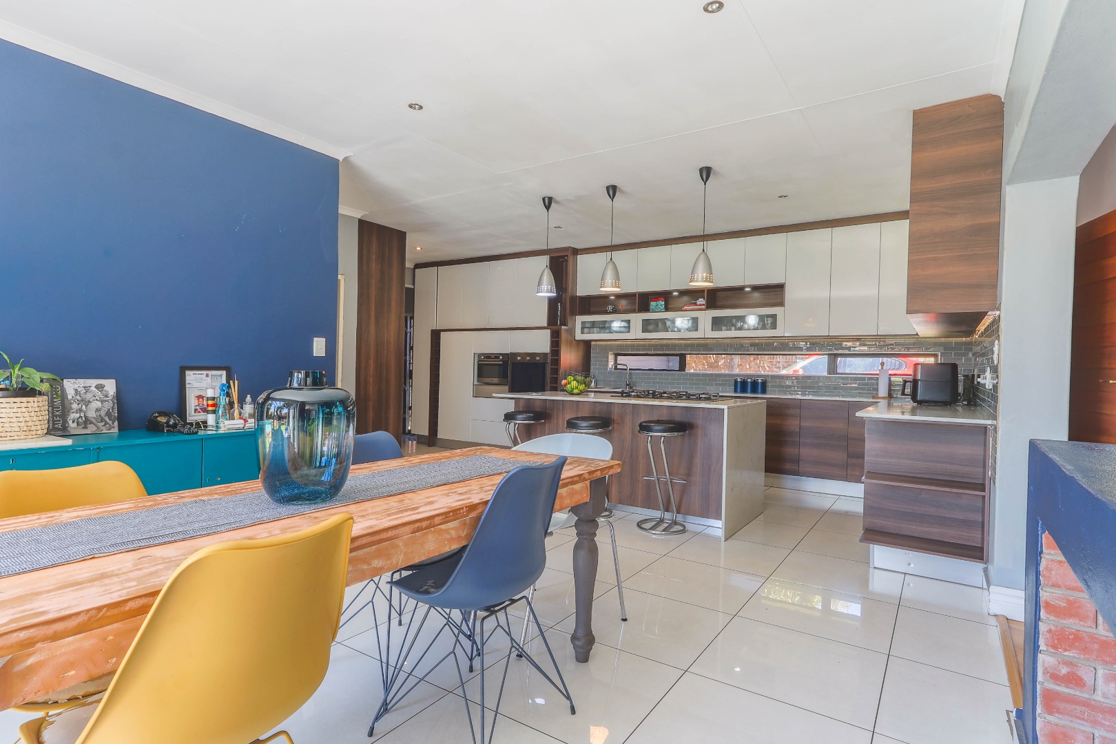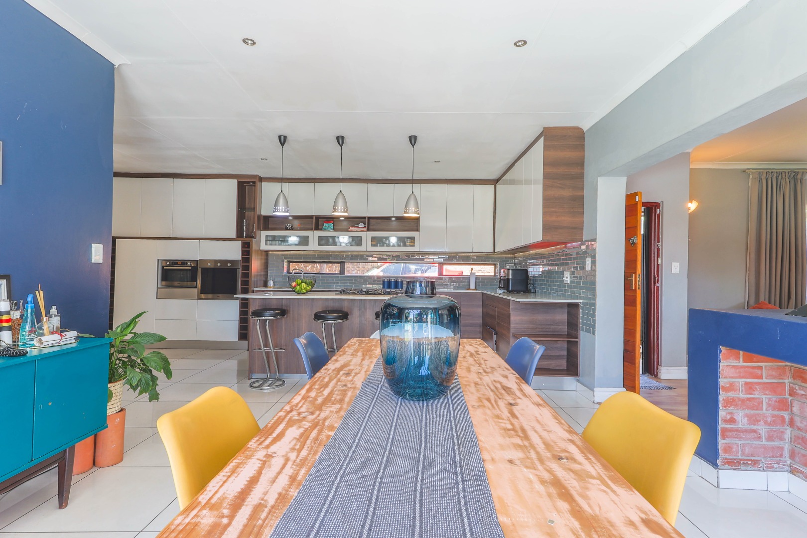 Central to the home's appeal is the newly renovated modern, open-plan kitchen, designed for both functionality and style. It features high-gloss white and wood-grain cabinetry, integrated appliances including a practical kitchen island with a breakfast bar. A chic subway tile backsplash adds a touch of sophistication, while recessed and pendant lighting illuminates the space beautifully. The kitchen seamlessly connects to the dining area, which is highlighted by a bold blue accent wall and pristine white tiled floors, further enhancing the bright and contemporary design. An indoor fireplace adds a unique South African touch, perfect for year-round entertaining.