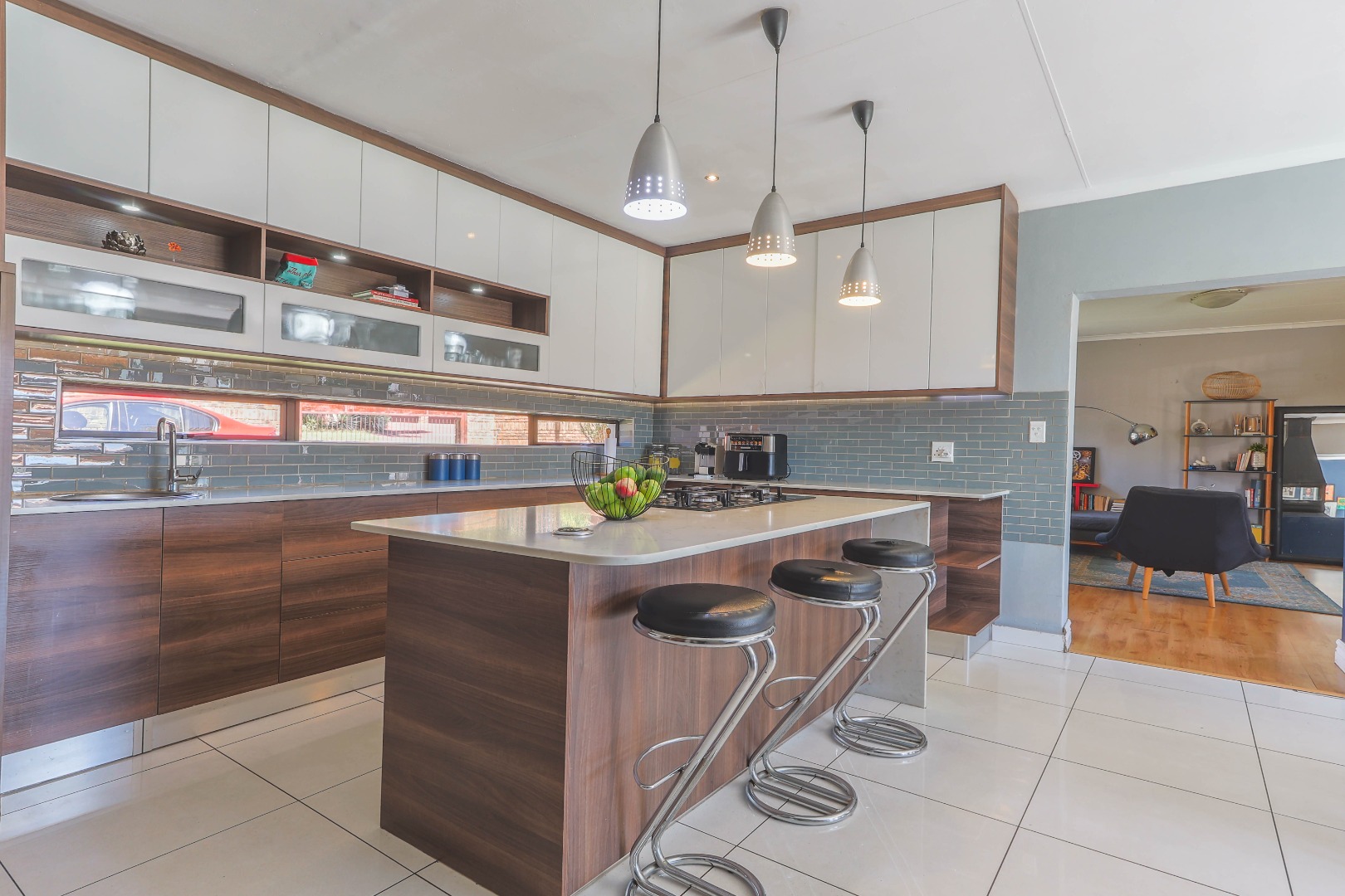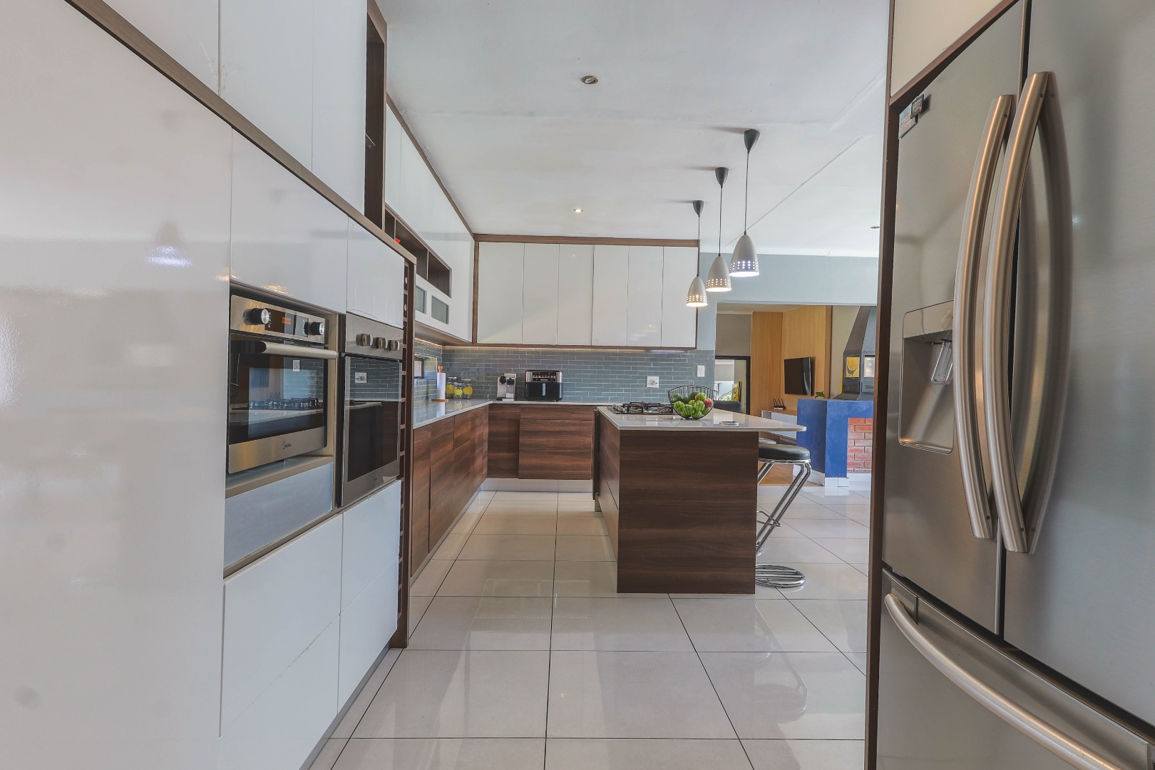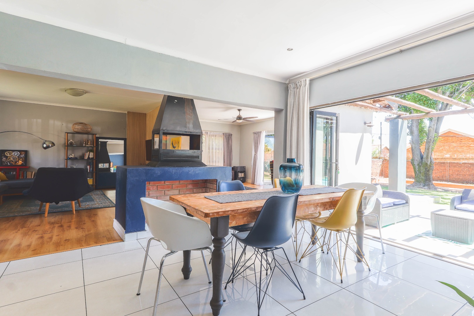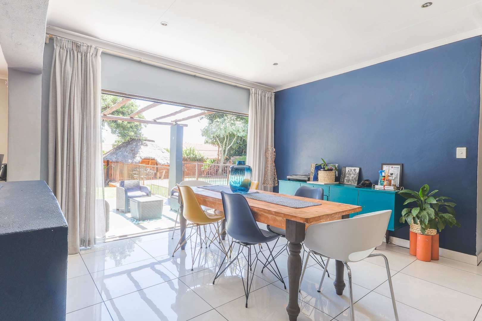 Central to the home's appeal is the newly renovated modern, open-plan kitchen, designed for both functionality and style. It features high-gloss white and wood-grain cabinetry, integrated appliances including a practical kitchen island with a breakfast bar. A chic subway tile backsplash adds a touch of sophistication, while recessed and pendant lighting illuminates the space beautifully. The kitchen seamlessly connects to the dining area, which is highlighted by a bold blue accent wall and pristine white tiled floors, further enhancing the bright and contemporary design. An indoor fireplace adds a unique South African touch, perfect for year-round entertaining.