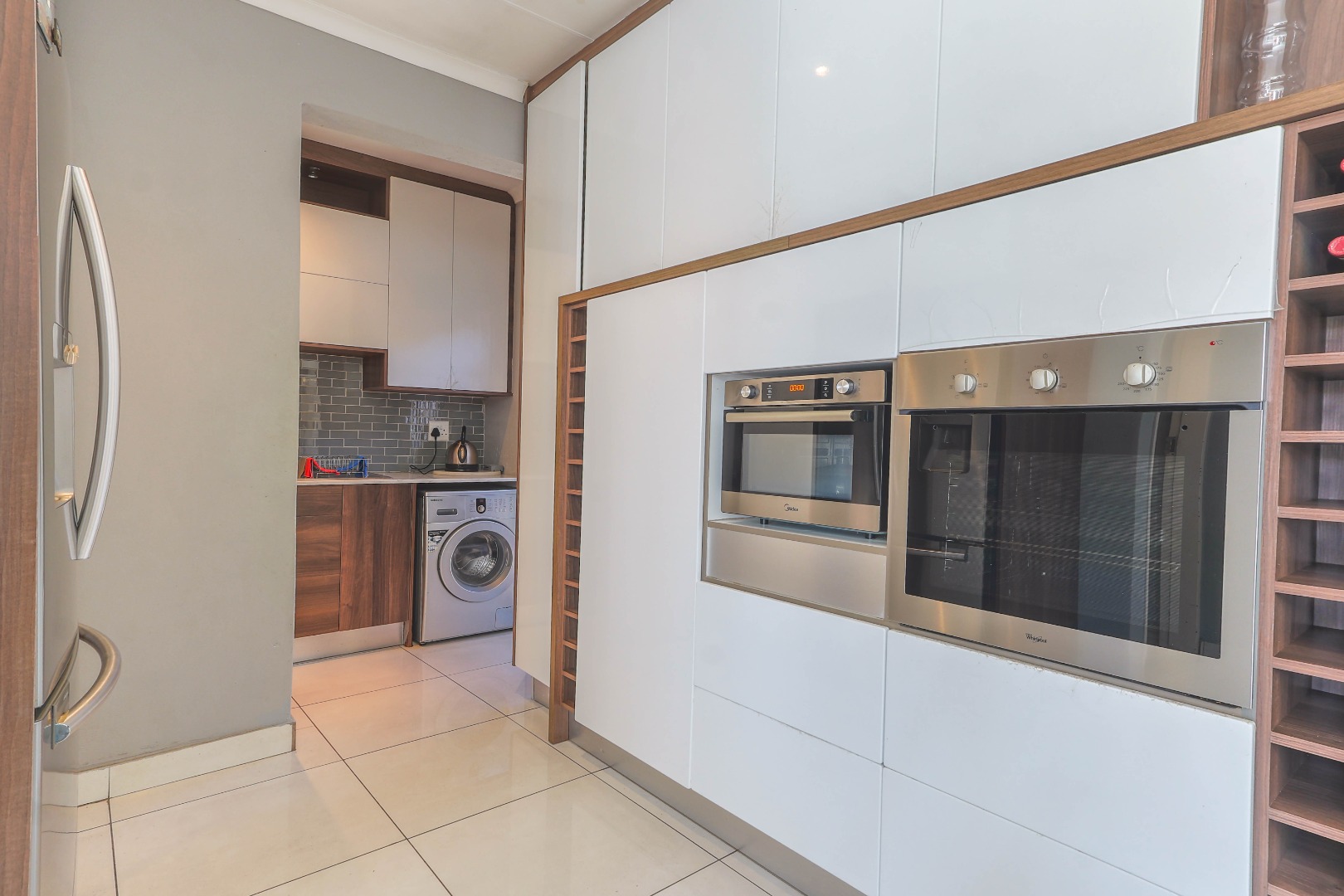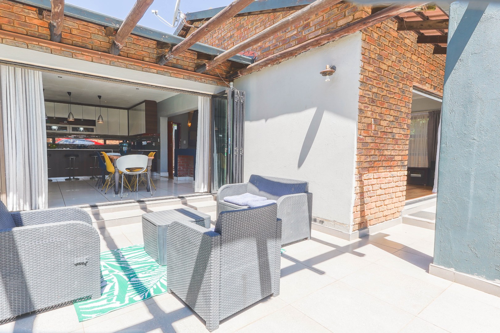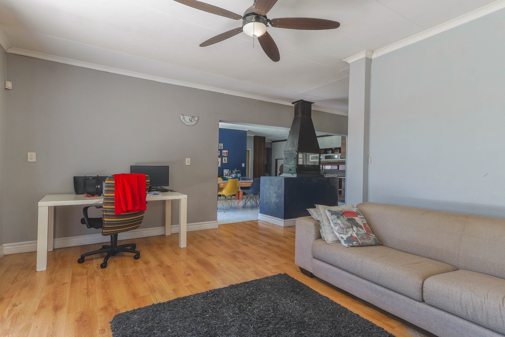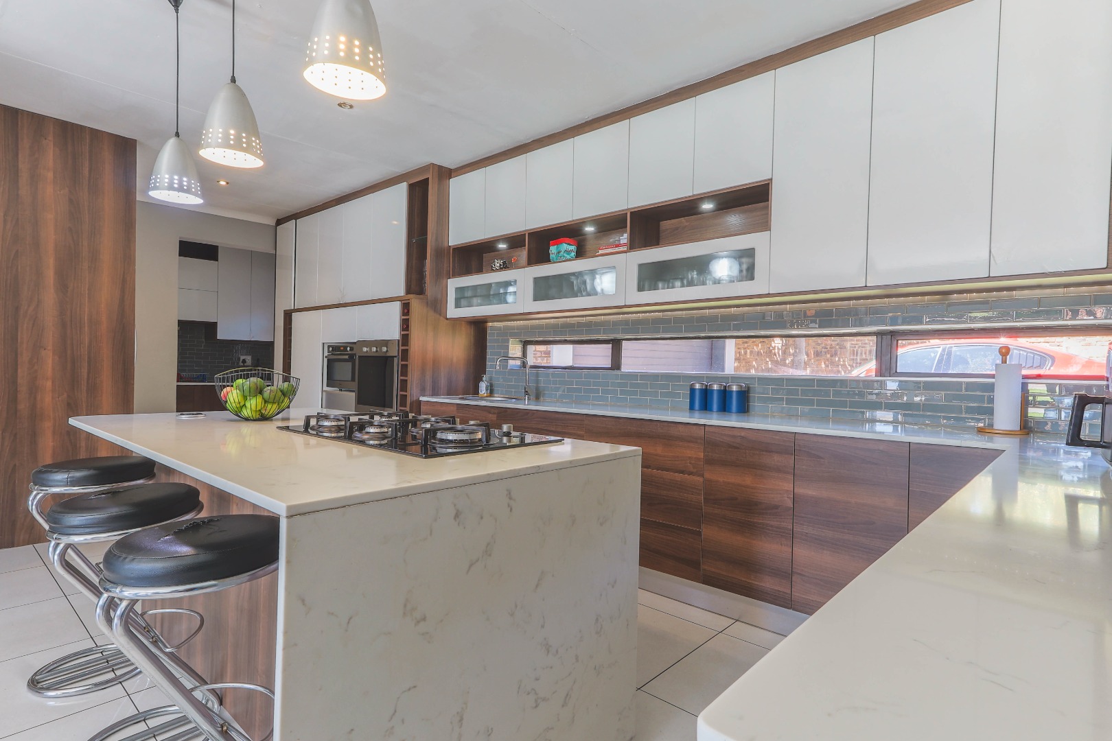 Central to the home's appeal is the newly renovated modern, open-plan kitchen, designed for both functionality and style. It features high-gloss white and wood-grain cabinetry, integrated appliances including a practical kitchen island with a breakfast bar. A chic subway tile backsplash adds a touch of sophistication, while recessed and pendant lighting illuminates the space beautifully. The kitchen seamlessly connects to the dining area, which is highlighted by a bold blue accent wall and pristine white tiled floors, further enhancing the bright and contemporary design. An indoor fireplace adds a unique South African touch, perfect for year-round entertaining.