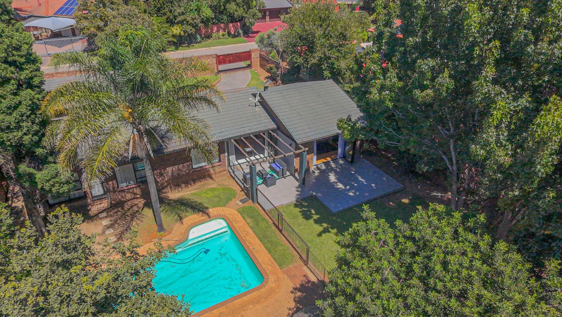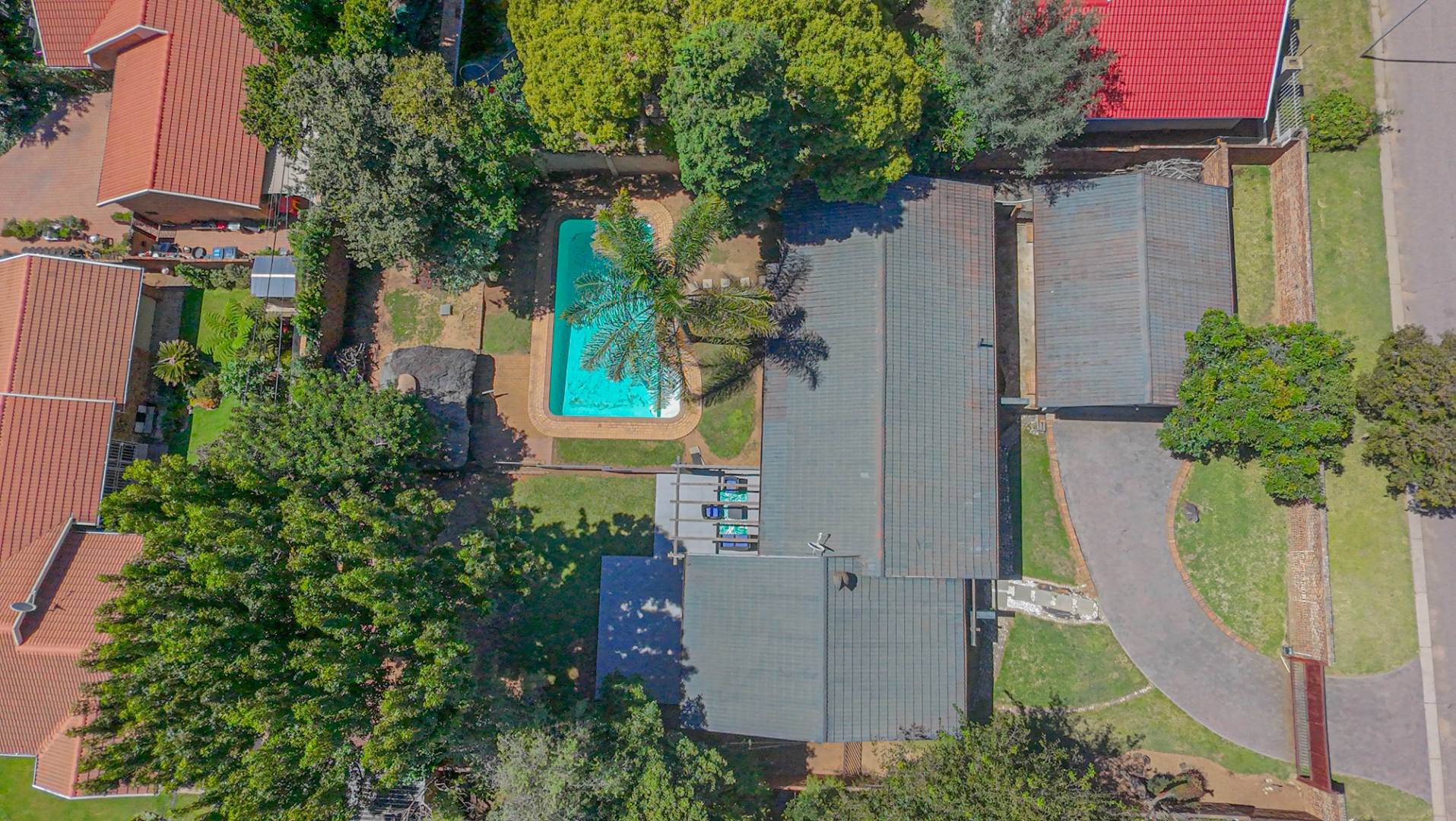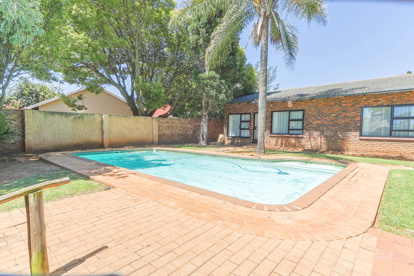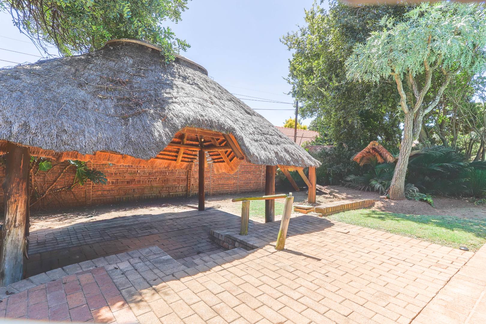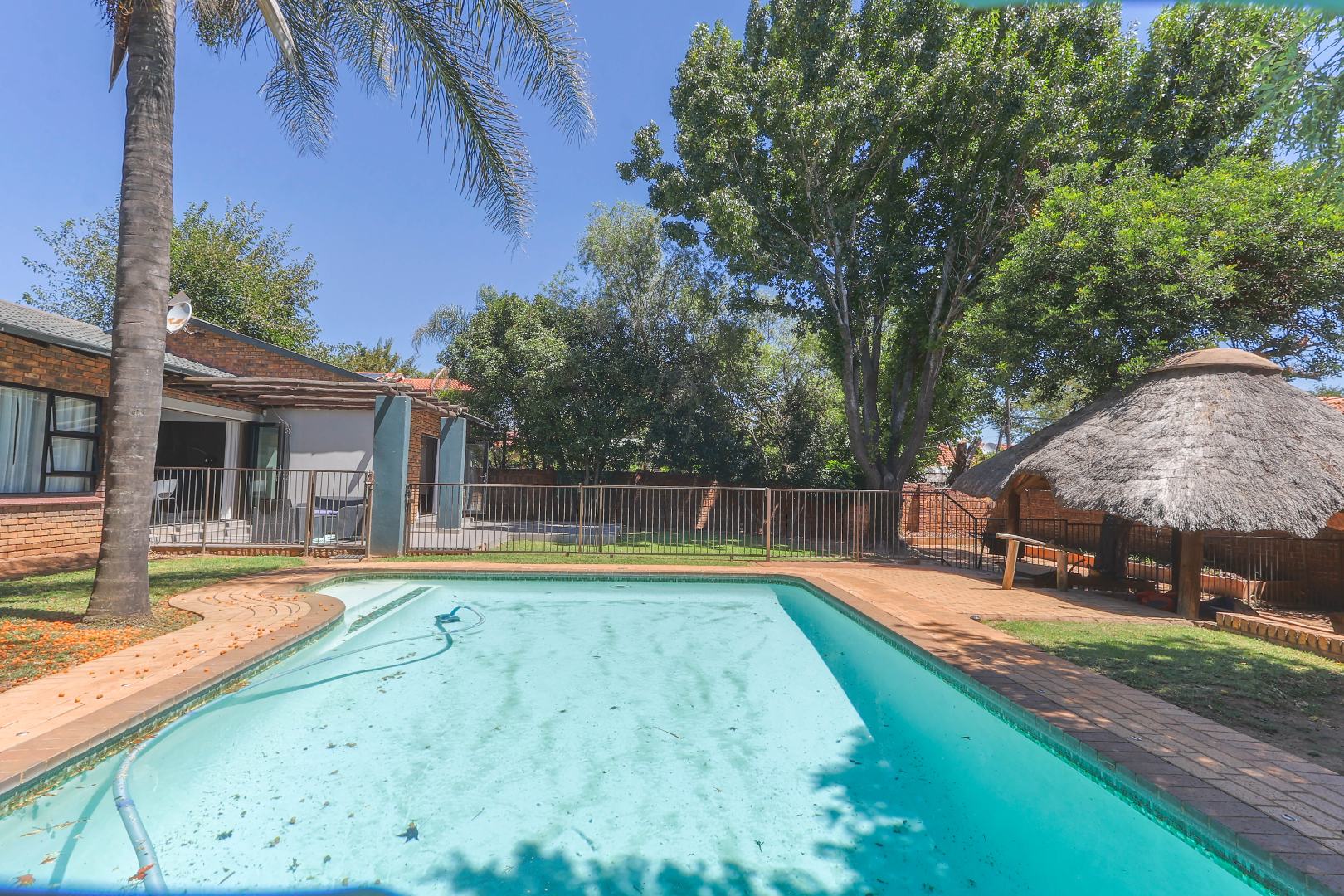 Step outside to a private oasis designed for outdoor living. The property features a sparkling private swimming pool, safely fenced for peace of mind, surrounded by ample outdoor space and established trees that provide both privacy and shade. Multiple patio areas, including a covered section with modern furniture and an additional uncovered space, offer versatile options for al fresco dining and relaxation. A spacious private garden hosts a charming thatched Lapa/gazebo, creating an ideal setting for entertaining guests or enjoying quiet moments outdoors. Practical amenities include two garages and two additional parking spaces, ensuring convenience for residents and visitors alike.