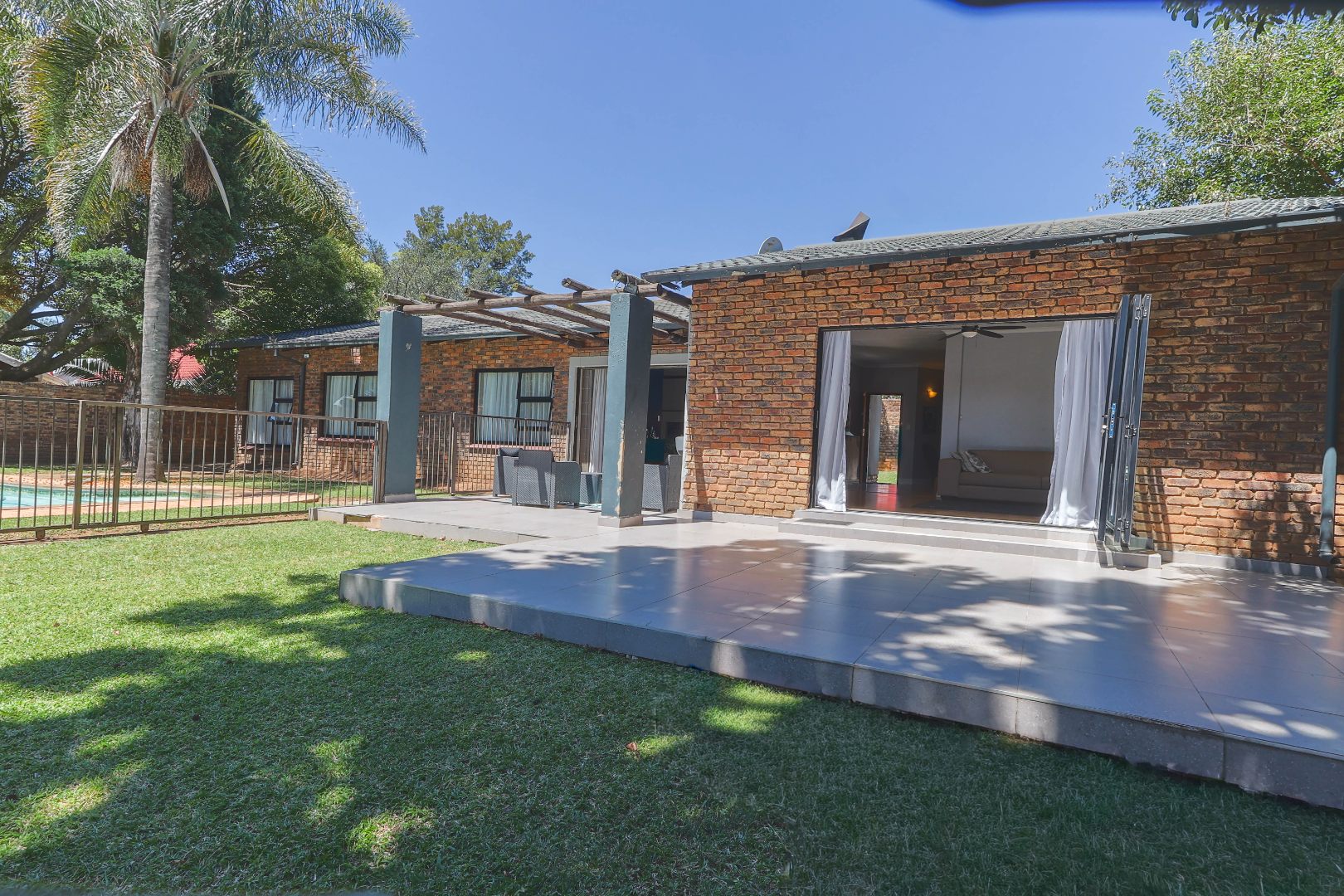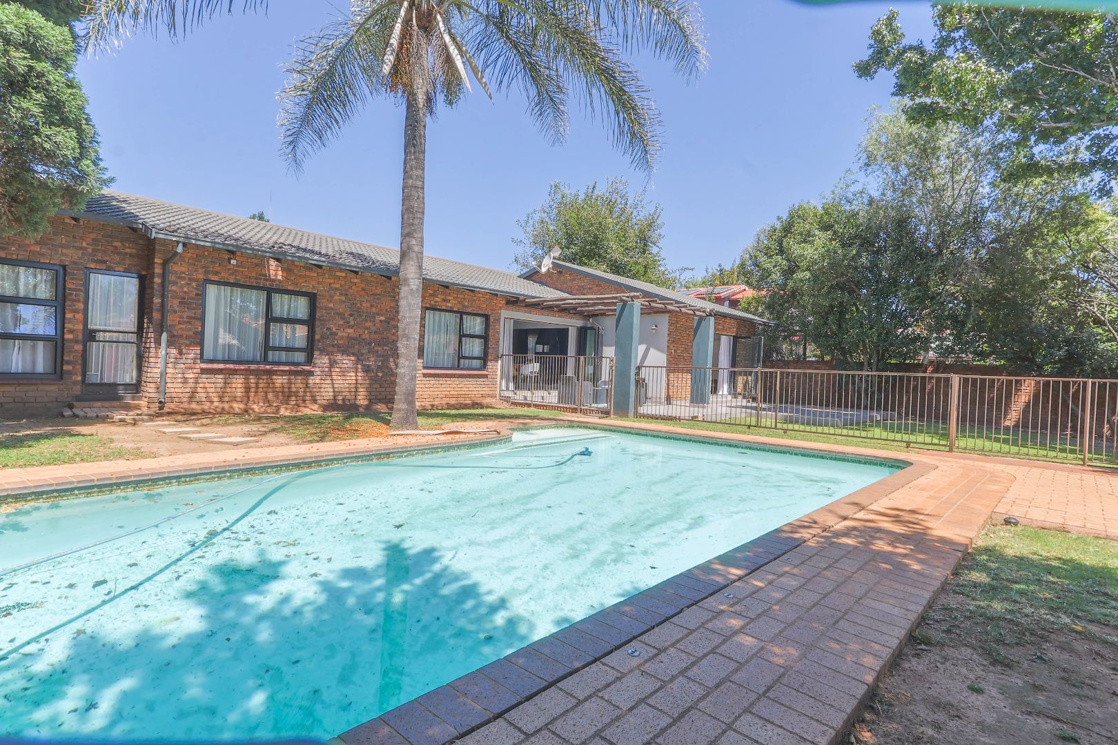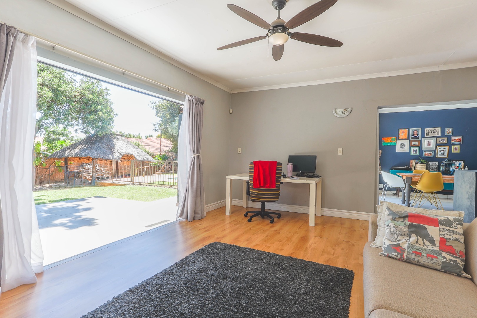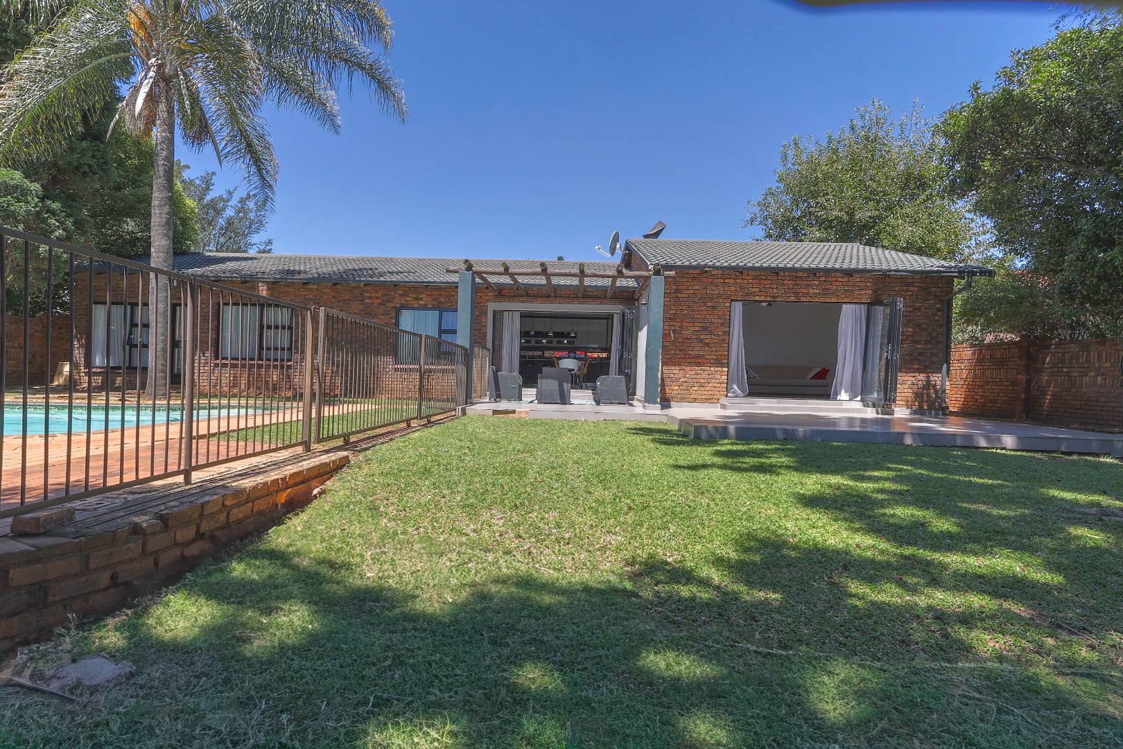 Step outside to a private oasis designed for outdoor living. The property features a sparkling private swimming pool, safely fenced for peace of mind, surrounded by ample outdoor space and established trees that provide both privacy and shade. Multiple patio areas, including a covered section with modern furniture and an additional uncovered space, offer versatile options for al fresco dining and relaxation. A spacious private garden hosts a charming thatched Lapa/gazebo, creating an ideal setting for entertaining guests or enjoying quiet moments outdoors. Practical amenities include two garages and two additional parking spaces, ensuring convenience for residents and visitors alike.