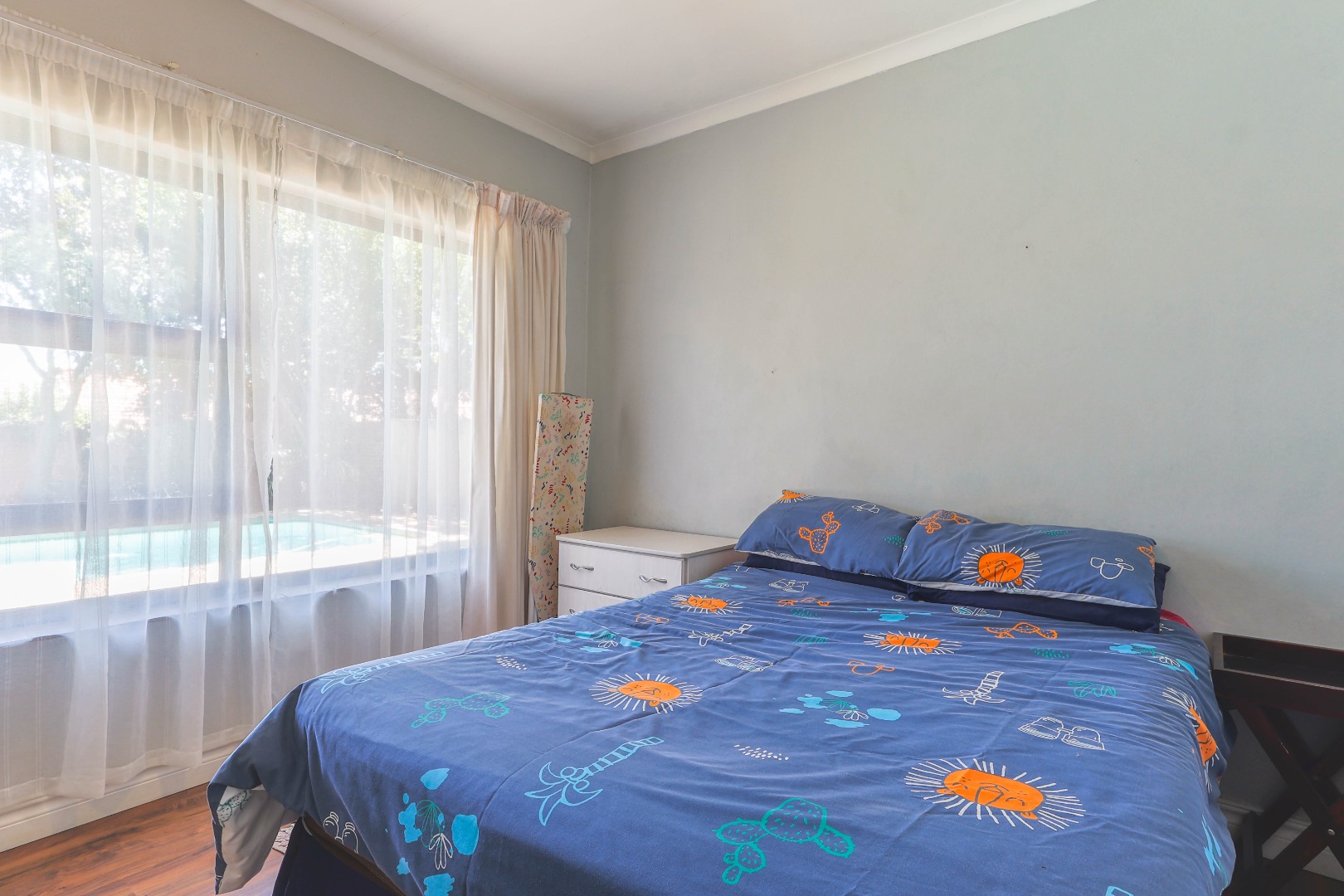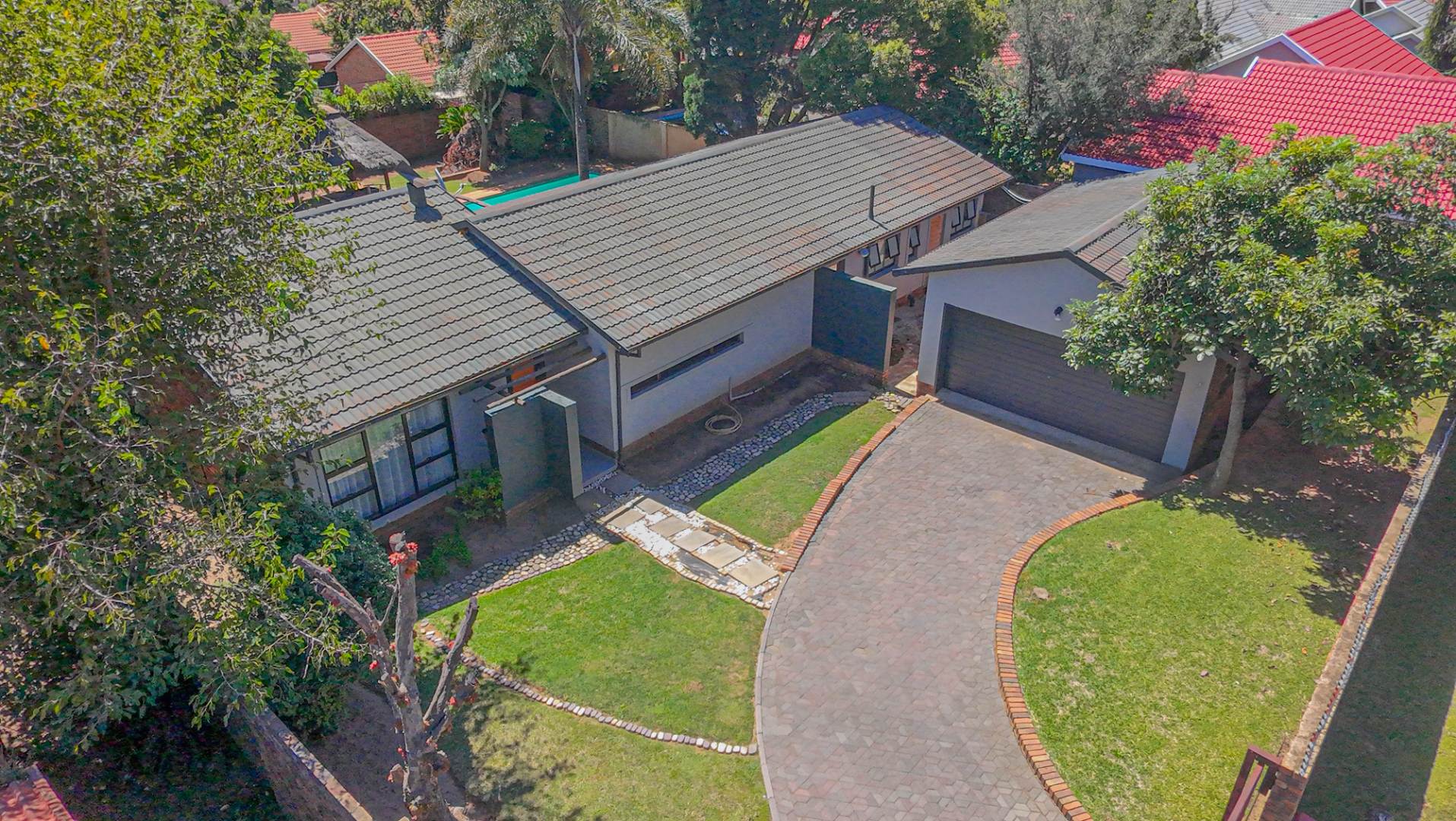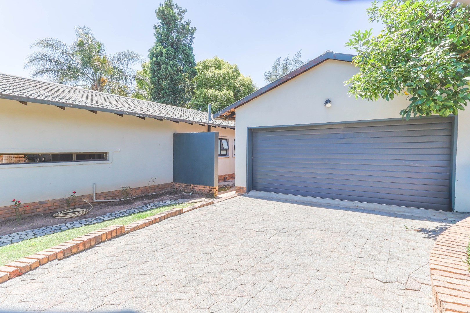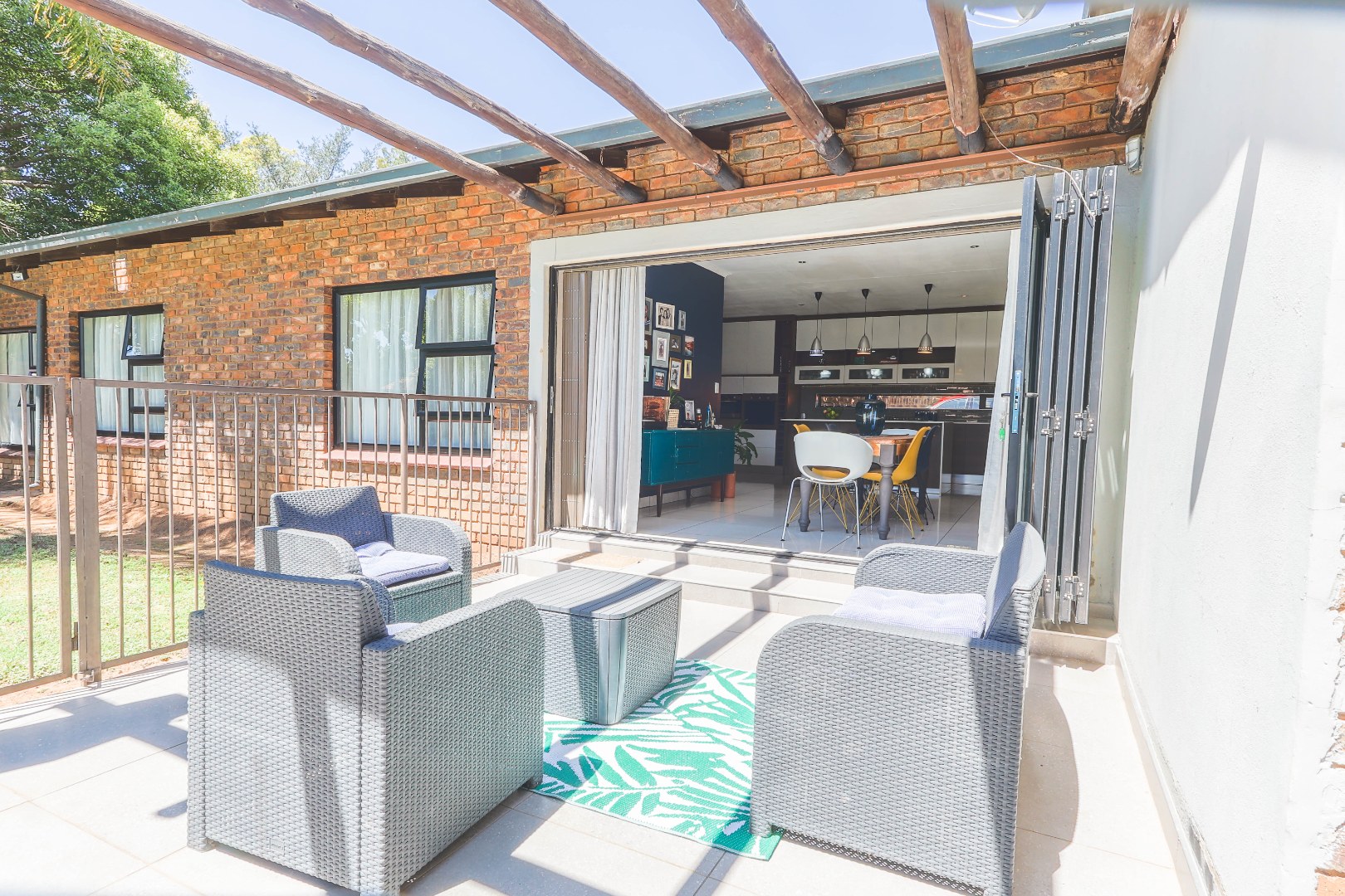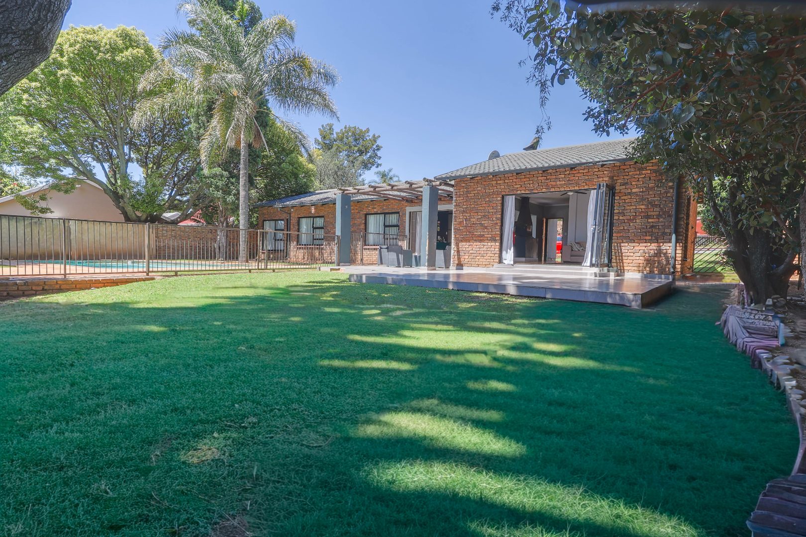 Step outside to a private oasis designed for outdoor living. The property features a sparkling private swimming pool, safely fenced for peace of mind, surrounded by ample outdoor space and established trees that provide both privacy and shade. Multiple patio areas, including a covered section with modern furniture and an additional uncovered space, offer versatile options for al fresco dining and relaxation. A spacious private garden hosts a charming thatched Lapa/gazebo, creating an ideal setting for entertaining guests or enjoying quiet moments outdoors. Practical amenities include two garages and two additional parking spaces, ensuring convenience for residents and visitors alike.