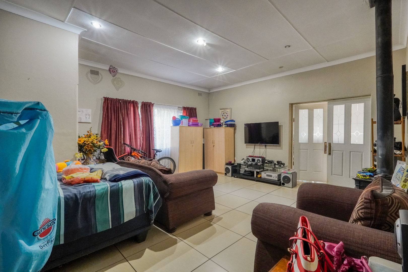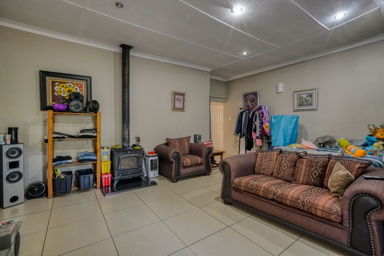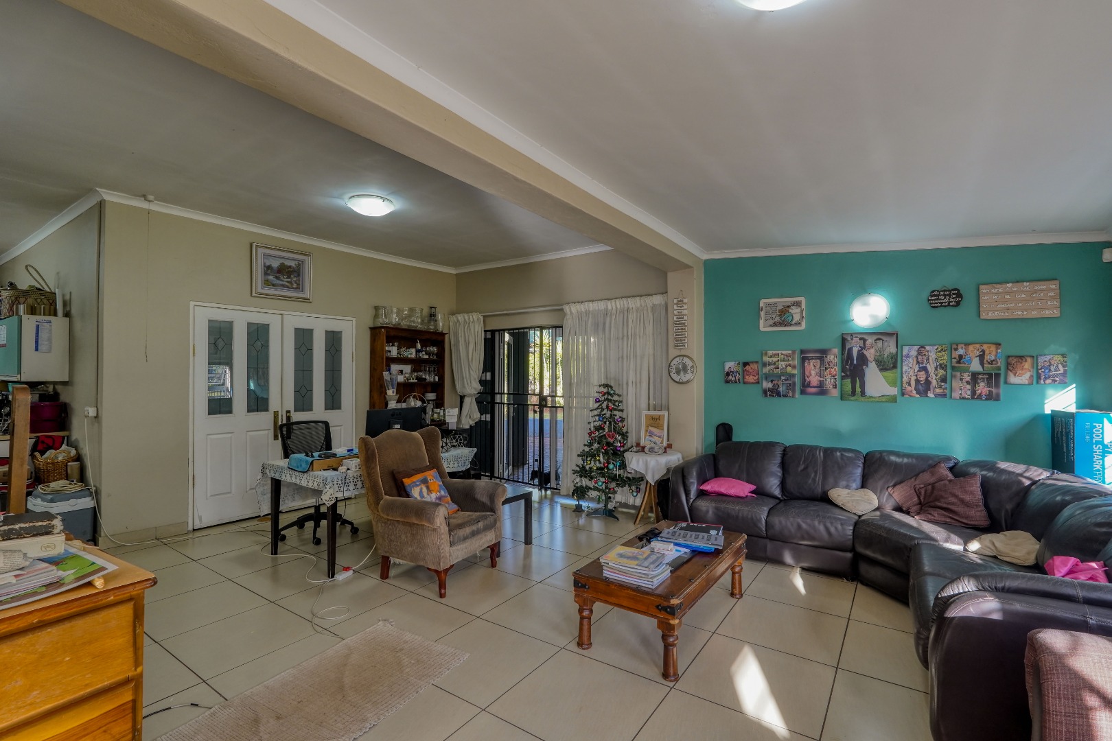 Behind wooden doors, a second lounge or TV room offers a more private setting and features its own entrance leading into the bedroom hallway. The kitchen also connects directly to this hallway, ensuring practical flow throughout the home. The master bedroom is comfortably sized with large cupboards and its own en suite bathroom. The other two bedrooms are well positioned and are served by a standalone bathroom, making the layout both functional and family friendly.