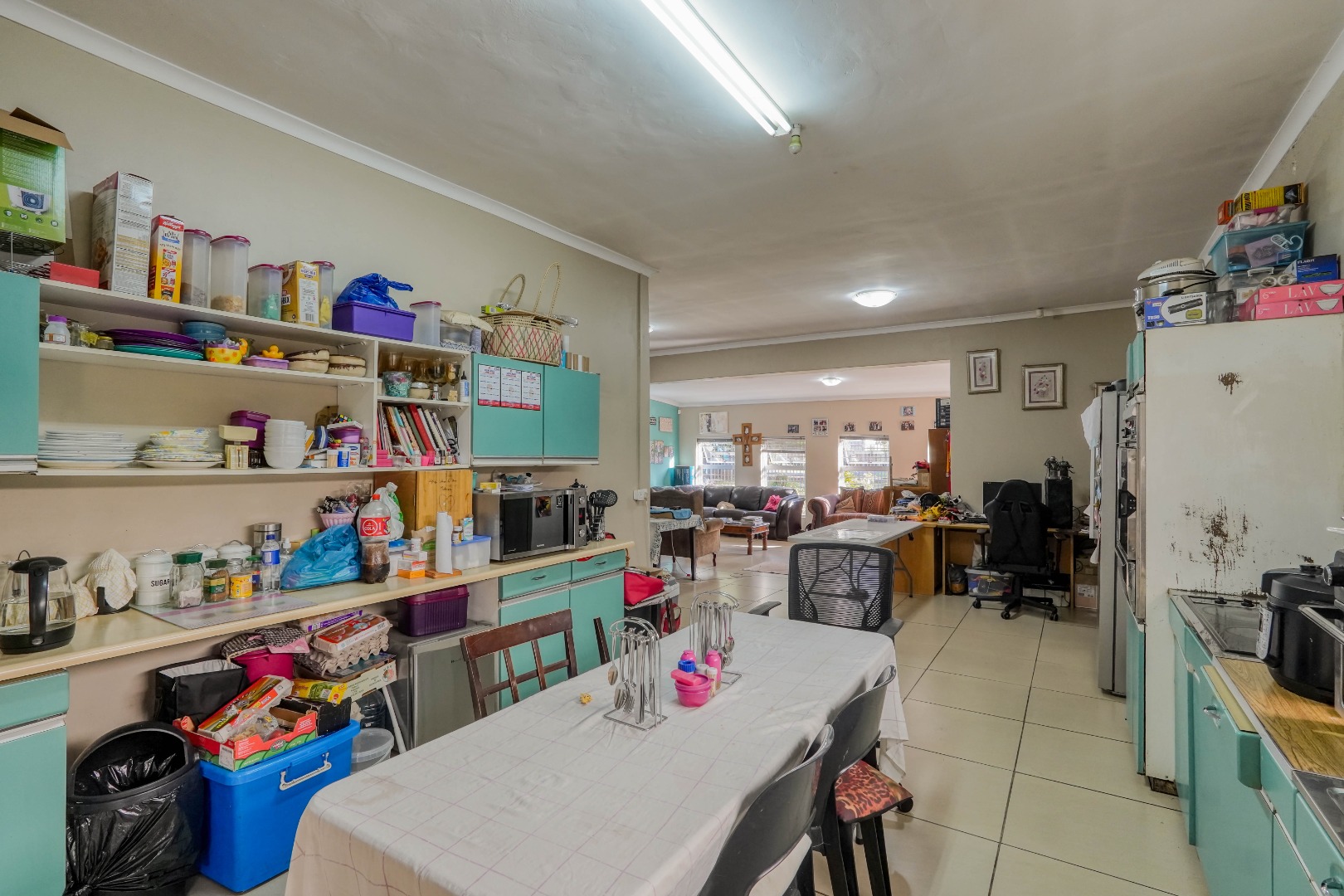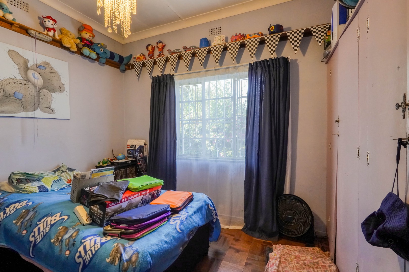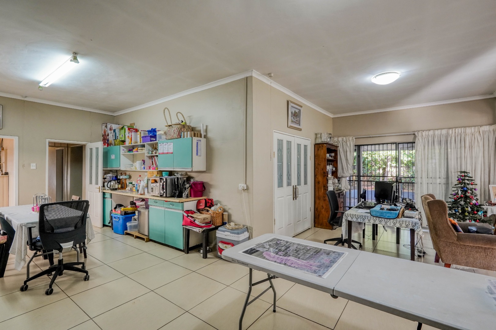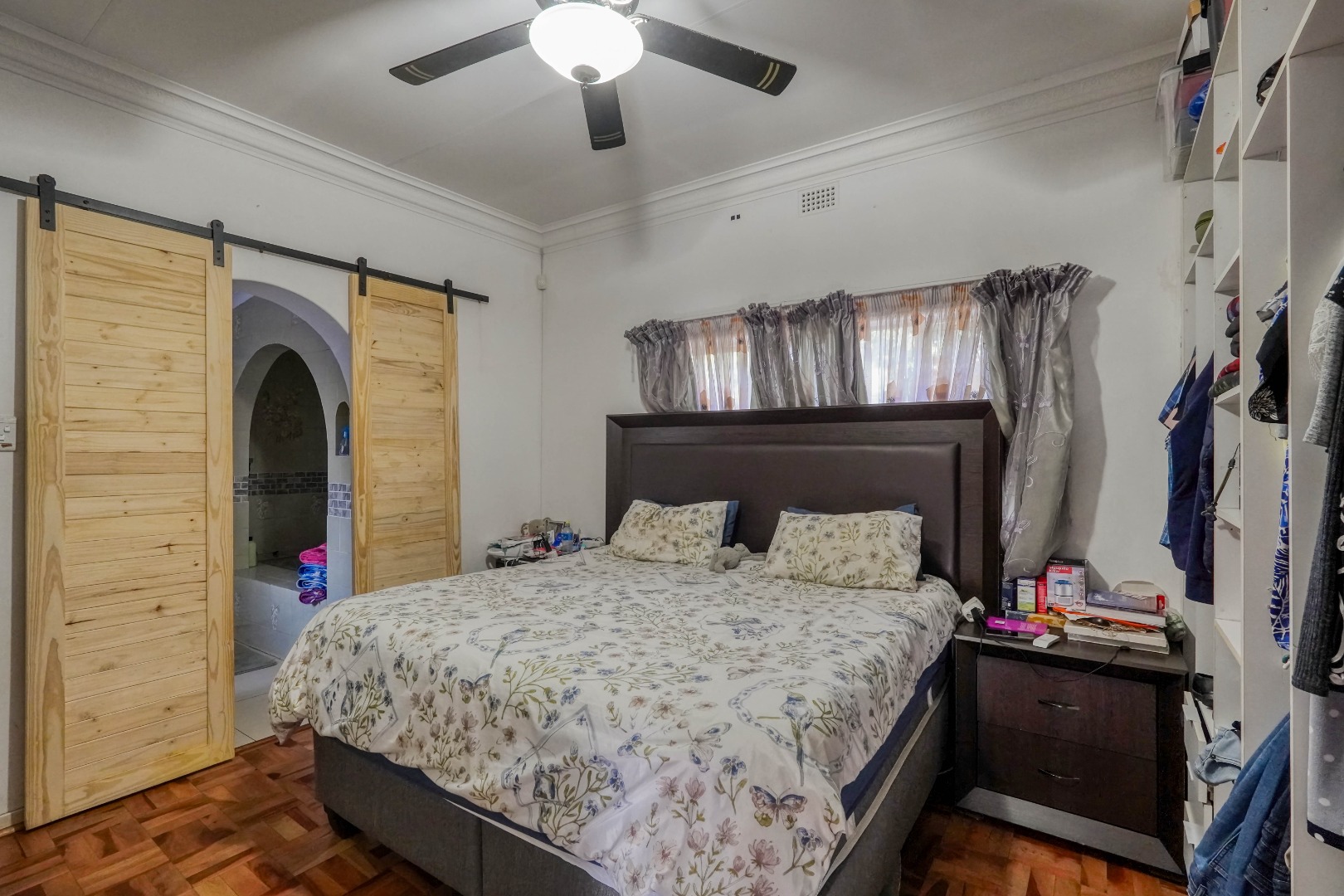 Behind wooden doors, a second lounge or TV room offers a more private setting and features its own entrance leading into the bedroom hallway. The kitchen also connects directly to this hallway, ensuring practical flow throughout the home. The master bedroom is comfortably sized with large cupboards and its own en suite bathroom. The other two bedrooms are well positioned and are served by a standalone bathroom, making the layout both functional and family friendly.