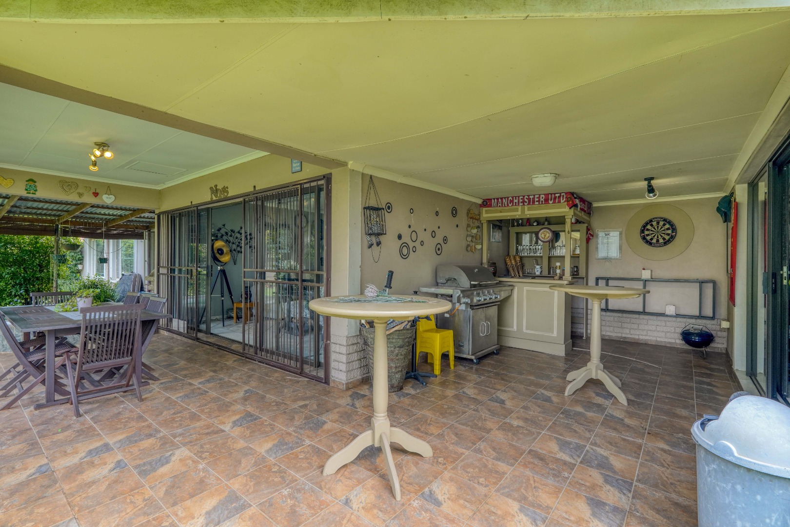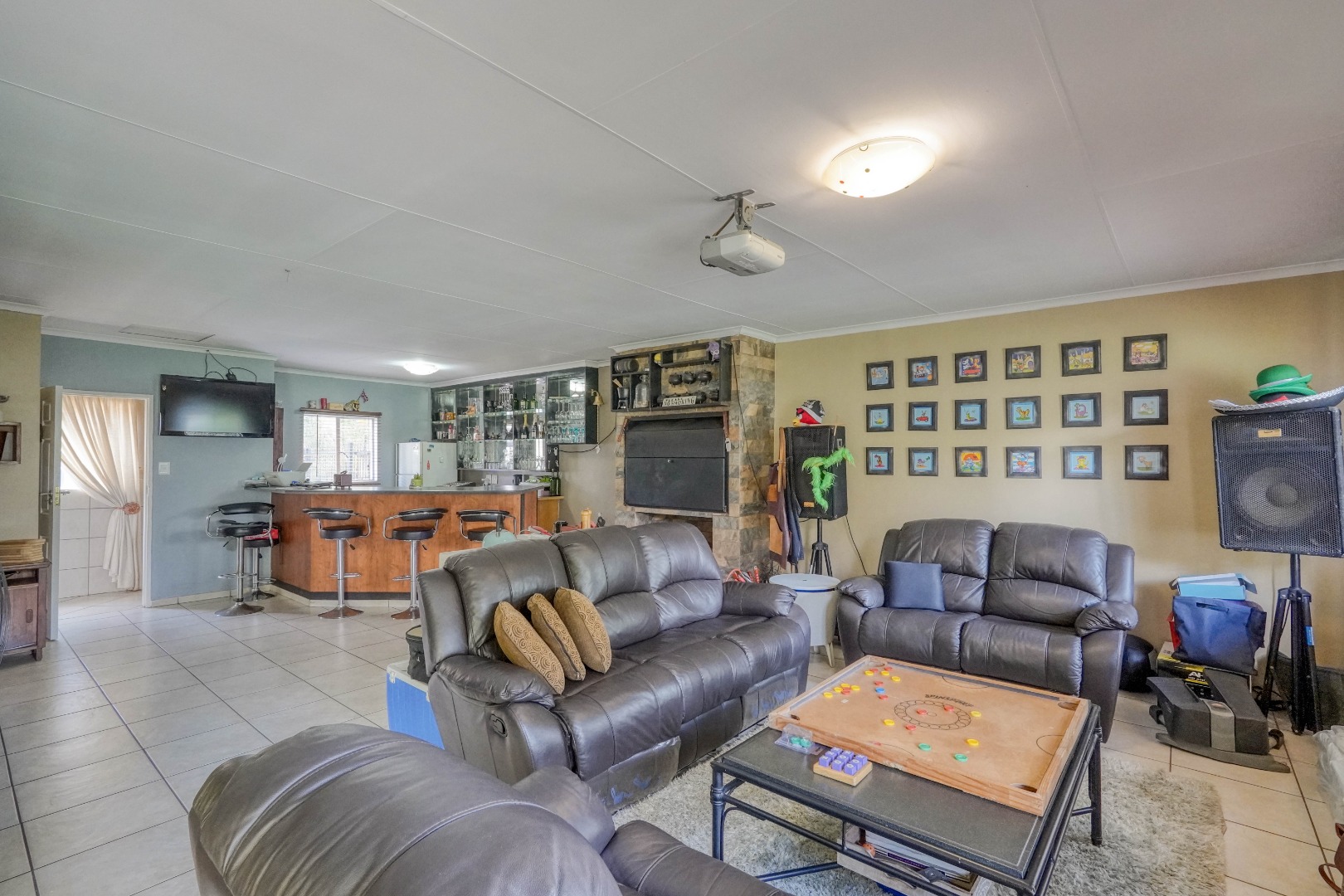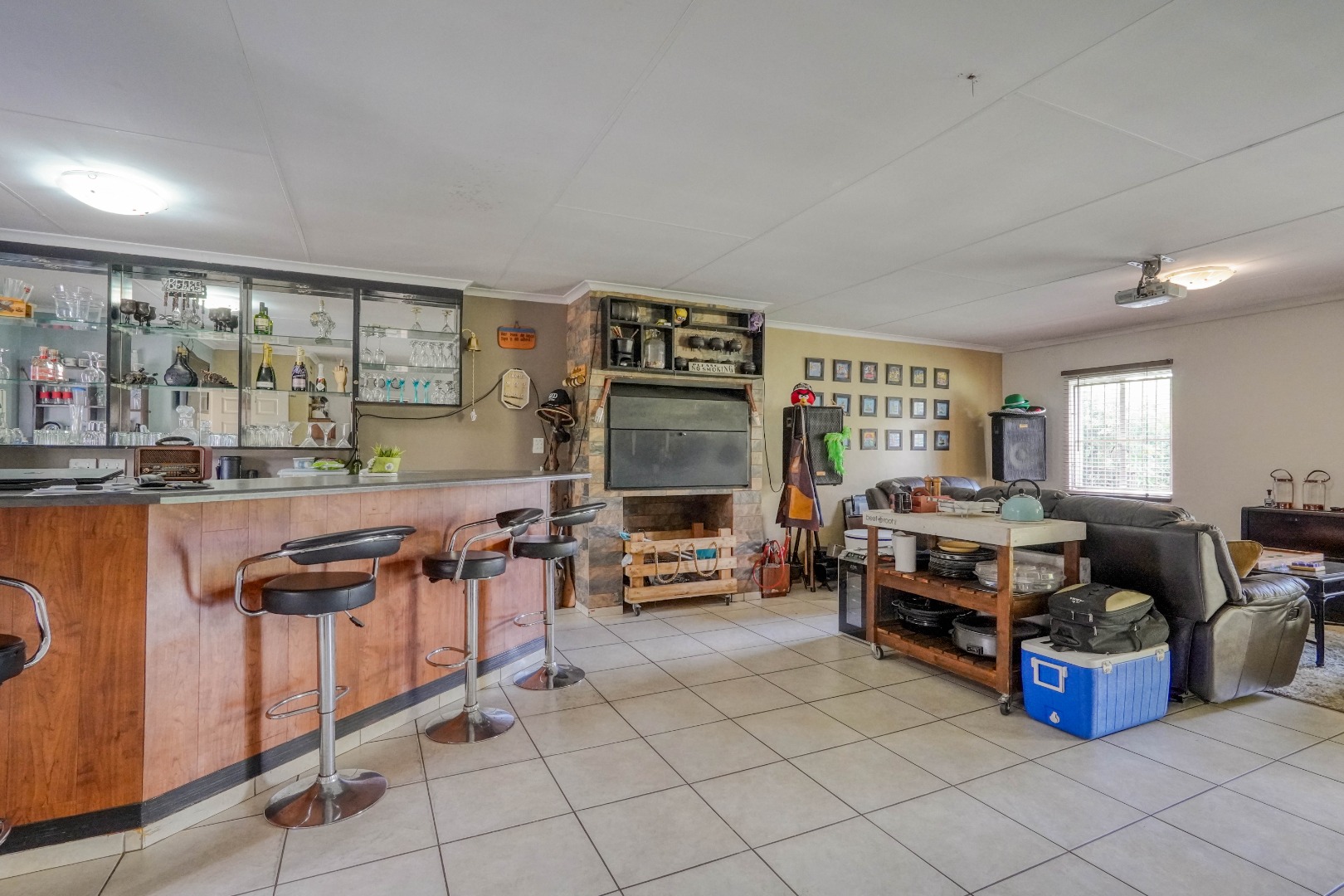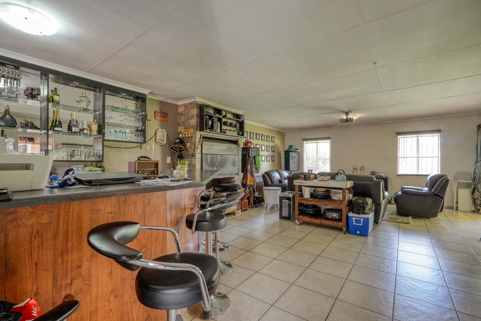 On the one side of the property, you’ll find a generous entertainment room designed for hosting. This space includes a lounge area, a built-in bar, and a braai, and also opens directly onto the patio, creating a seamless indoor-outdoor gathering zone.