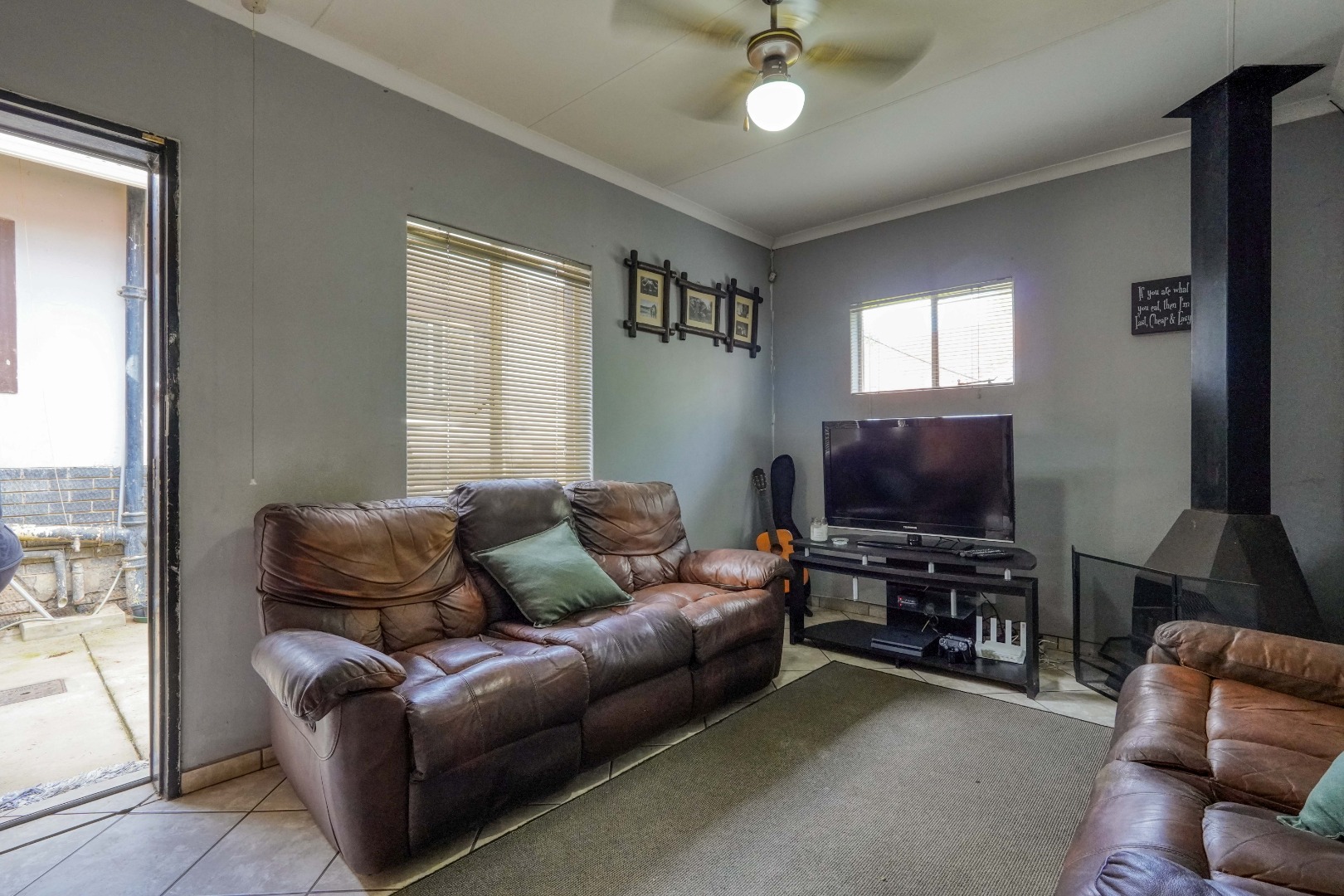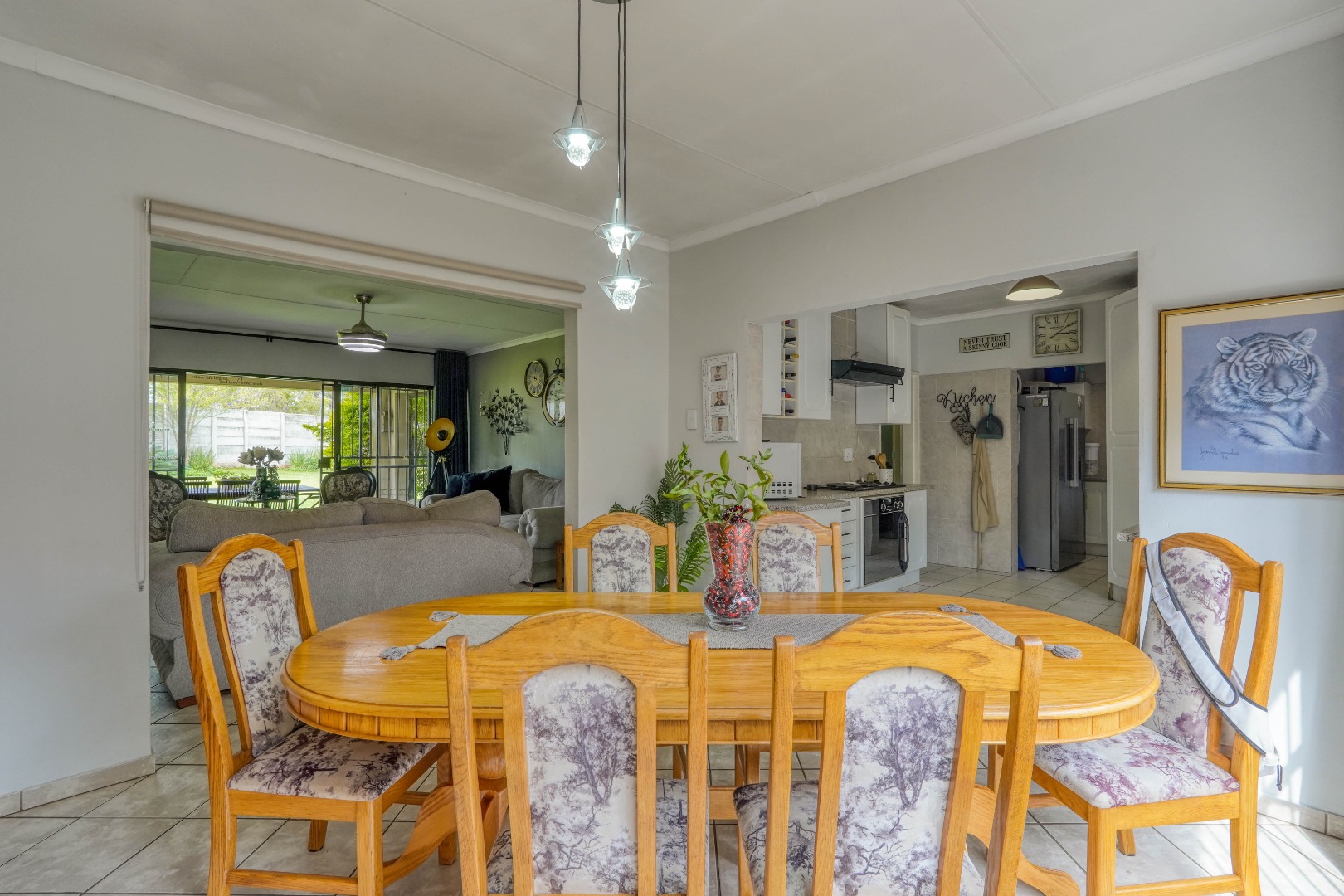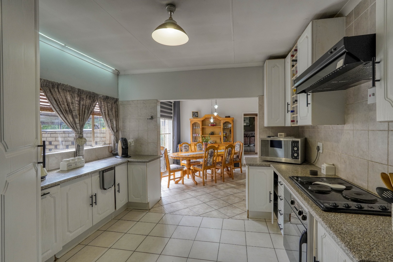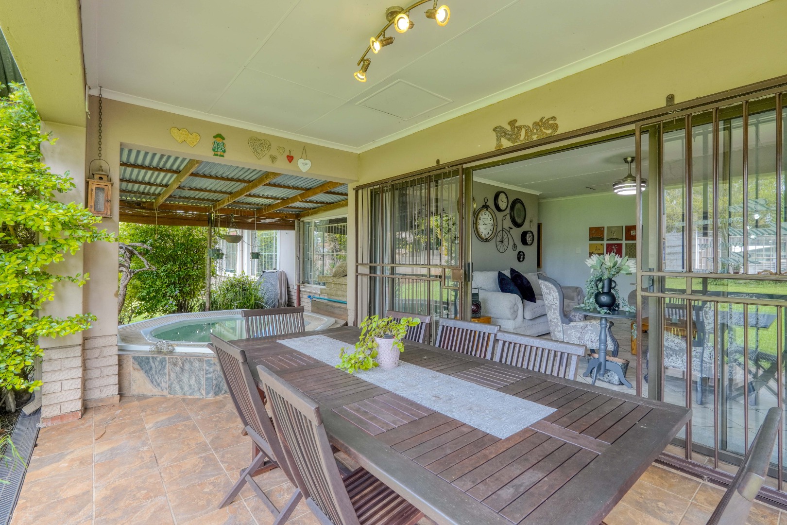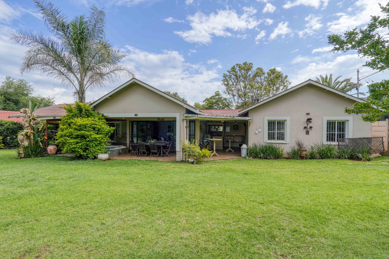 On the one side of the property, you’ll find a generous entertainment room designed for hosting. This space includes a lounge area, a built-in bar, and a braai, and also opens directly onto the patio, creating a seamless indoor-outdoor gathering zone.