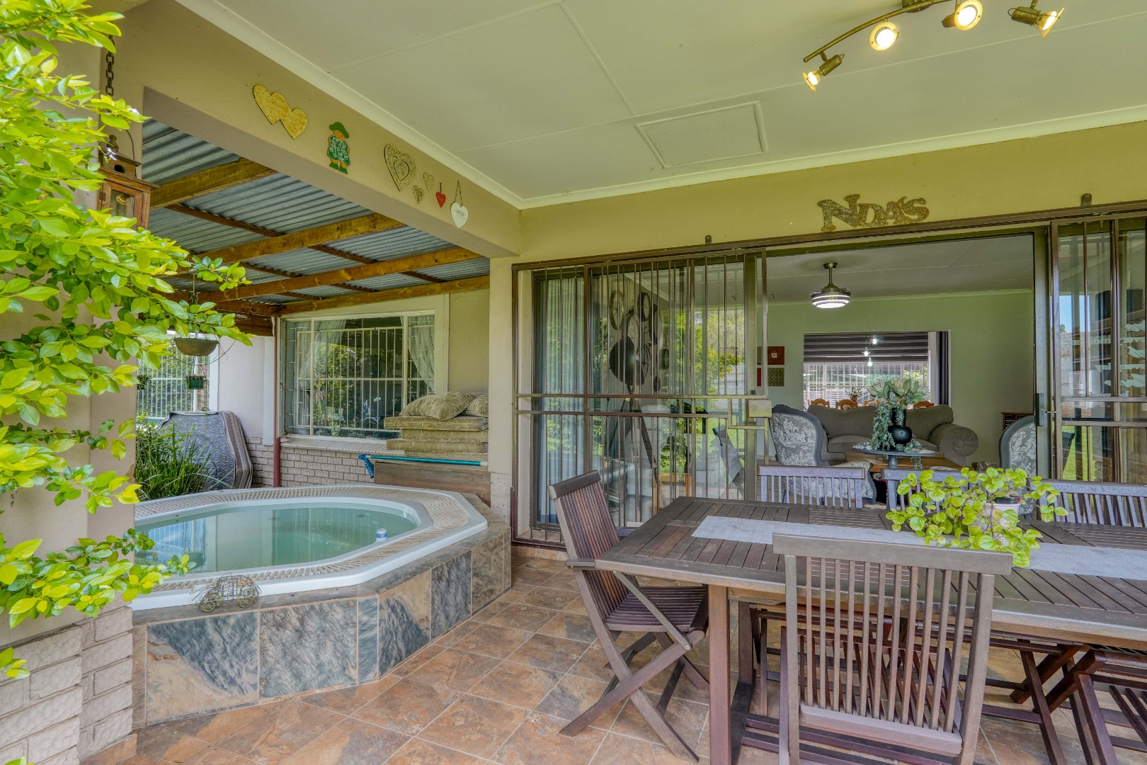 At the heart of the home is an open-plan flow connecting the dining room, kitchen, and living room. The living room enjoys natural light and opens through sliding doors to a covered patio, where a built-in jacuzzi invites year-round relaxation.