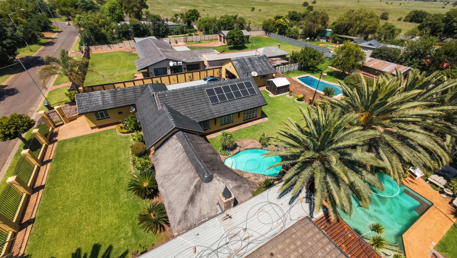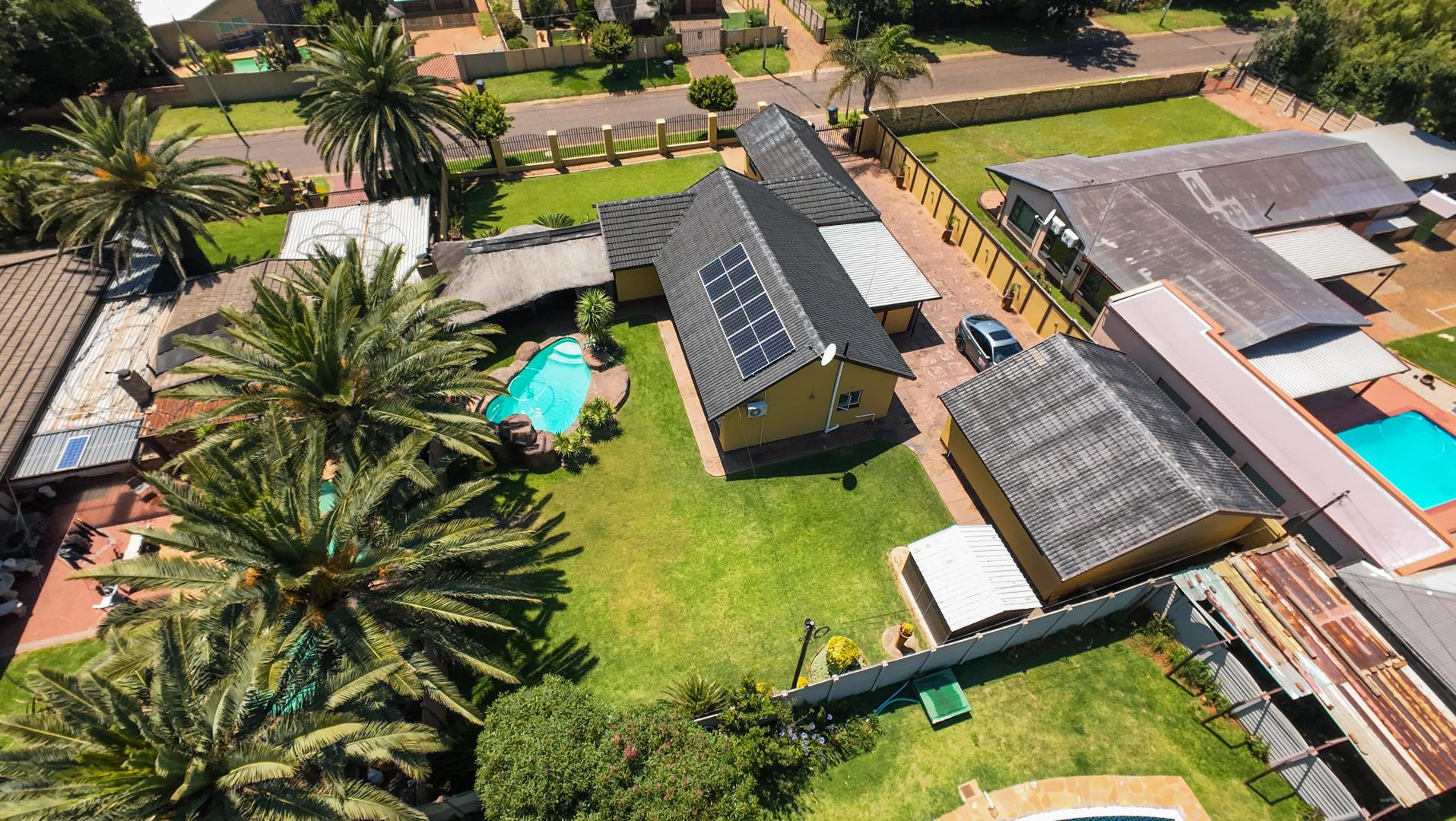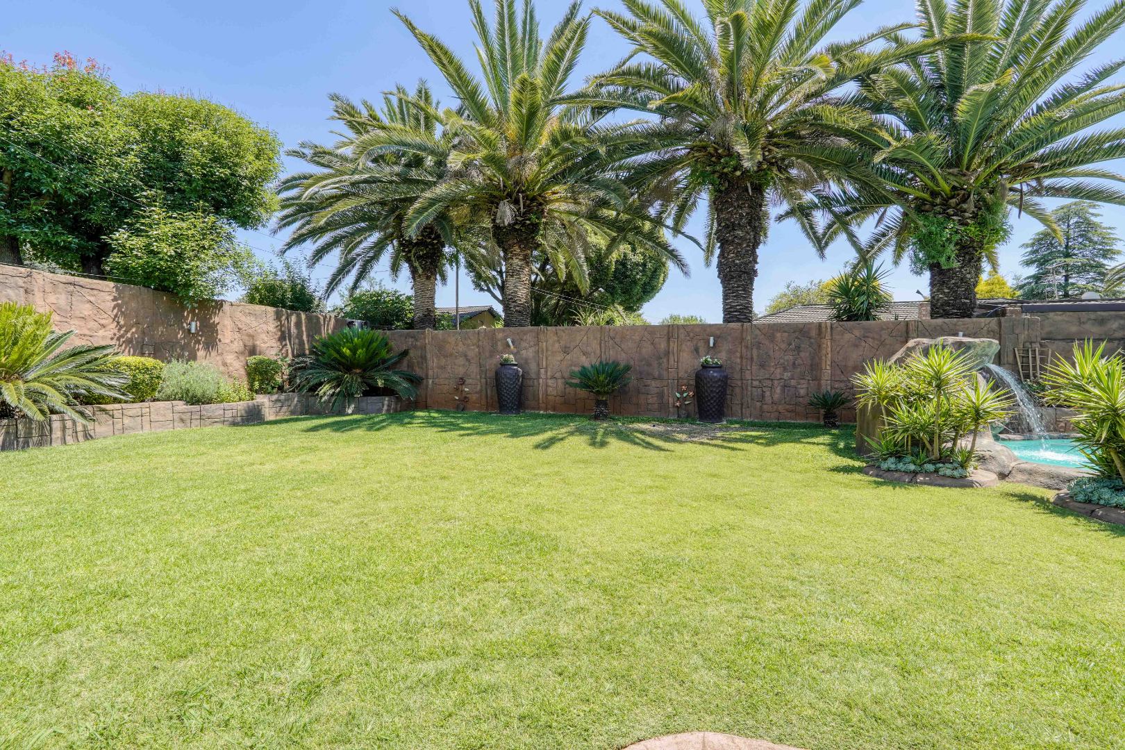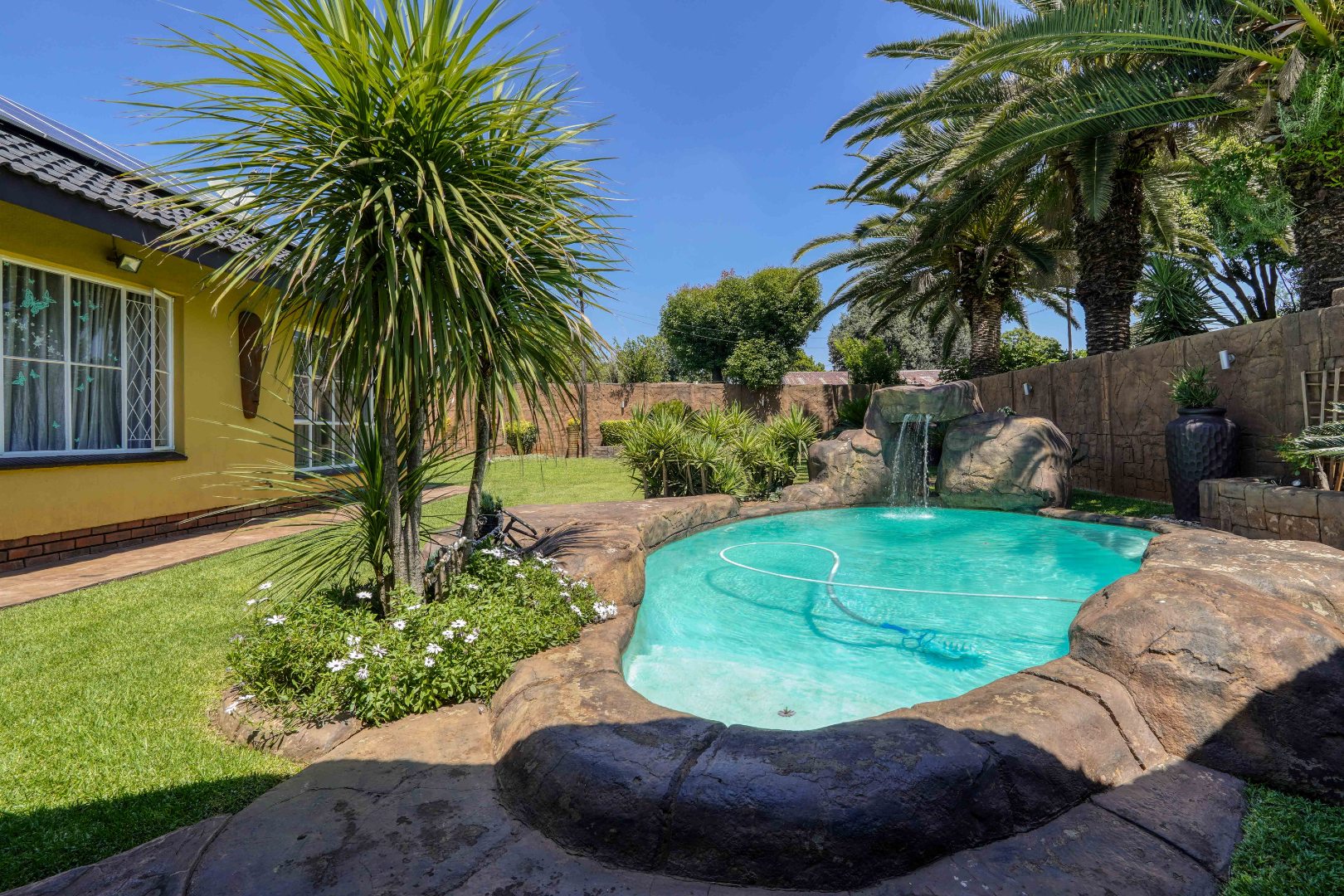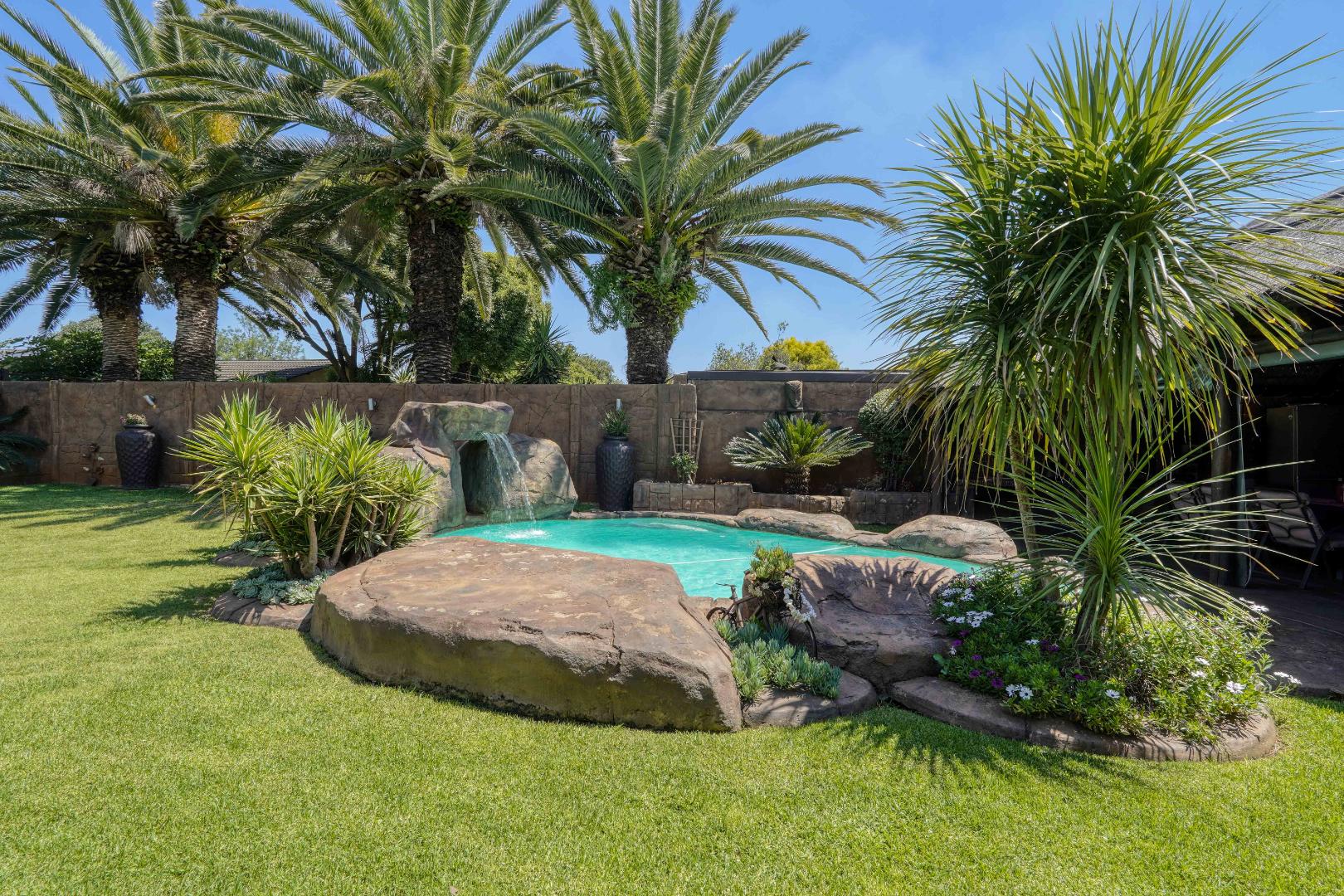 The home opens into a neat dining area that connects seamlessly with a compact yet functional kitchen, perfectly positioned for everyday living. From the dining area, the layout branches in two directions. One side leads to a dedicated office space, ideal for working from home, while the other flows into a comfortable lounge. The lounge opens out onto a patio covered by a thatched lapa, creating a perfect entertainment space. The lapa features a built in braai and opens both to the front yard through a door and freely towards the spacious backyard, where a sparkling swimming pool with rock water features becomes the focal point.