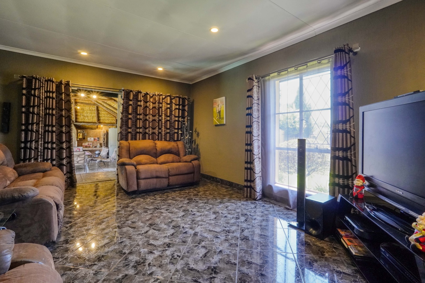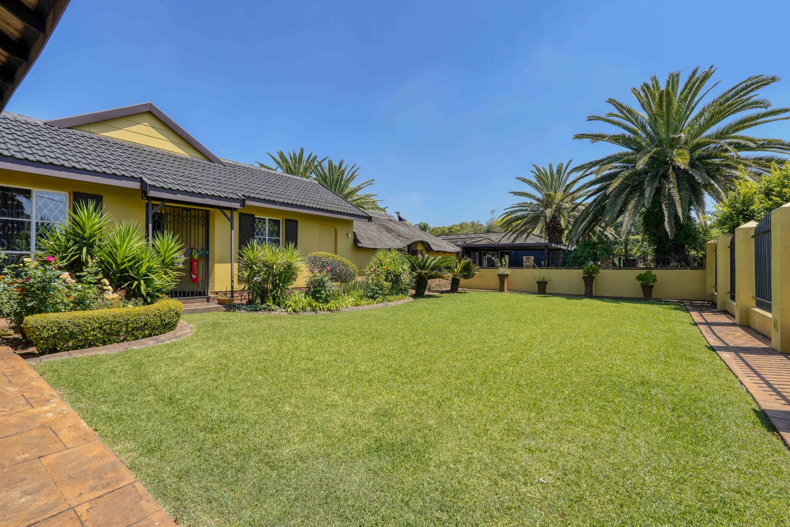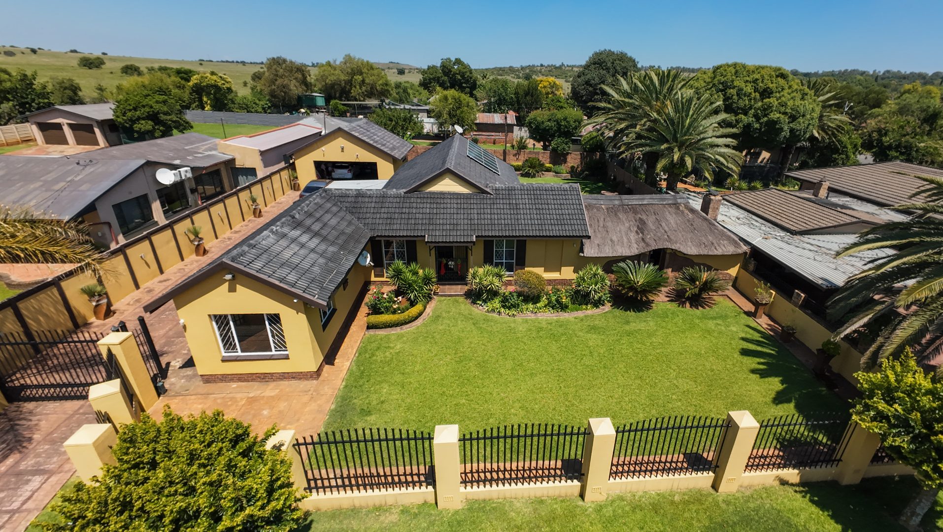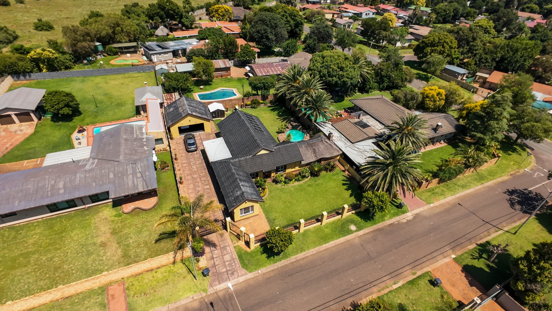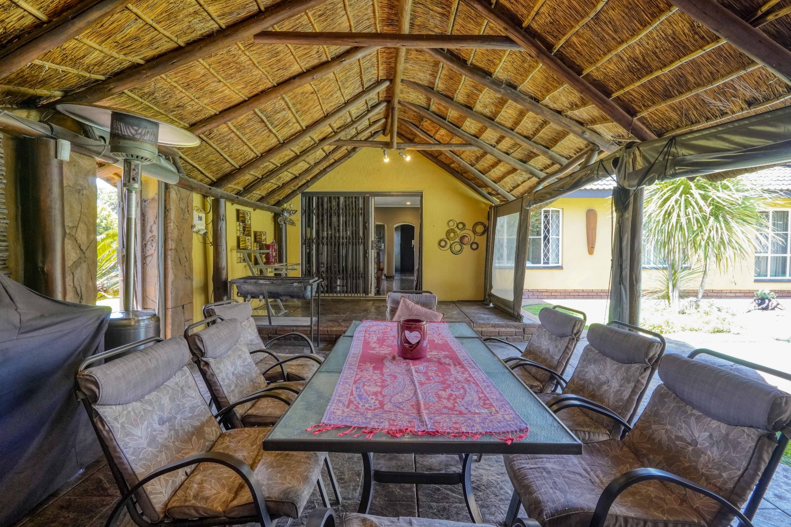 The home opens into a neat dining area that connects seamlessly with a compact yet functional kitchen, perfectly positioned for everyday living. From the dining area, the layout branches in two directions. One side leads to a dedicated office space, ideal for working from home, while the other flows into a comfortable lounge. The lounge opens out onto a patio covered by a thatched lapa, creating a perfect entertainment space. The lapa features a built in braai and opens both to the front yard through a door and freely towards the spacious backyard, where a sparkling swimming pool with rock water features becomes the focal point.
