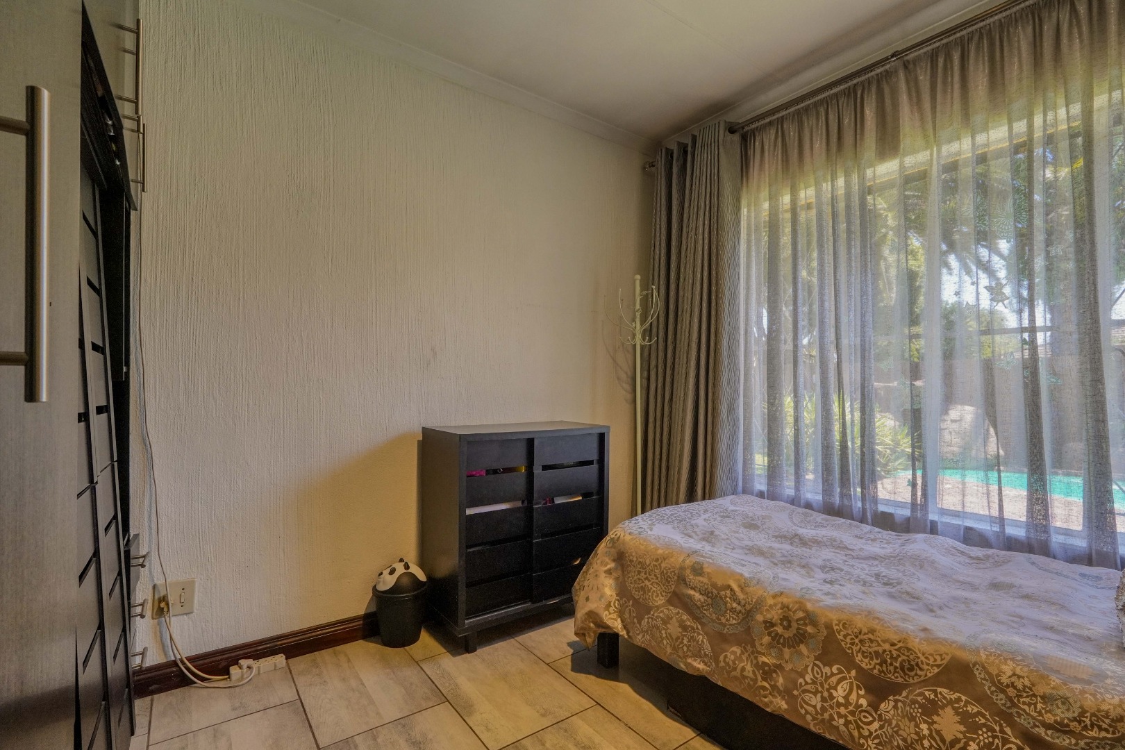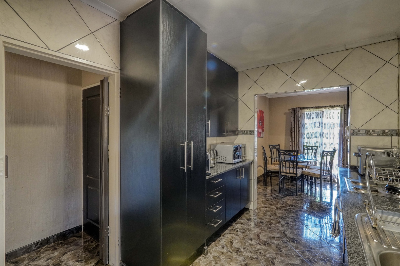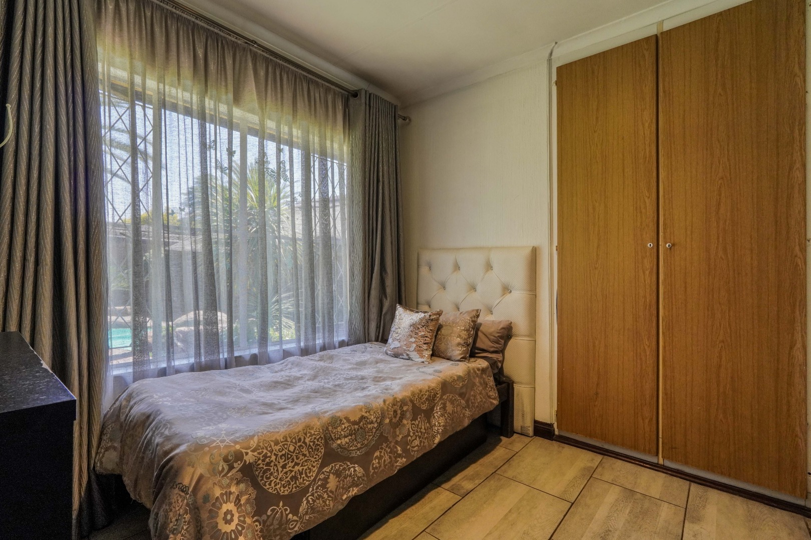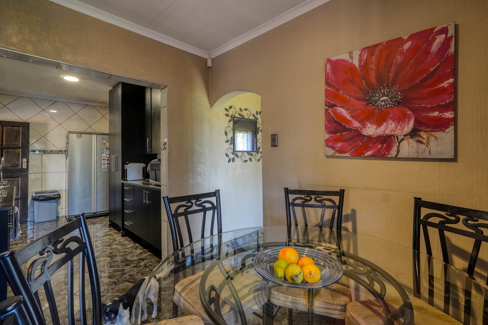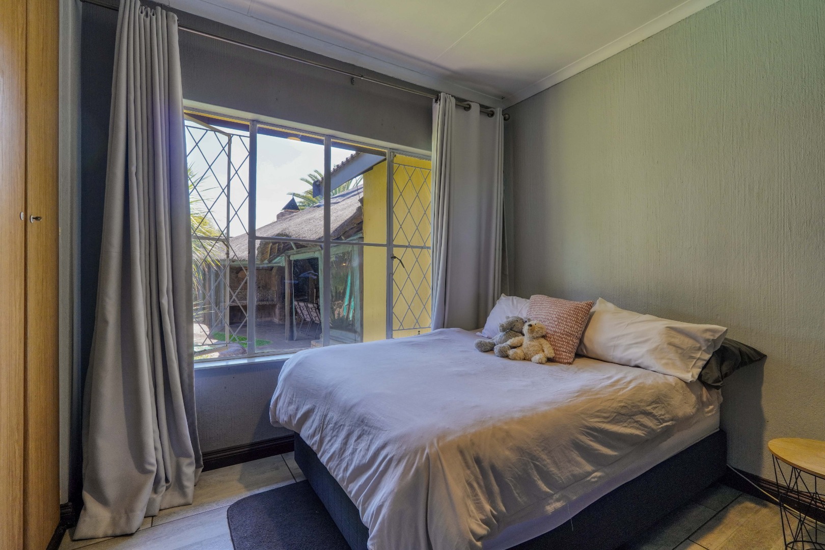 The home opens into a neat dining area that connects seamlessly with a compact yet functional kitchen, perfectly positioned for everyday living. From the dining area, the layout branches in two directions. One side leads to a dedicated office space, ideal for working from home, while the other flows into a comfortable lounge. The lounge opens out onto a patio covered by a thatched lapa, creating a perfect entertainment space. The lapa features a built in braai and opens both to the front yard through a door and freely towards the spacious backyard, where a sparkling swimming pool with rock water features becomes the focal point.