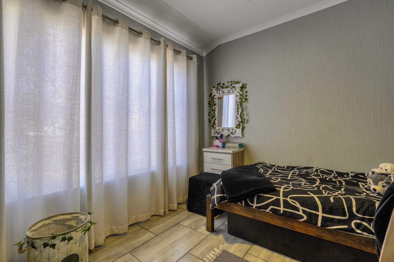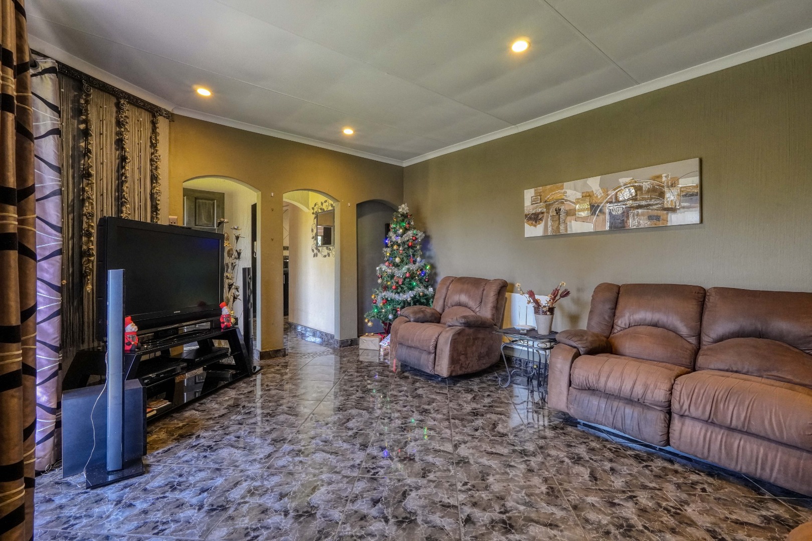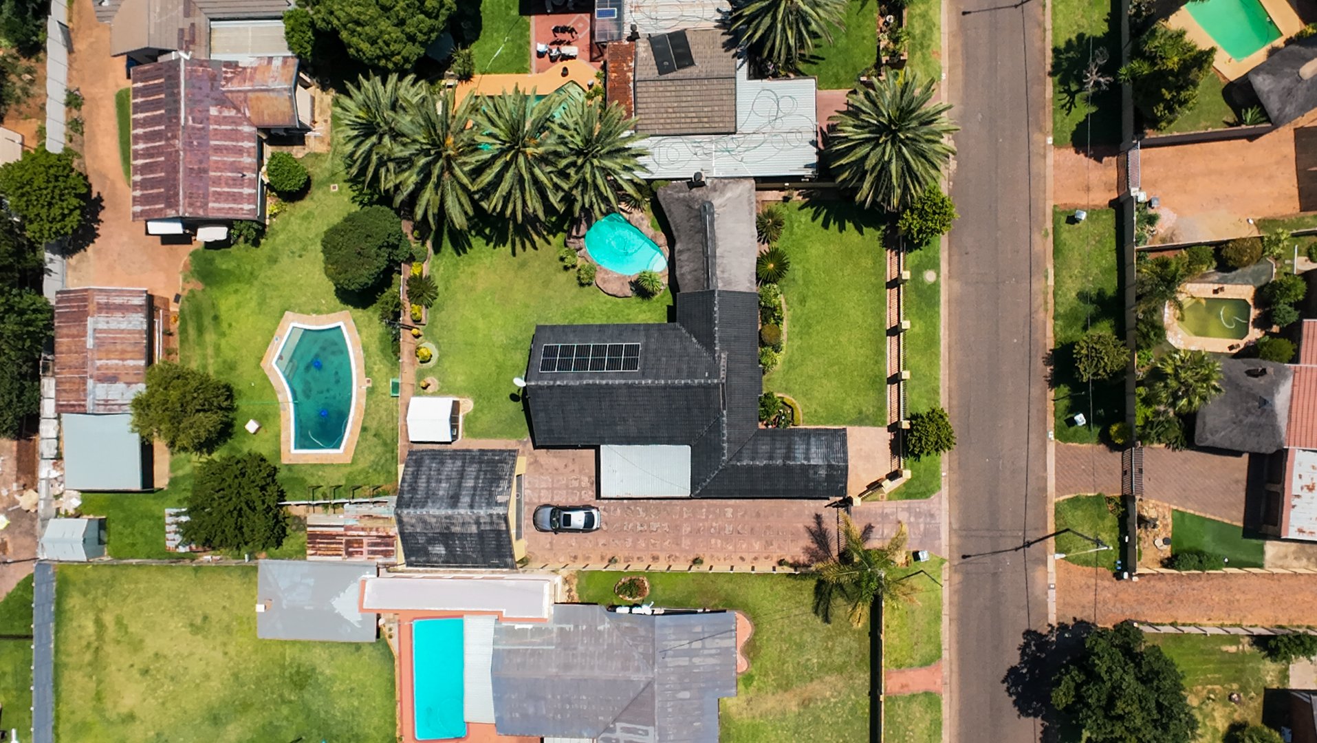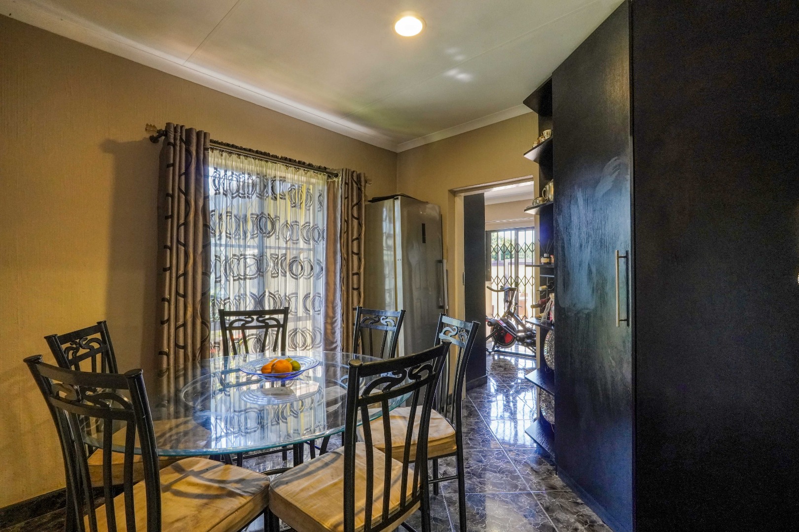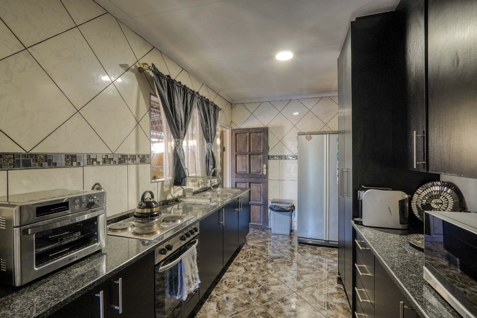 The home opens into a neat dining area that connects seamlessly with a compact yet functional kitchen, perfectly positioned for everyday living. From the dining area, the layout branches in two directions. One side leads to a dedicated office space, ideal for working from home, while the other flows into a comfortable lounge. The lounge opens out onto a patio covered by a thatched lapa, creating a perfect entertainment space. The lapa features a built in braai and opens both to the front yard through a door and freely towards the spacious backyard, where a sparkling swimming pool with rock water features becomes the focal point.