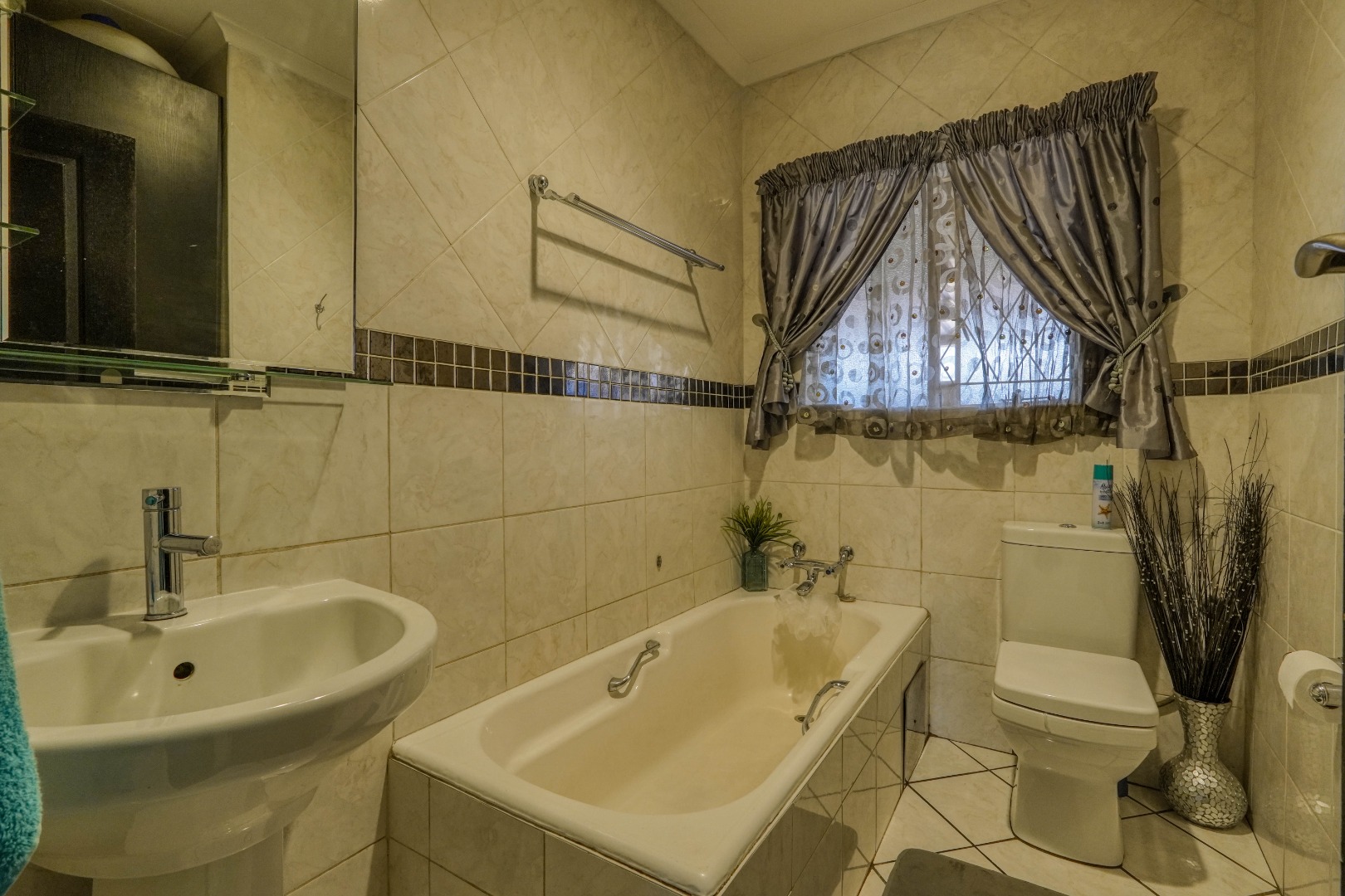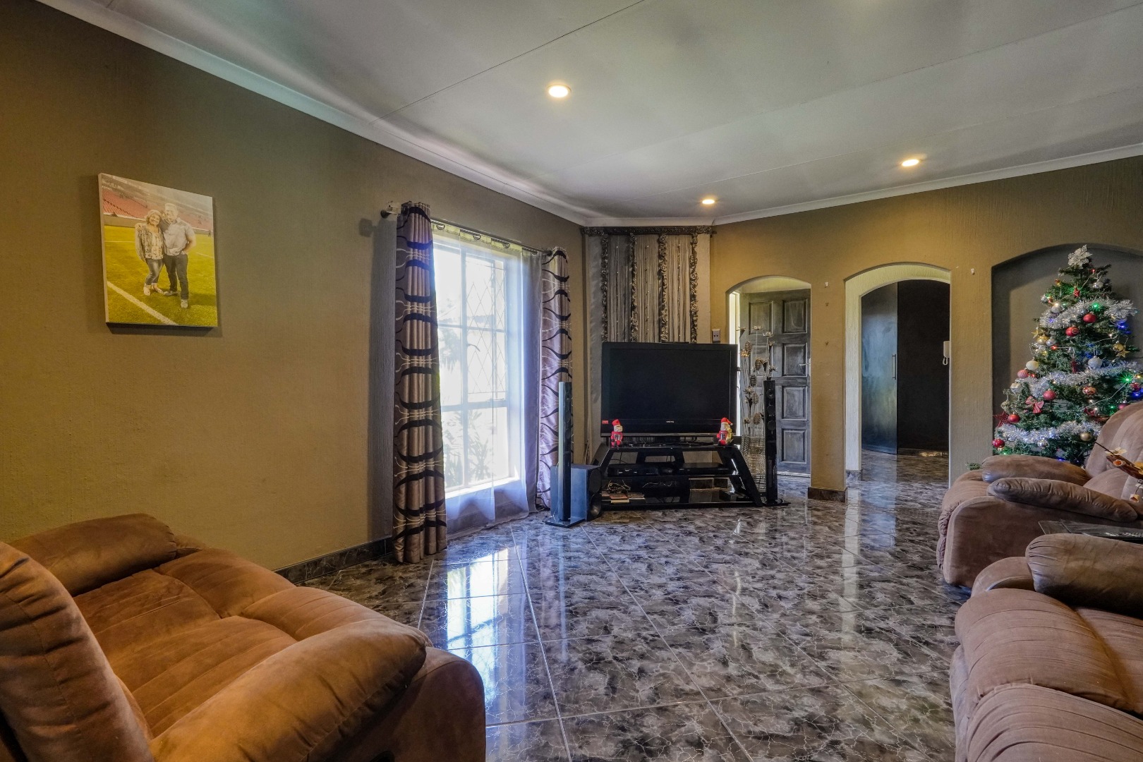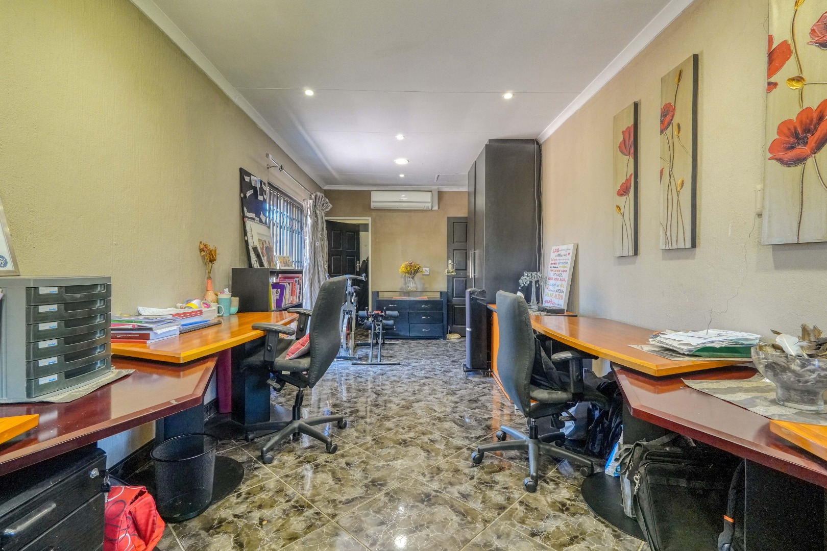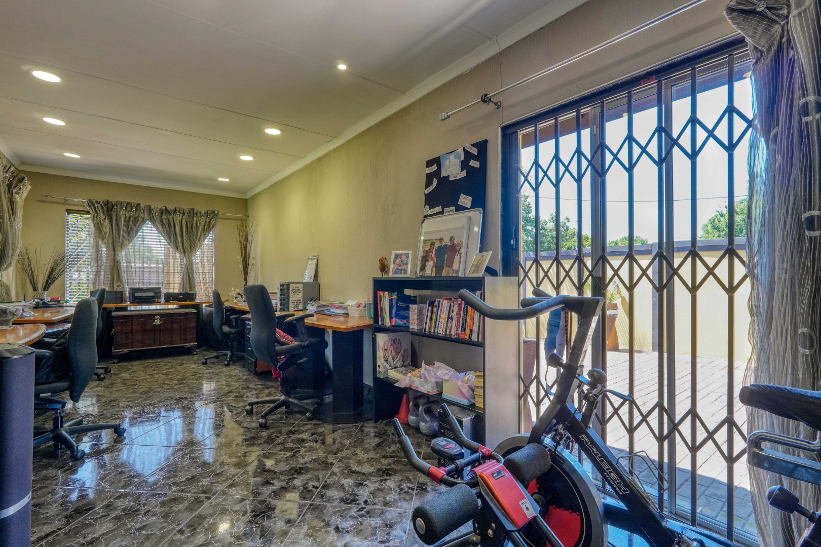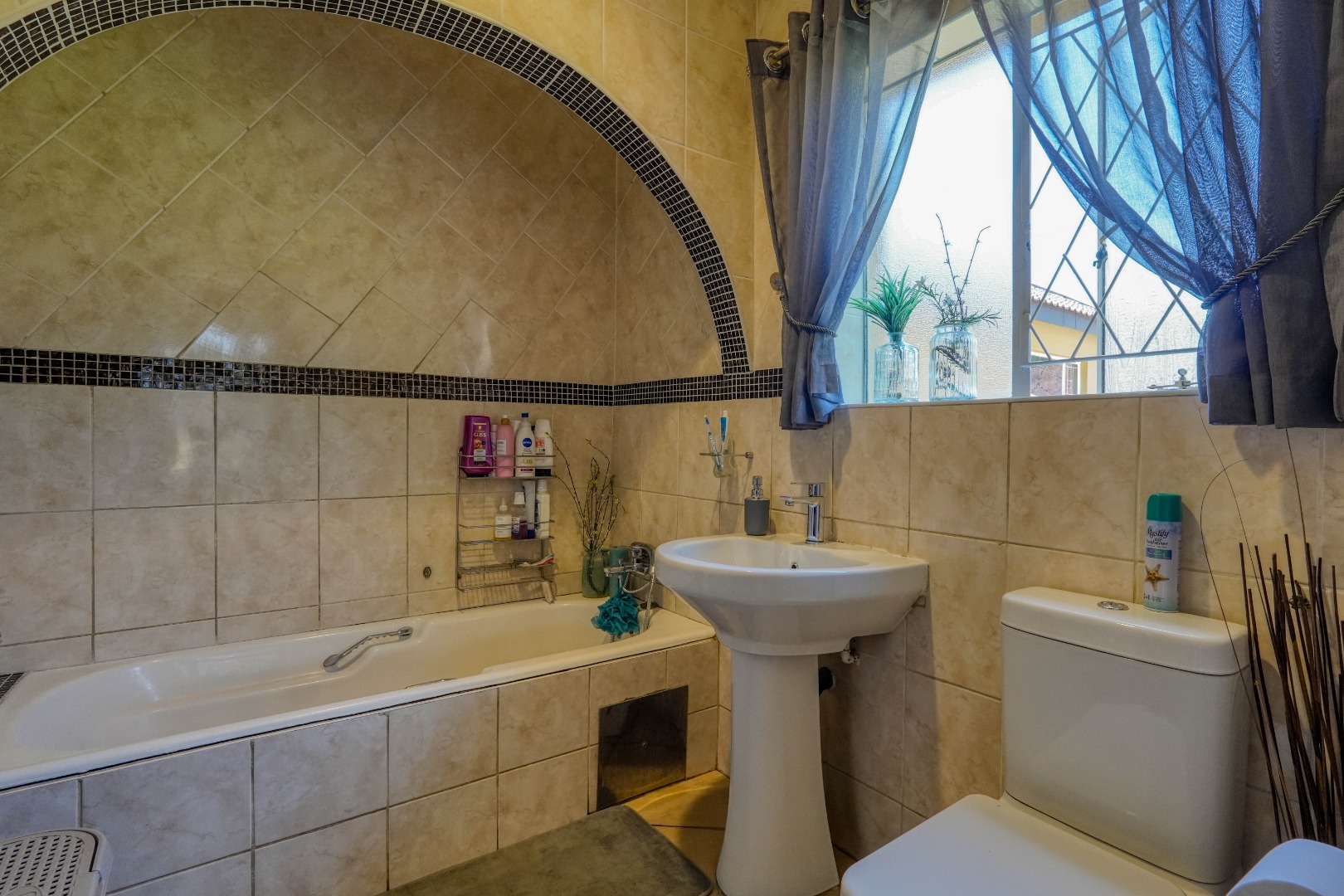 The home opens into a neat dining area that connects seamlessly with a compact yet functional kitchen, perfectly positioned for everyday living. From the dining area, the layout branches in two directions. One side leads to a dedicated office space, ideal for working from home, while the other flows into a comfortable lounge. The lounge opens out onto a patio covered by a thatched lapa, creating a perfect entertainment space. The lapa features a built in braai and opens both to the front yard through a door and freely towards the spacious backyard, where a sparkling swimming pool with rock water features becomes the focal point.