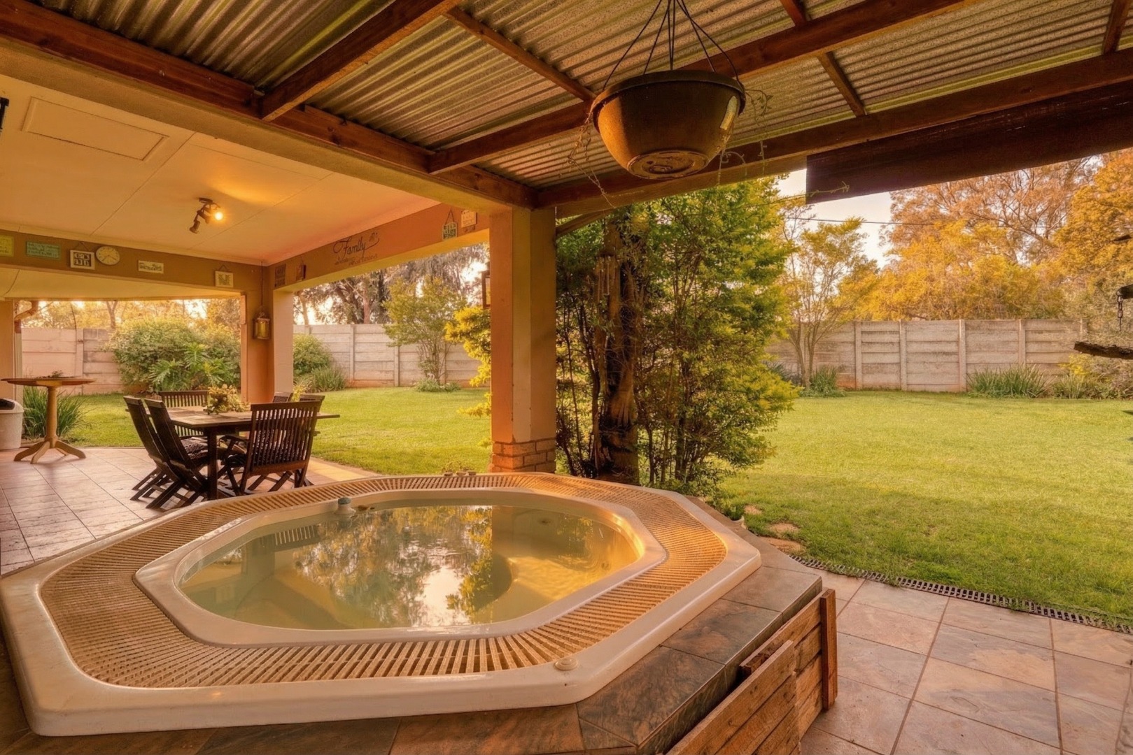 At the heart of the home is an open-plan flow connecting the dining room, kitchen, and living room. The living room enjoys natural light and opens through sliding doors to a covered patio, where a built-in jacuzzi invites year-round relaxation.