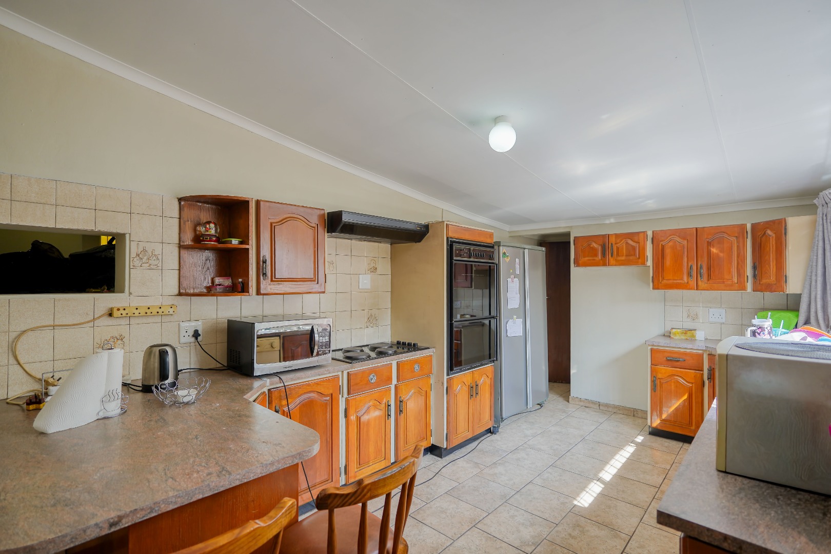 The kitchen is accessed through a smaller passage from the lounge and dining area, set just off the main hallway. It is fitted with a stove top, oven, and extractor fan, and also opens out to the garden, making it a practical space for everyday use.