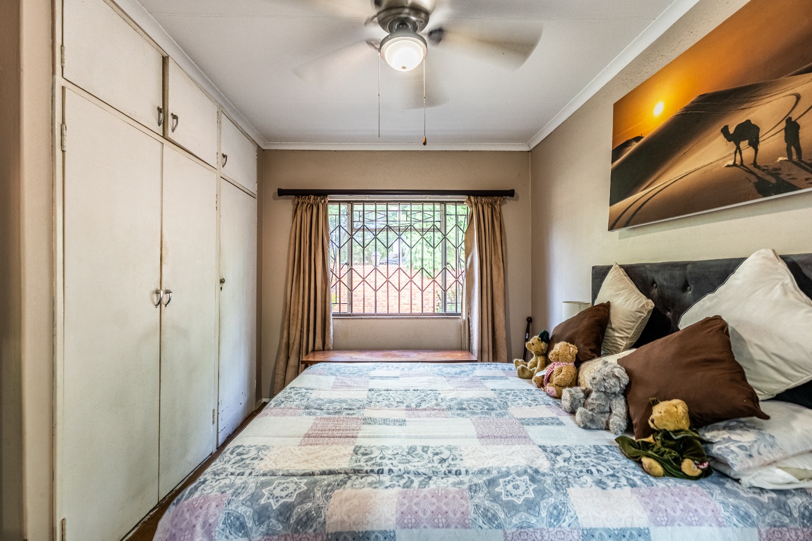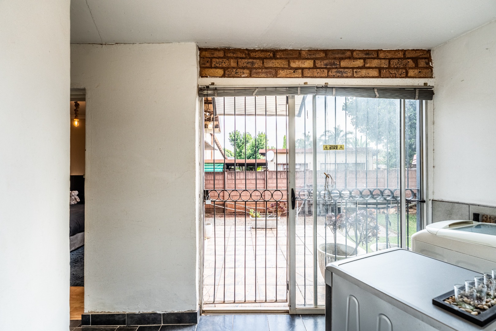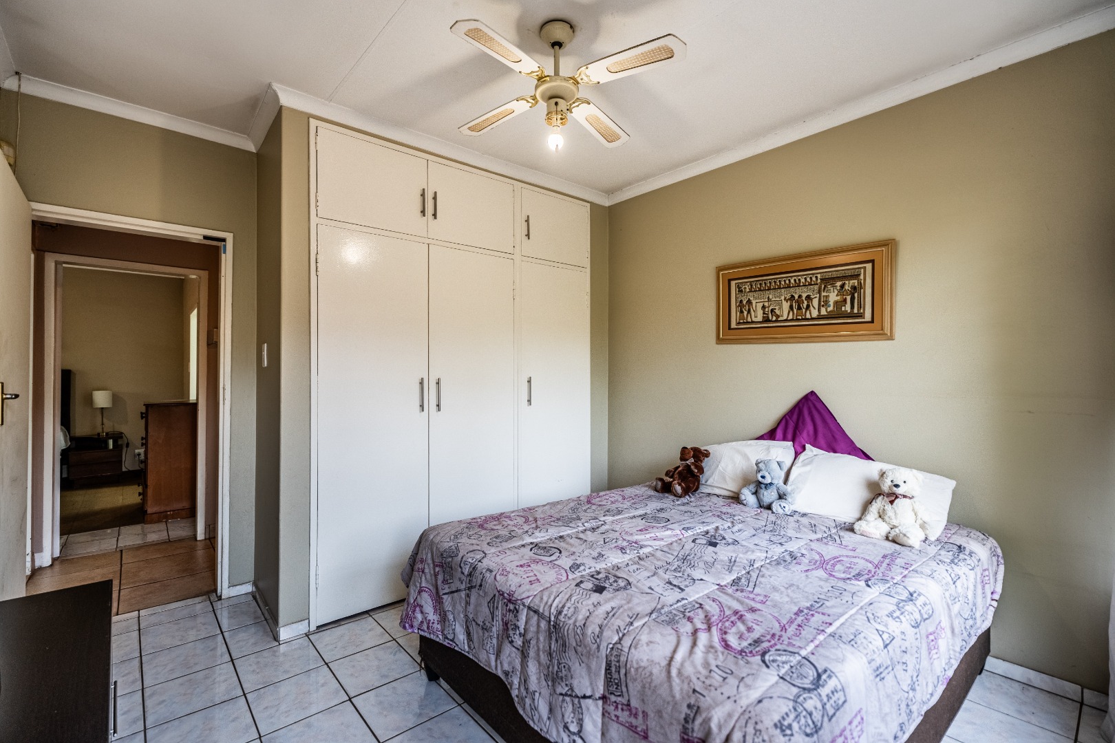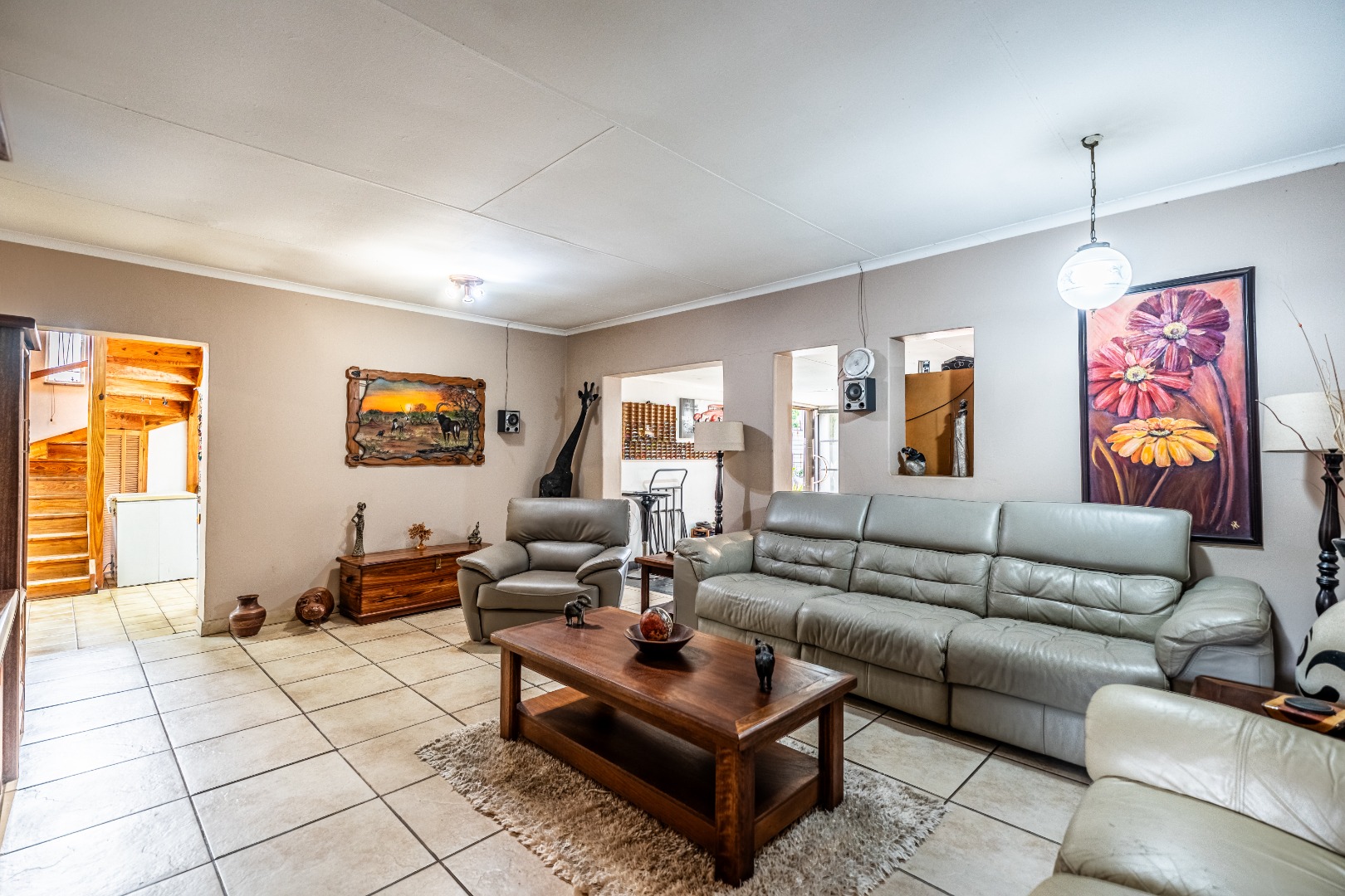Accommodation comprises five well-proportioned bedrooms and three bathrooms, including one en-suite, catering to the needs of a large family. The property is equipped with robust security features, including an alarm system, access gate, security gates and CCTV, ensuring peace of mind. Fibre connectivity is also available. Extras include an additional boma-braai area and 3 covered carports.