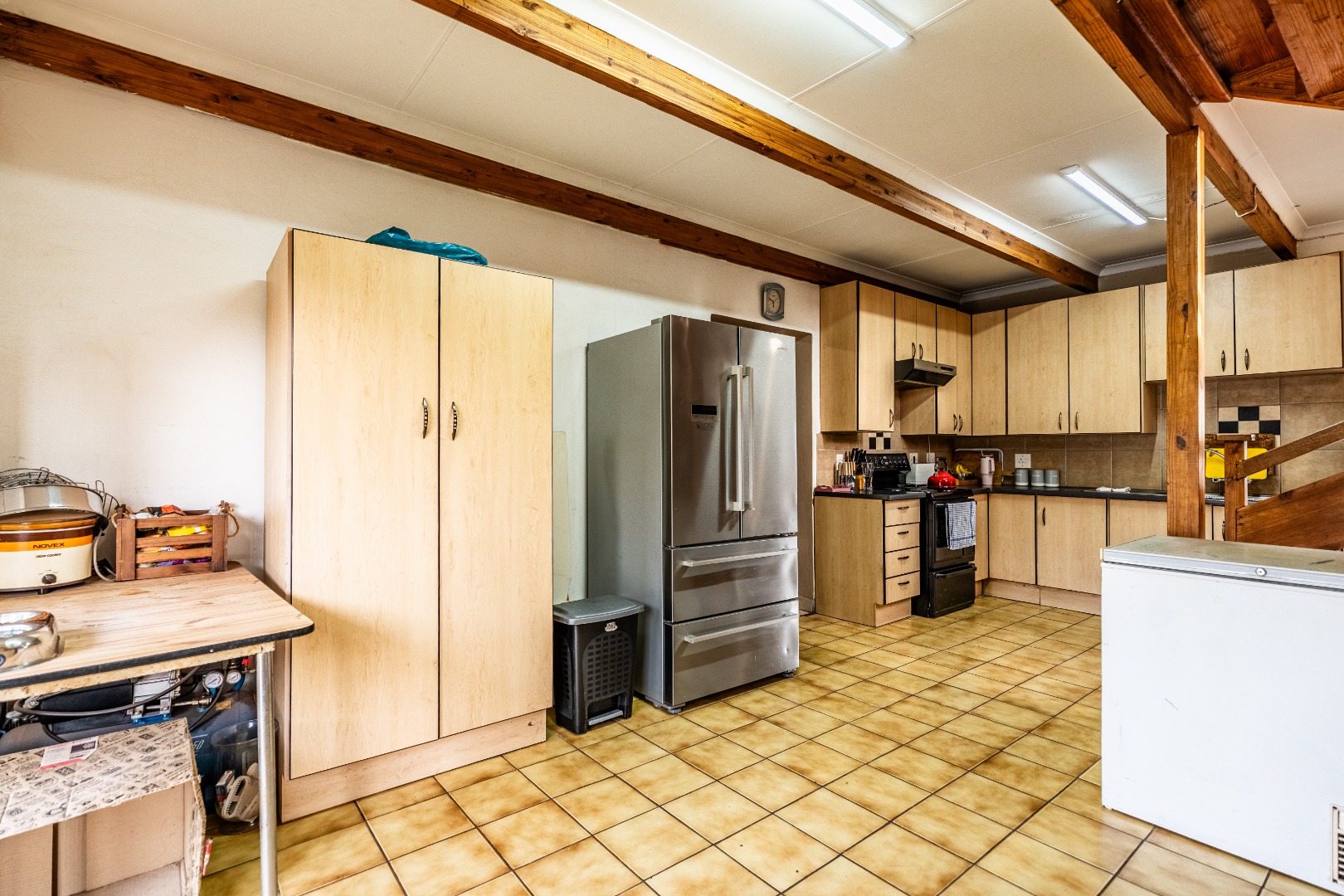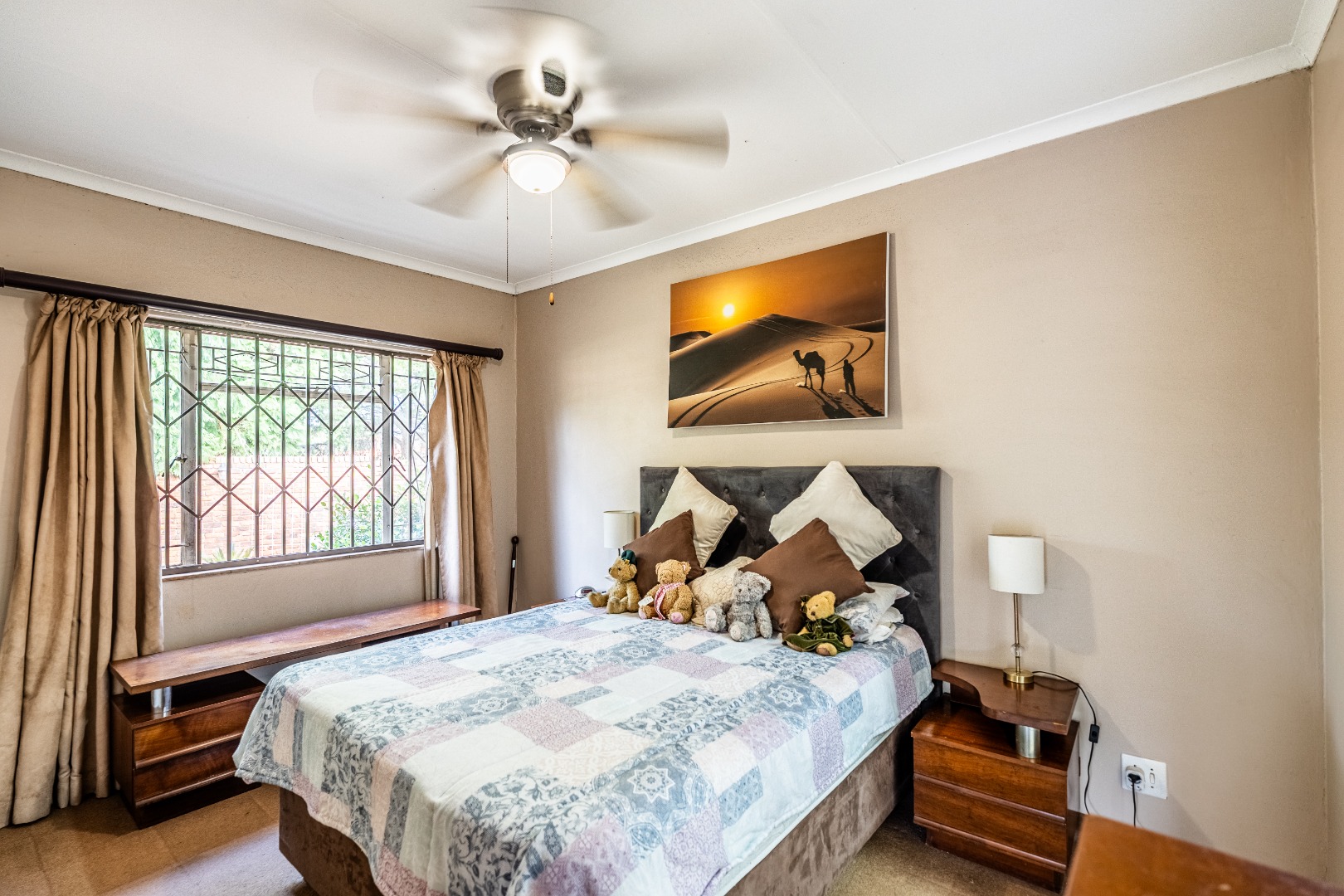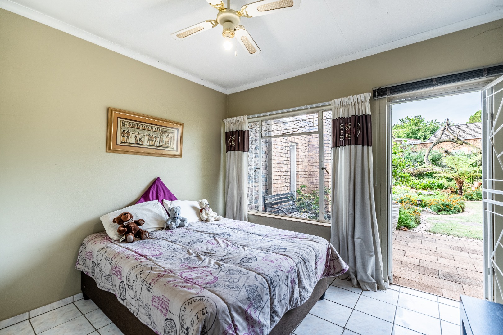 Accommodation comprises five well-proportioned bedrooms and three bathrooms, including one en-suite, catering to the needs of a large family. The property is equipped with robust security features, including an alarm system, access gate, security gates and CCTV, ensuring peace of mind. Fibre connectivity is also available. Extras include an additional boma-braai area and 3 covered carports.