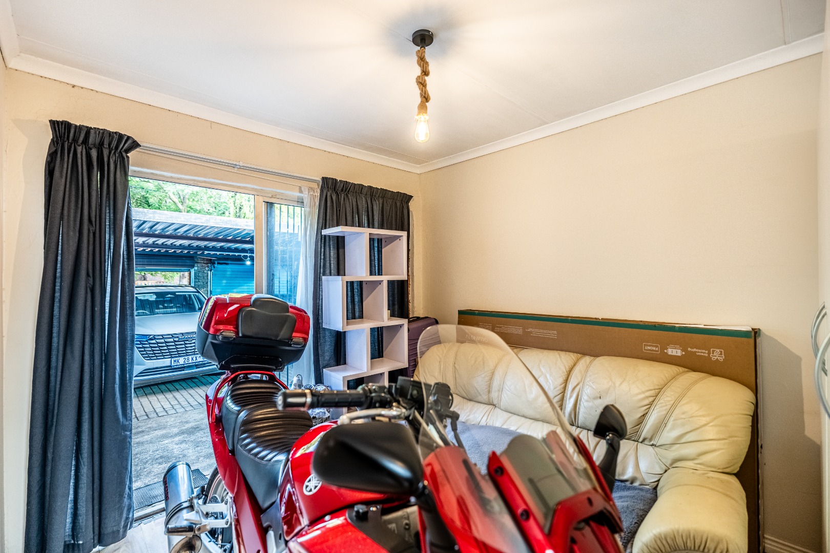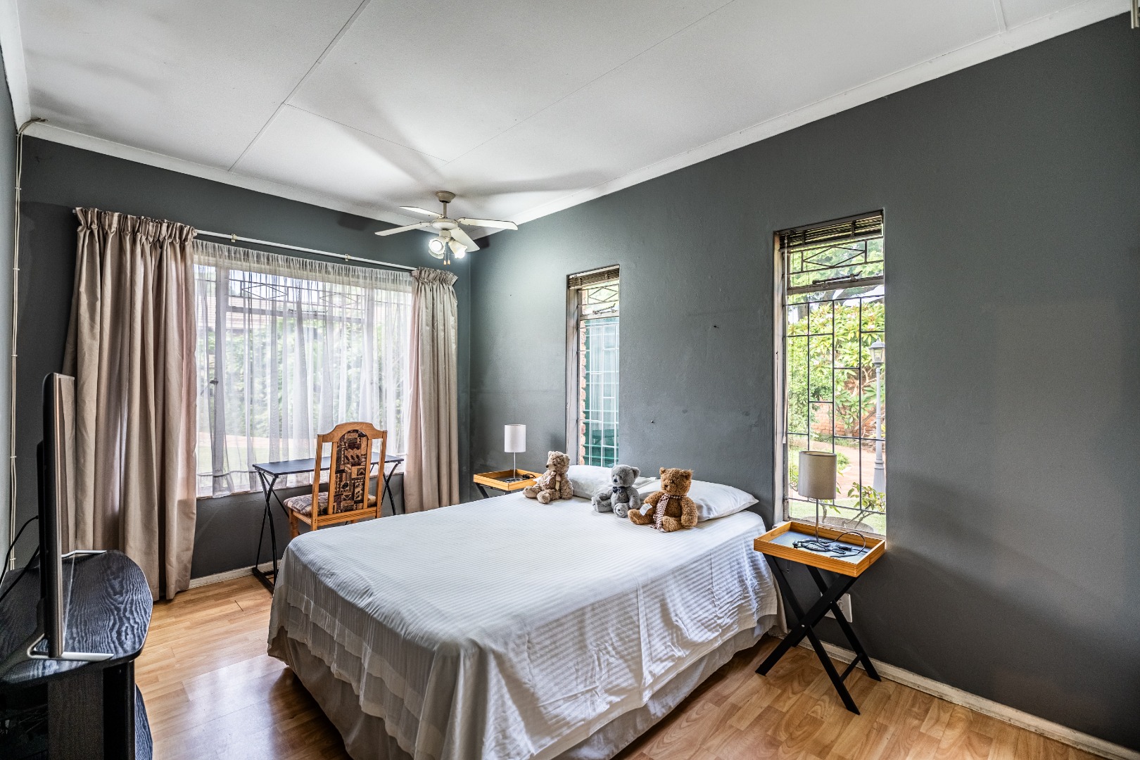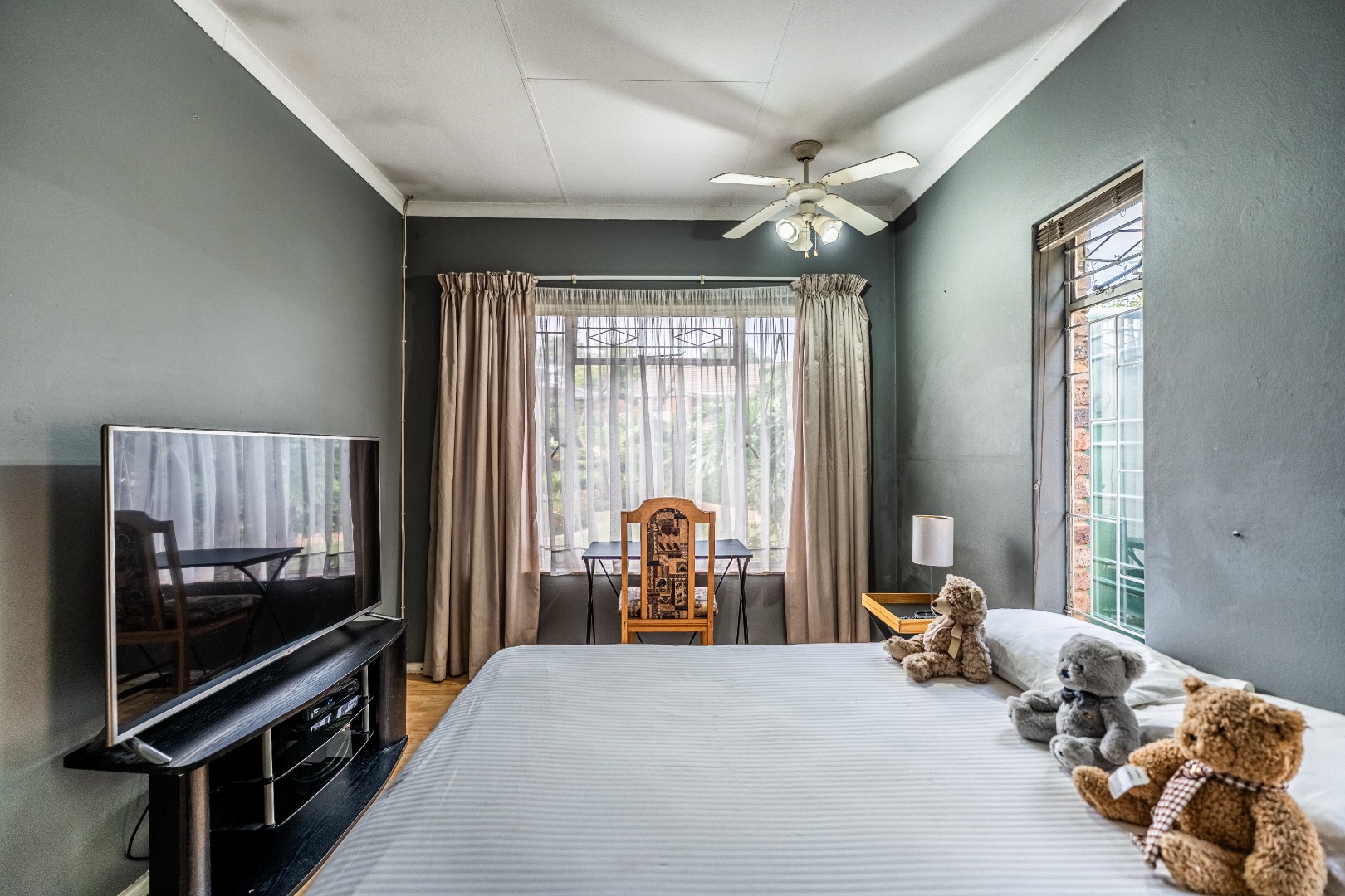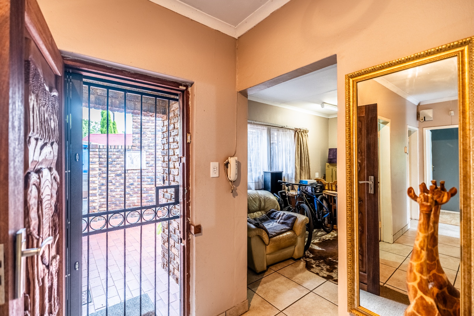 Accommodation comprises five well-proportioned bedrooms and three bathrooms, including one en-suite, catering to the needs of a large family. The property is equipped with robust security features, including an alarm system, access gate, security gates and CCTV, ensuring peace of mind. Fibre connectivity is also available. Extras include an additional boma-braai area and 3 covered carports.