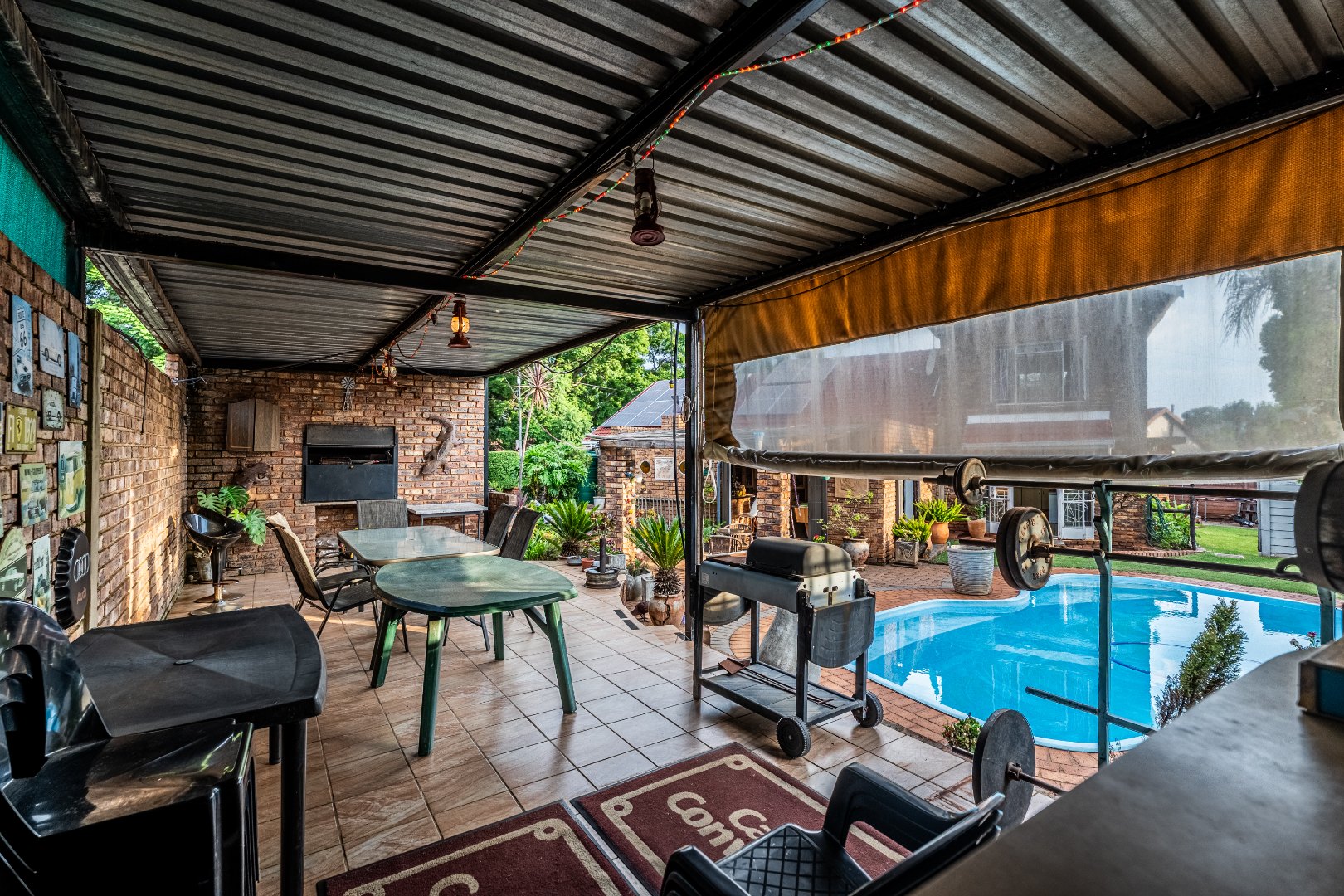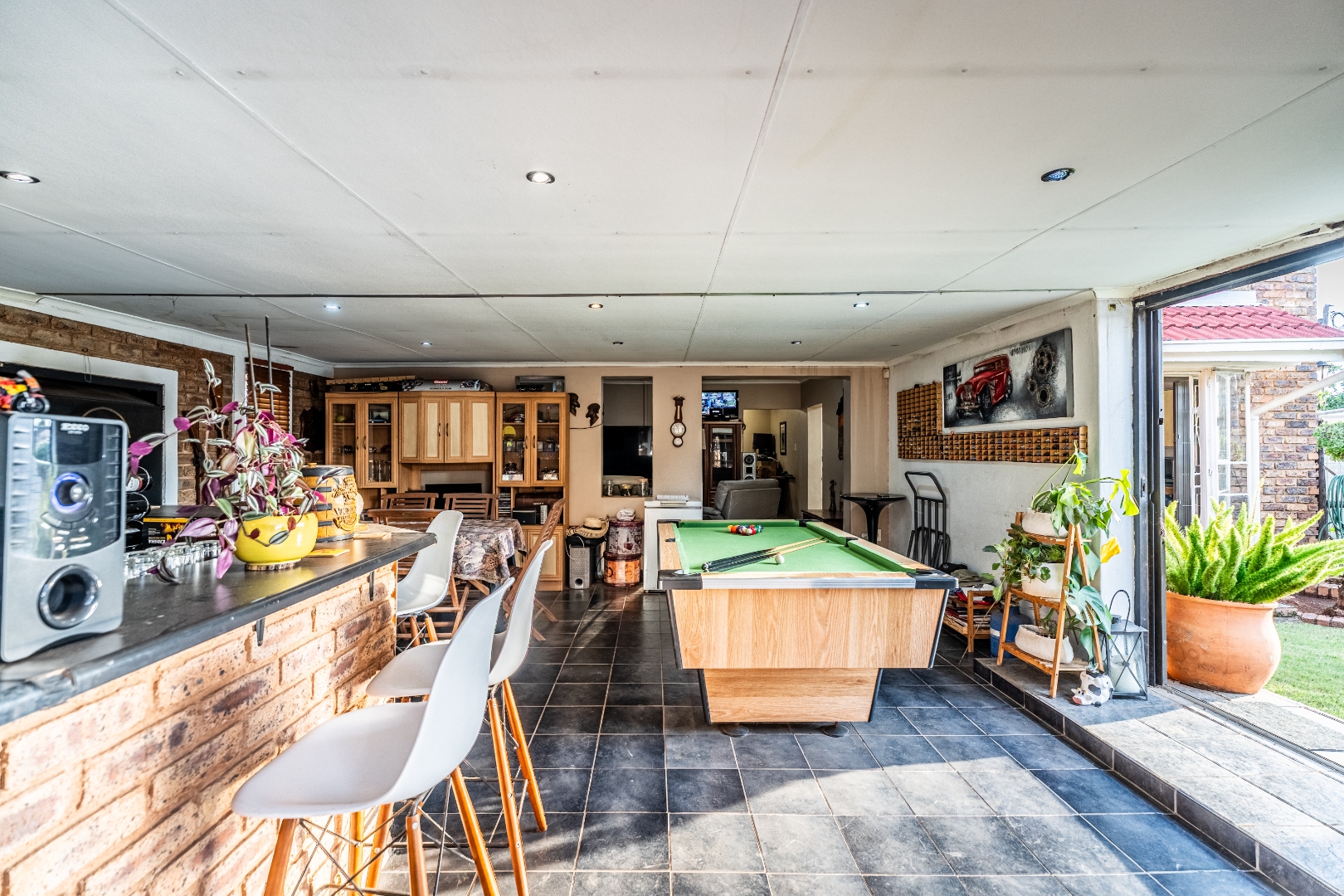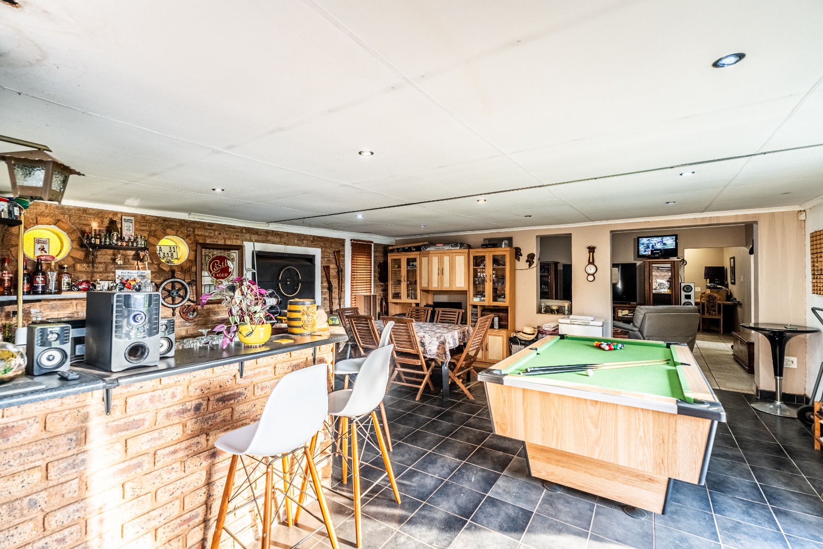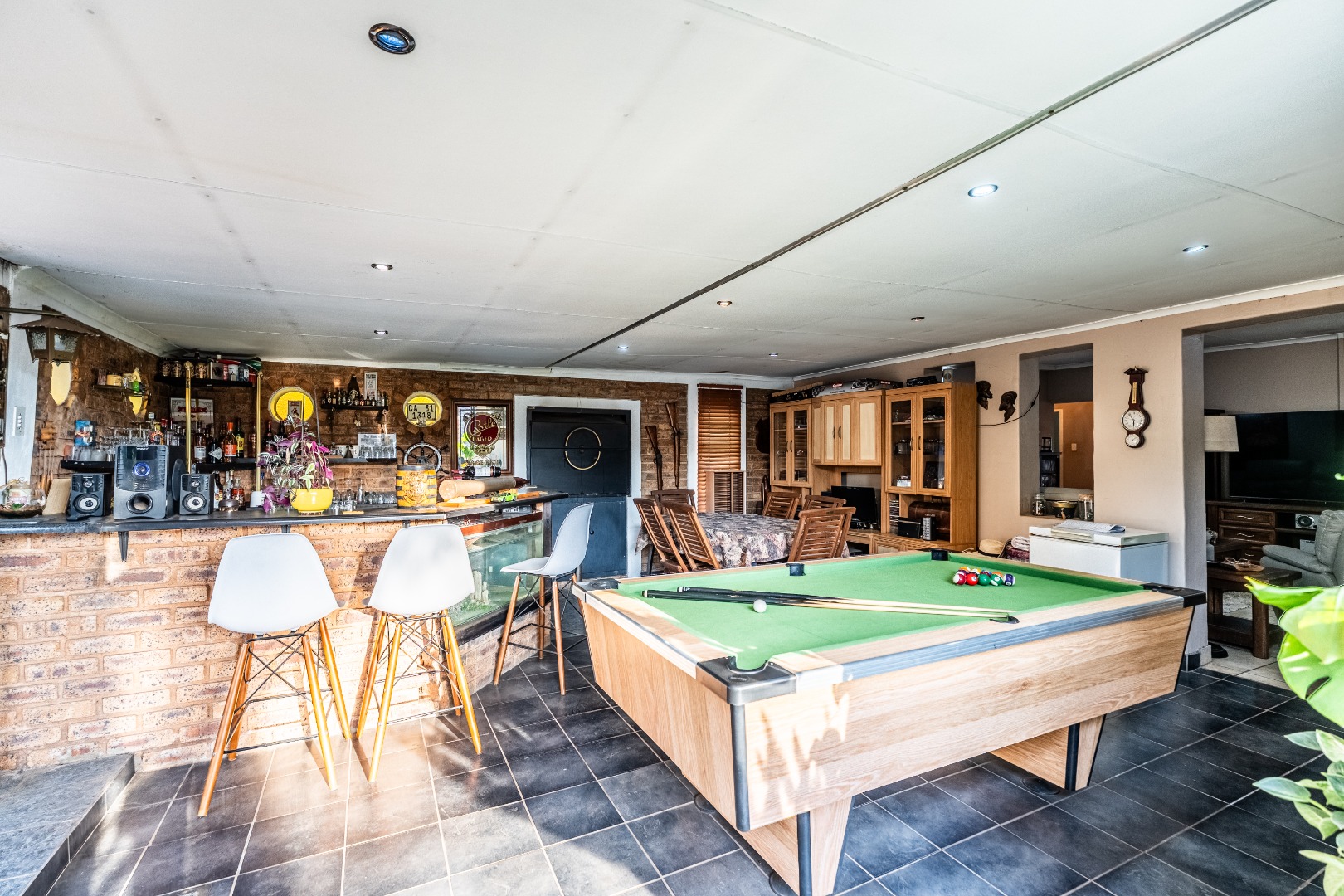 Inside, this home features spacious living areas with durable tiled flooring and a neutral colour palette, providing a versatile canvas for personal touches. The layout includes a very spacious kitchen, a dining room, alongside a dedicated family/TV room that leads to one of two entertainment areas. A highlight is the multi-functional indoor entertainment area, complete with a built-in bar, a pool table, and a built-in braai, offering direct access to the garden and pool area through large doors, ensuring seamless indoor-outdoor flow.