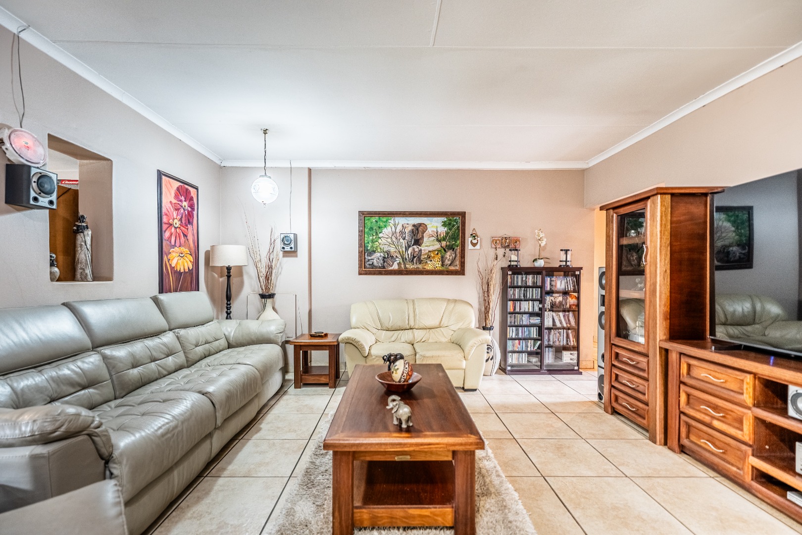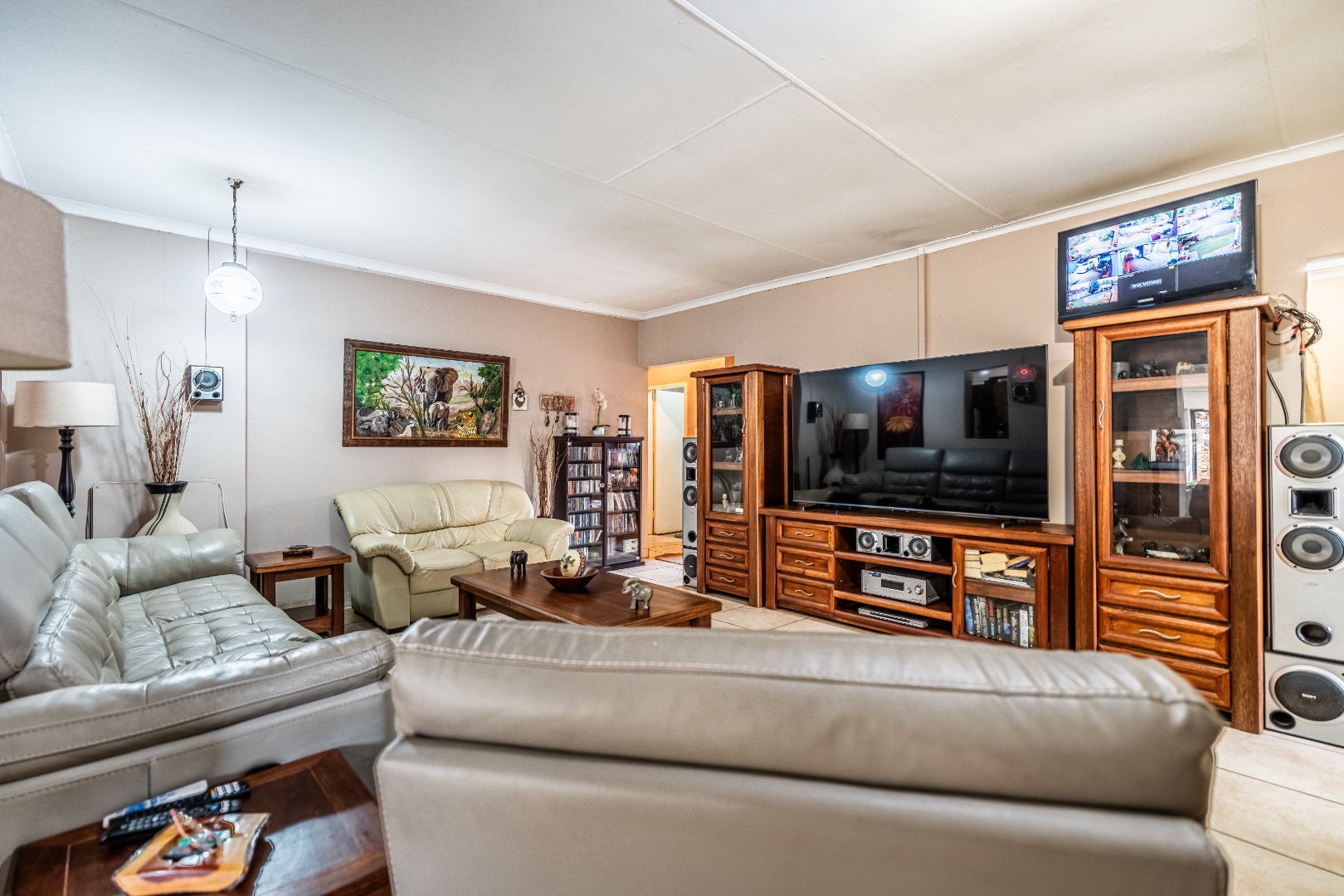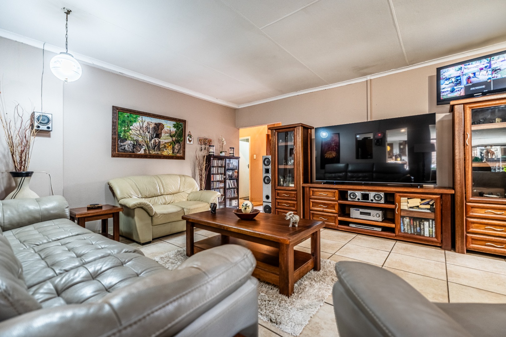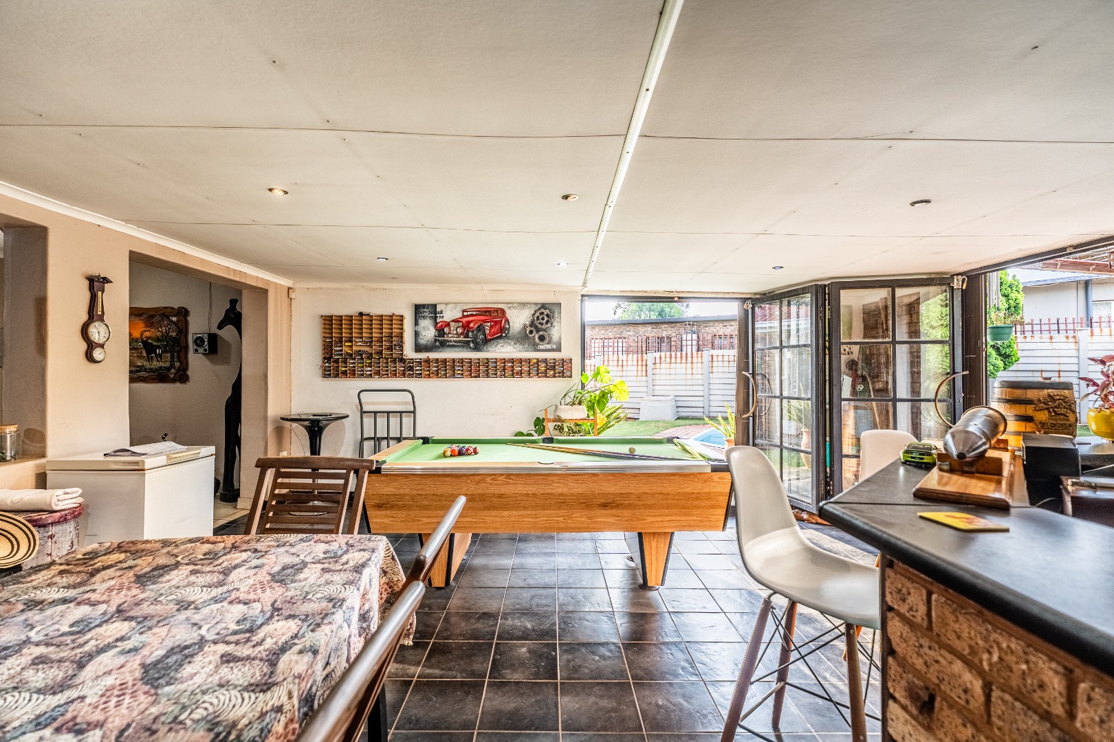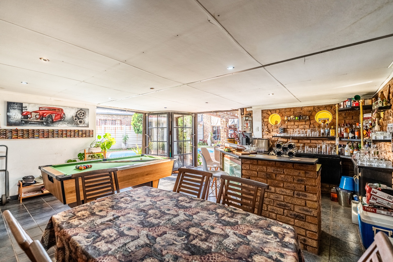 Inside, this home features spacious living areas with durable tiled flooring and a neutral colour palette, providing a versatile canvas for personal touches. The layout includes a very spacious kitchen, a dining room, alongside a dedicated family/TV room that leads to one of two entertainment areas. A highlight is the multi-functional indoor entertainment area, complete with a built-in bar, a pool table, and a built-in braai, offering direct access to the garden and pool area through large doors, ensuring seamless indoor-outdoor flow.
