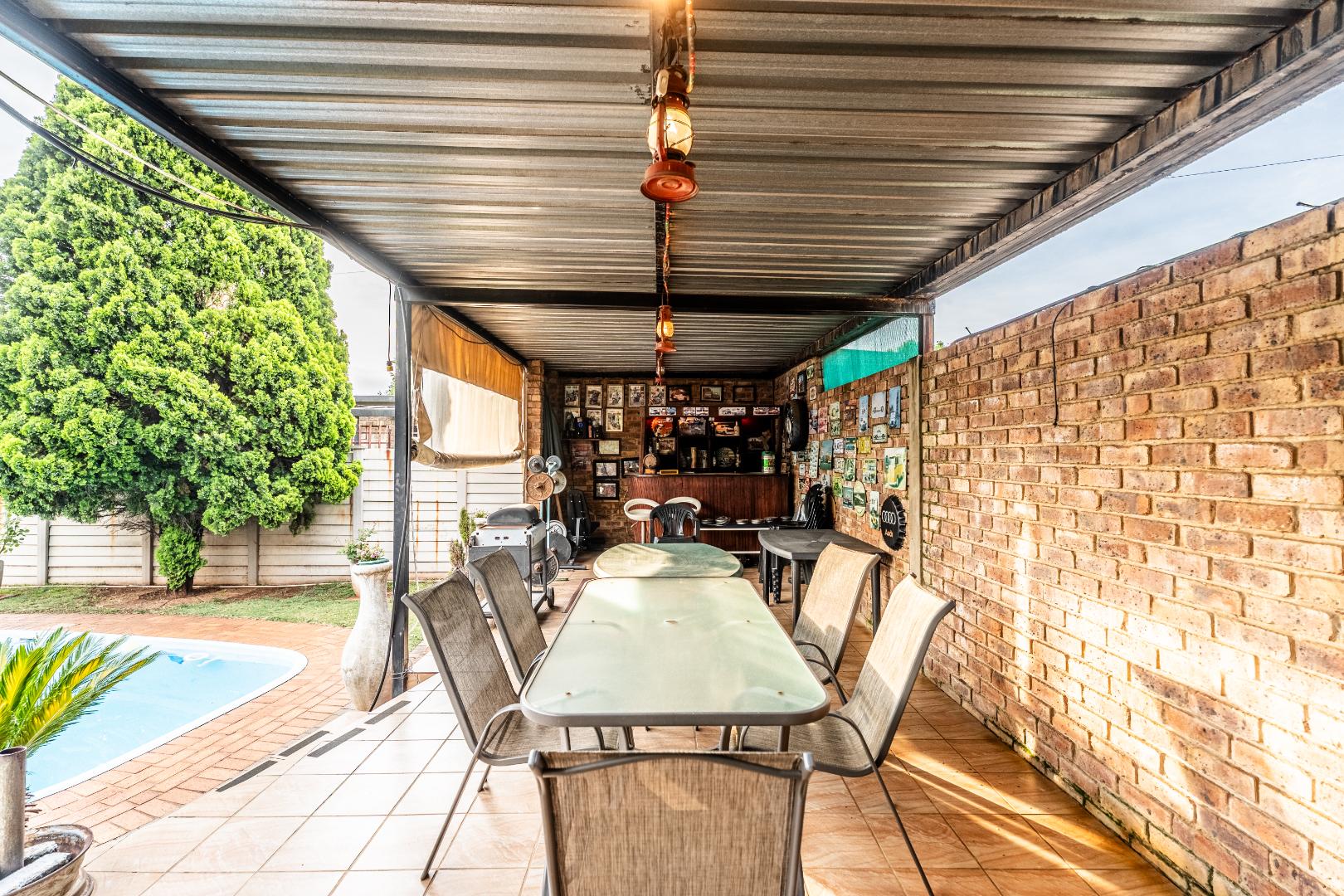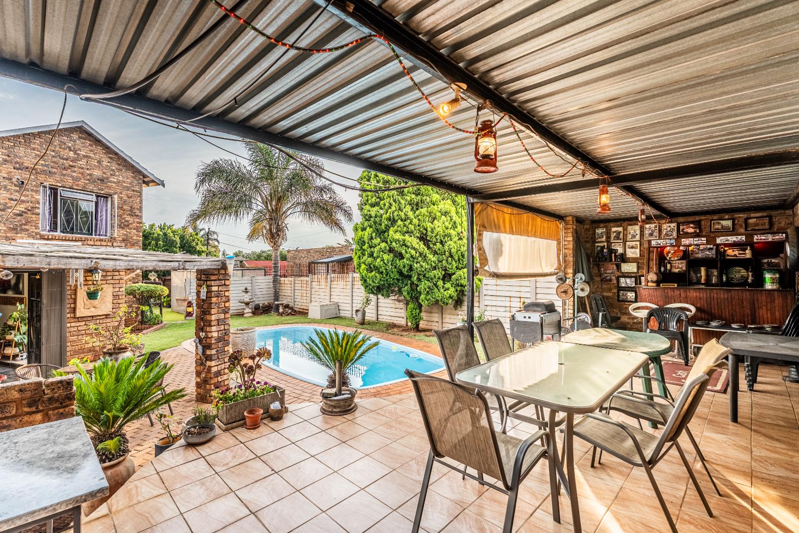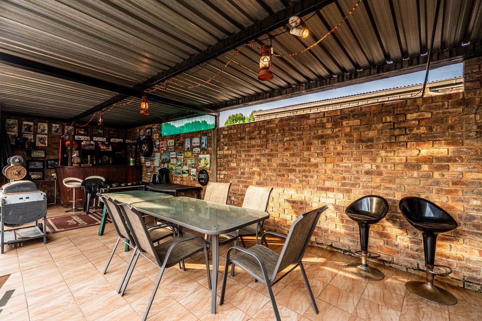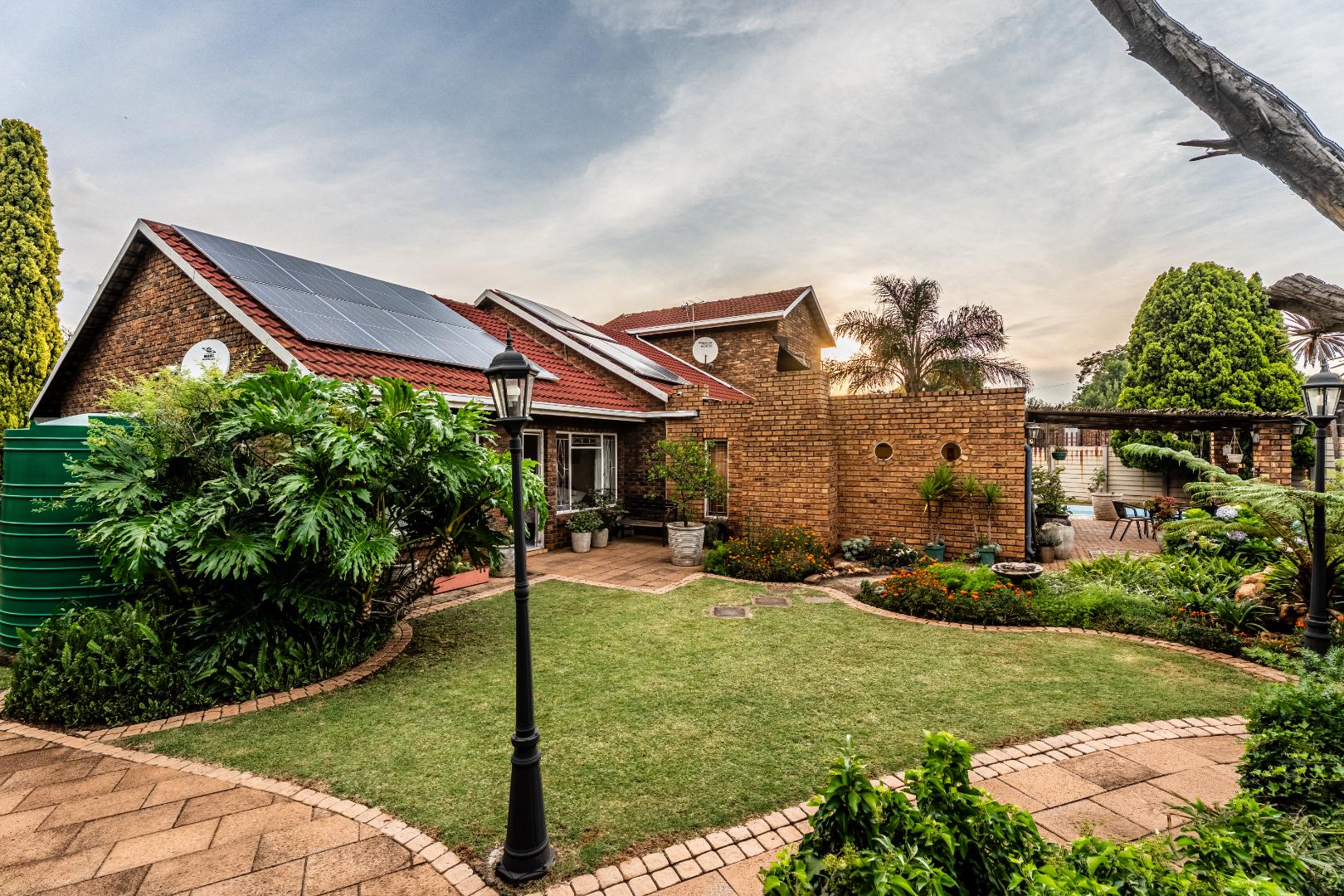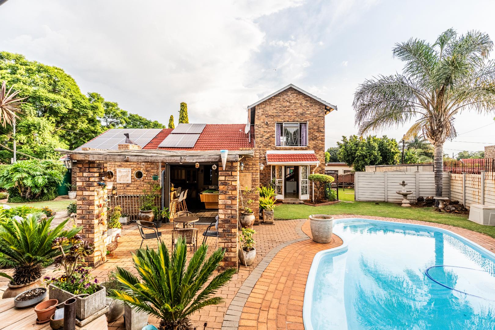 The exterior presents a traditional low maintenance brick facade complemented by a lush, well-established garden and extensive paved patio areas. A private swimming pool invites relaxation, while a dedicated outdoor entertainment area with a built-in bar is ideal for hosting gatherings. Sustainability is thoughtfully integrated with visible solar panels, a solar geyser, and a 5,000 liter Jojo water tank for water resilience, alongside a battery inverter system for energy independence (Lux Power 5KVA with 3 batteries). You will also find this property is registered with business rights making it the perfect work-from-home experience.