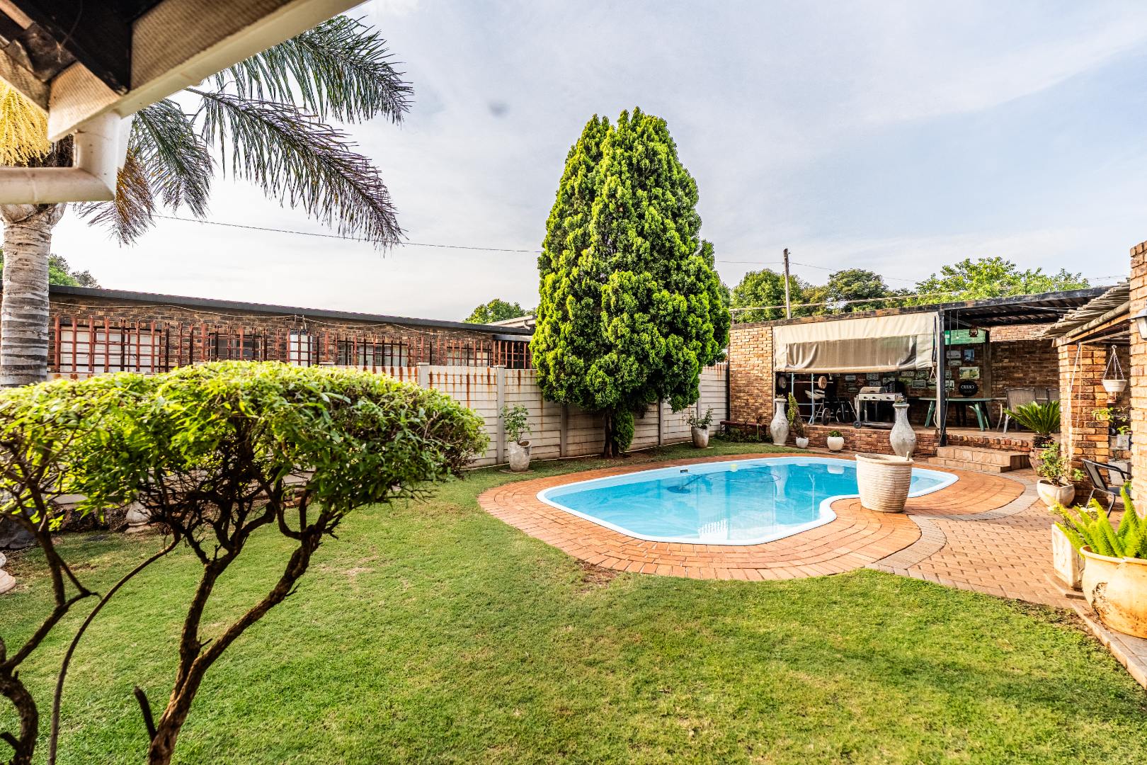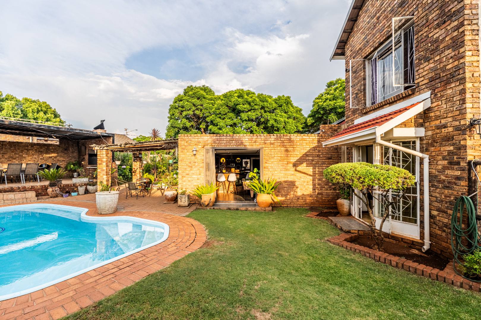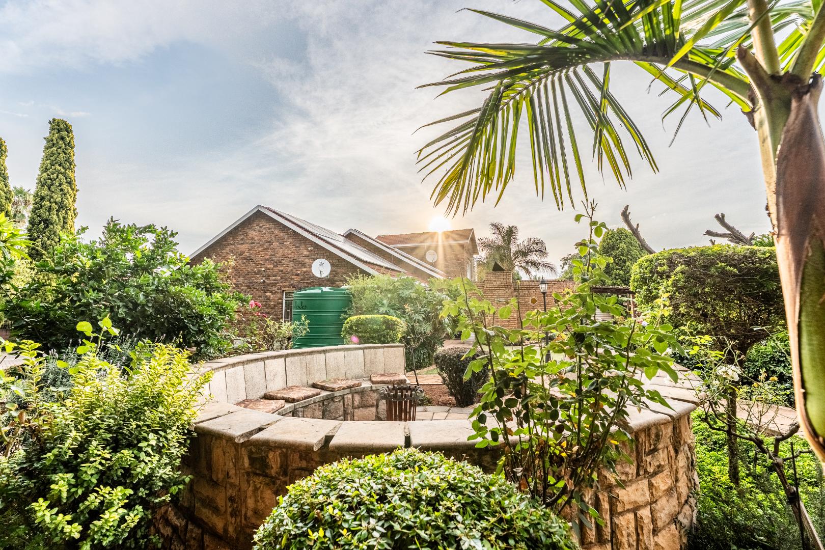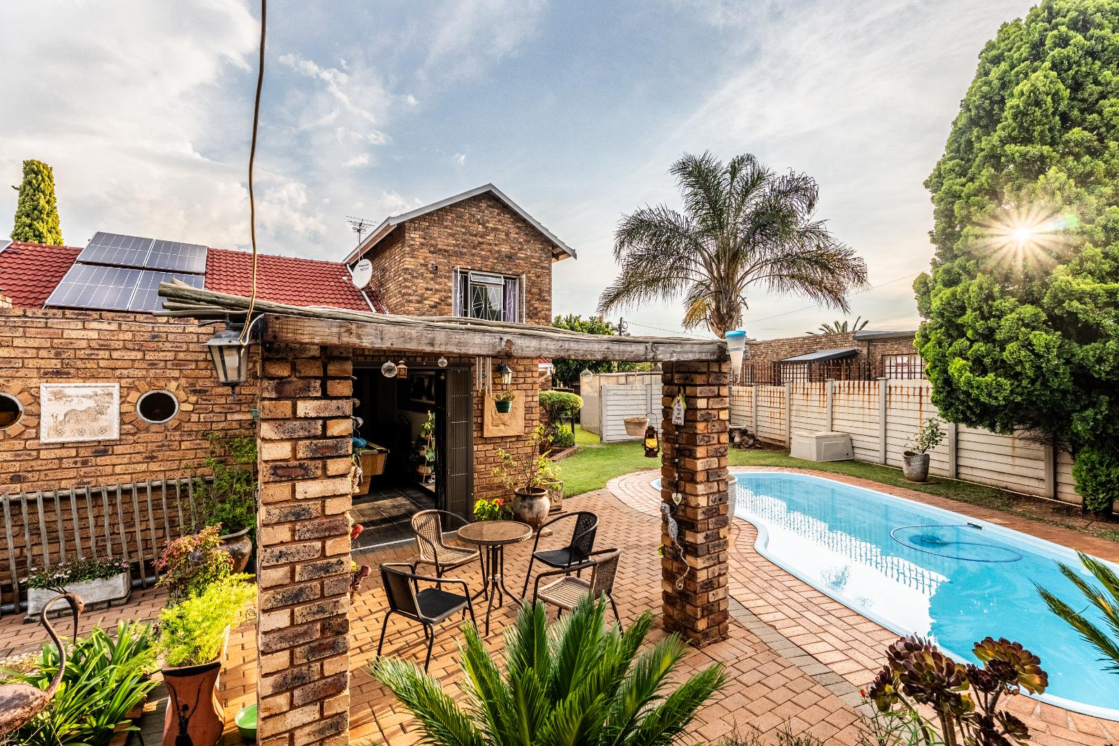 The exterior presents a traditional low maintenance brick facade complemented by a lush, well-established garden and extensive paved patio areas. A private swimming pool invites relaxation, while a dedicated outdoor entertainment area with a built-in bar is ideal for hosting gatherings. Sustainability is thoughtfully integrated with visible solar panels, a solar geyser, and a 5,000 liter Jojo water tank for water resilience, alongside a battery inverter system for energy independence (Lux Power 5KVA with 3 batteries). You will also find this property is registered with business rights making it the perfect work-from-home experience.
