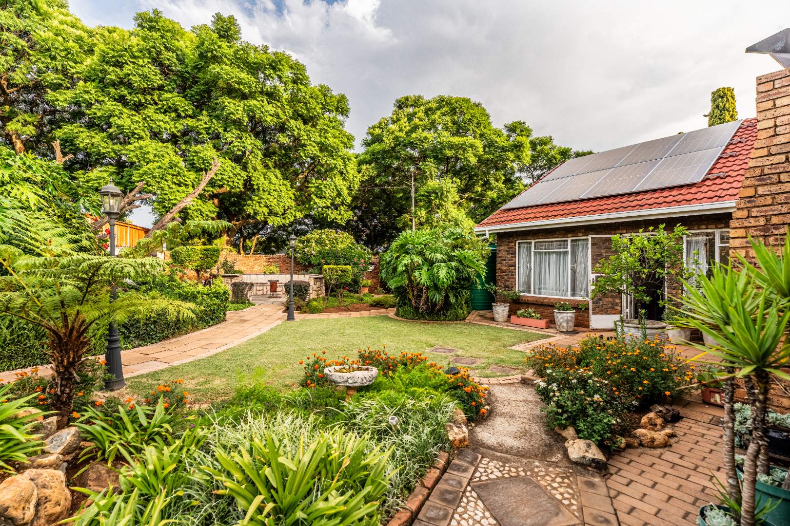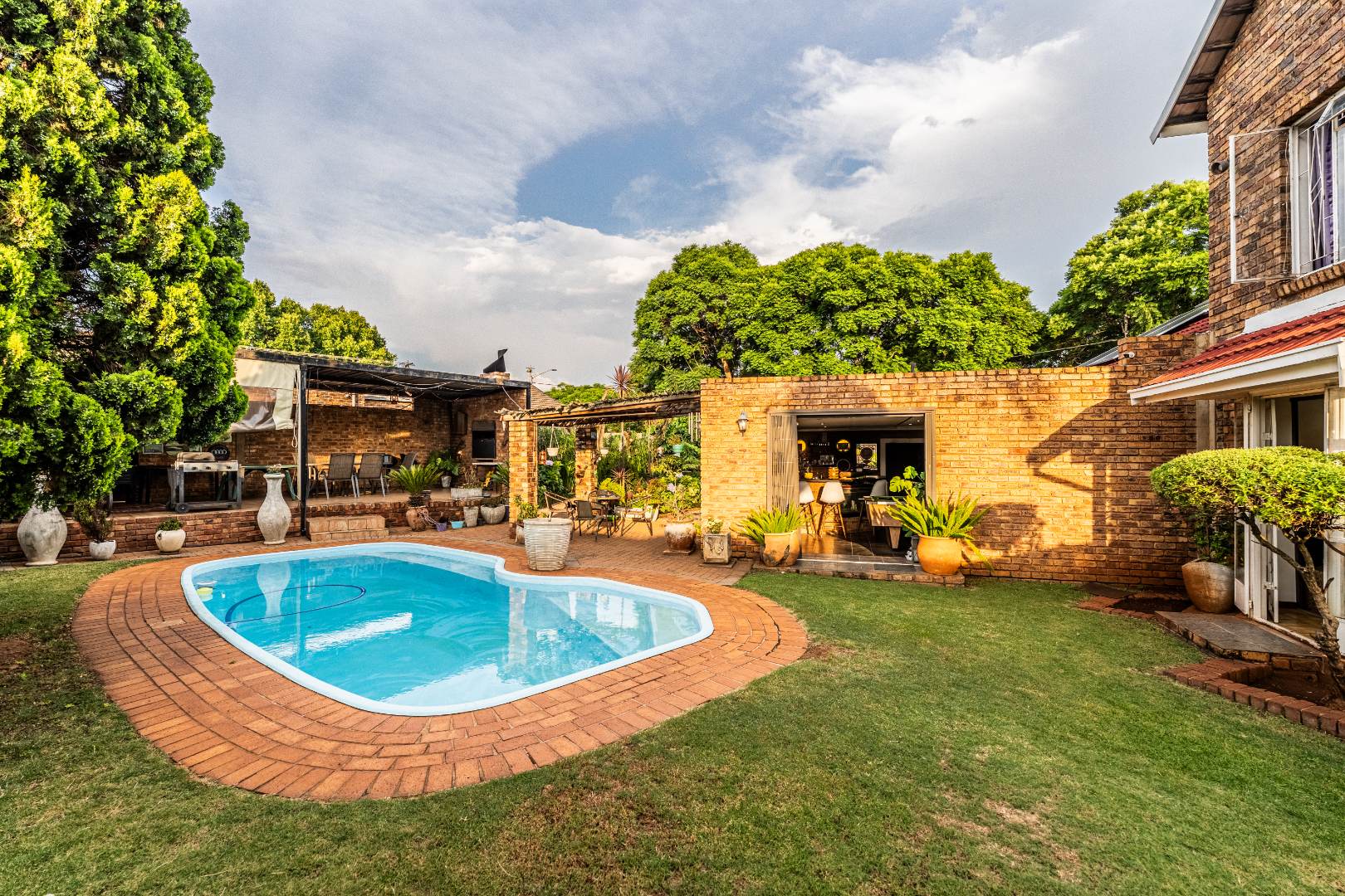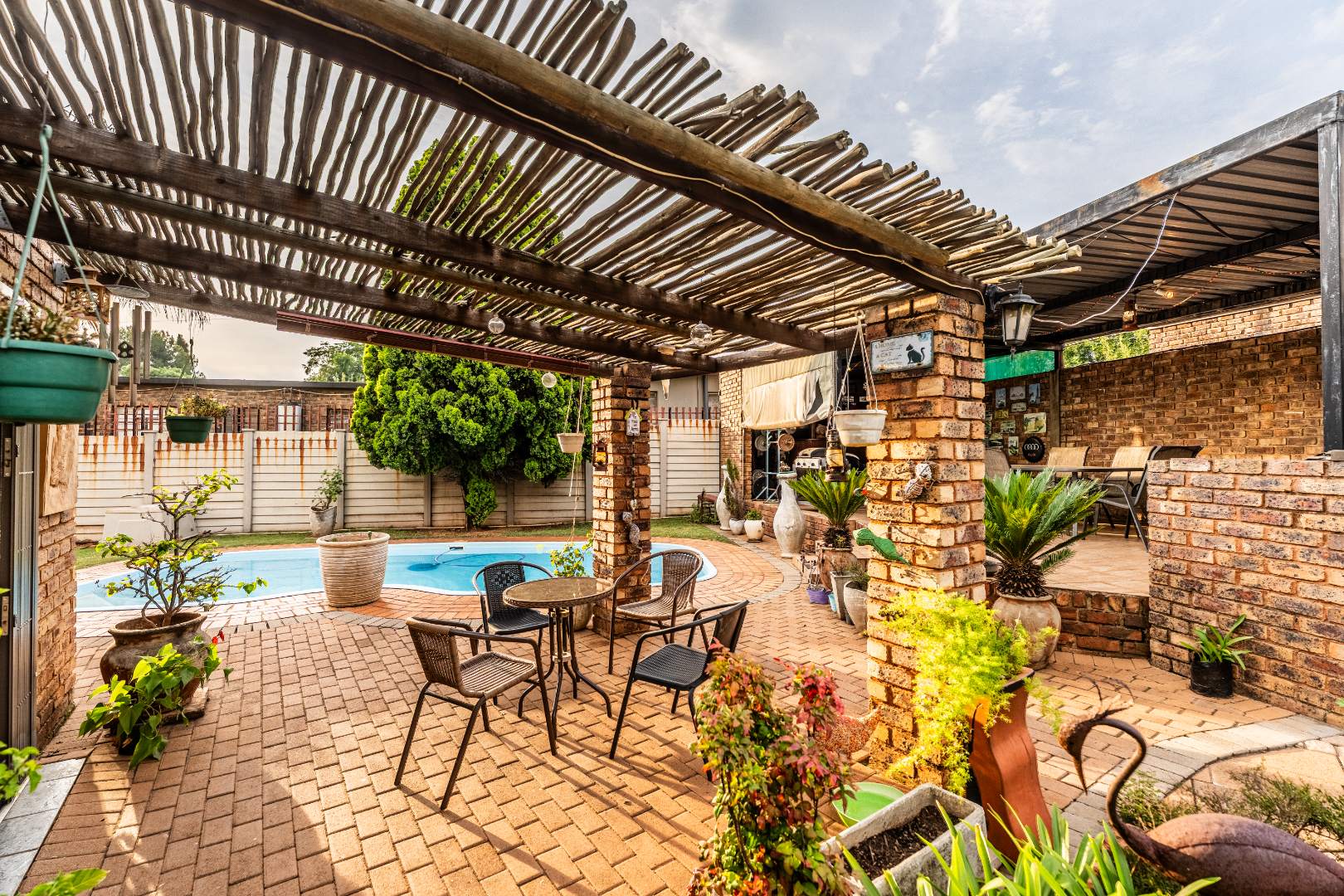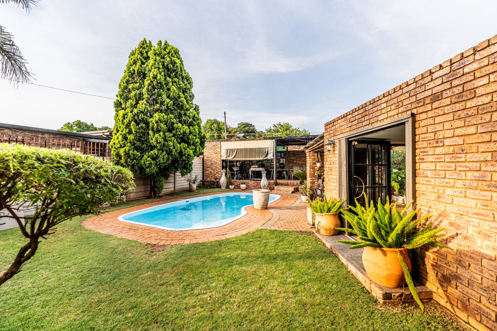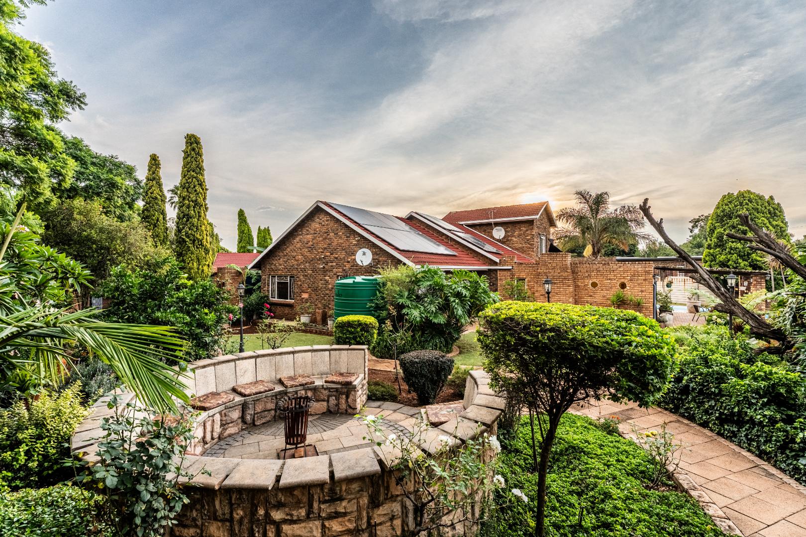 The exterior presents a traditional low maintenance brick facade complemented by a lush, well-established garden and extensive paved patio areas. A private swimming pool invites relaxation, while a dedicated outdoor entertainment area with a built-in bar is ideal for hosting gatherings. Sustainability is thoughtfully integrated with visible solar panels, a solar geyser, and a 5,000 liter Jojo water tank for water resilience, alongside a battery inverter system for energy independence (Lux Power 5KVA with 3 batteries). You will also find this property is registered with business rights making it the perfect work-from-home experience.