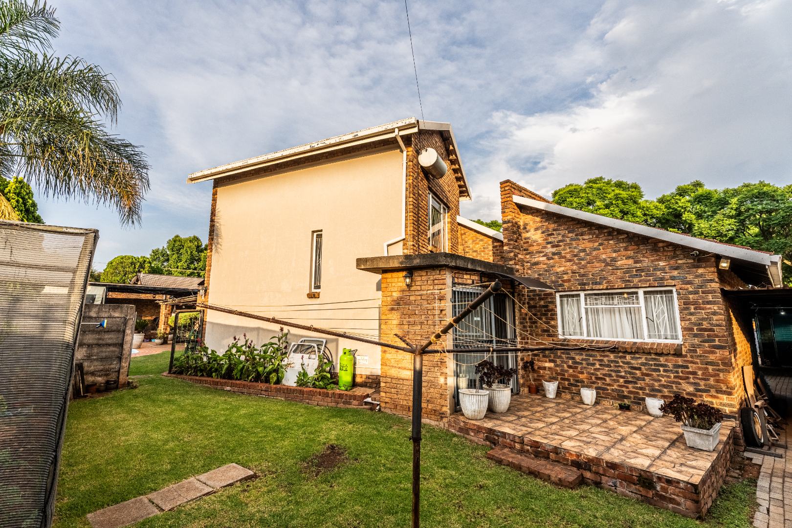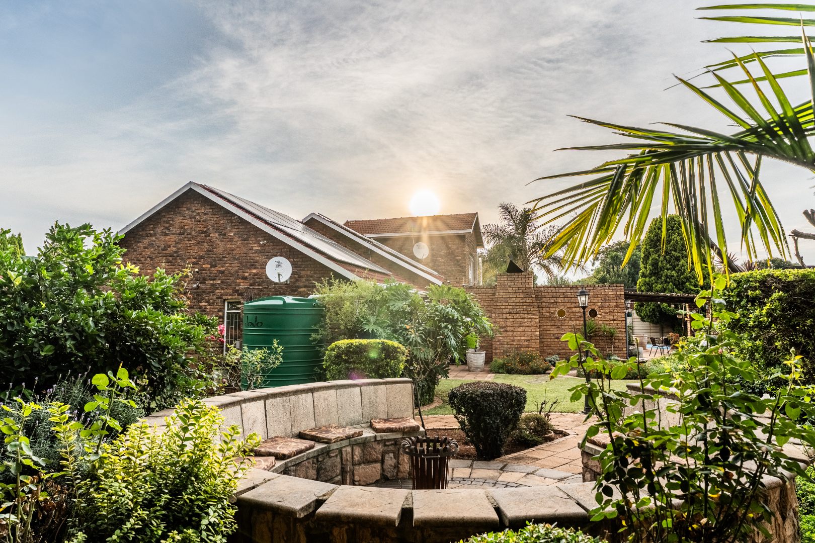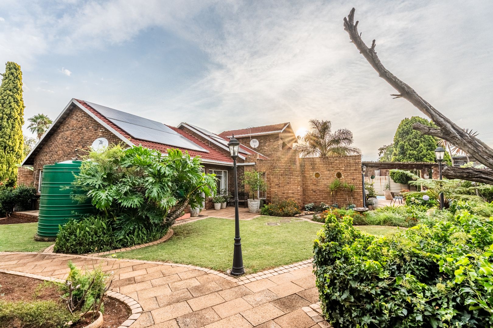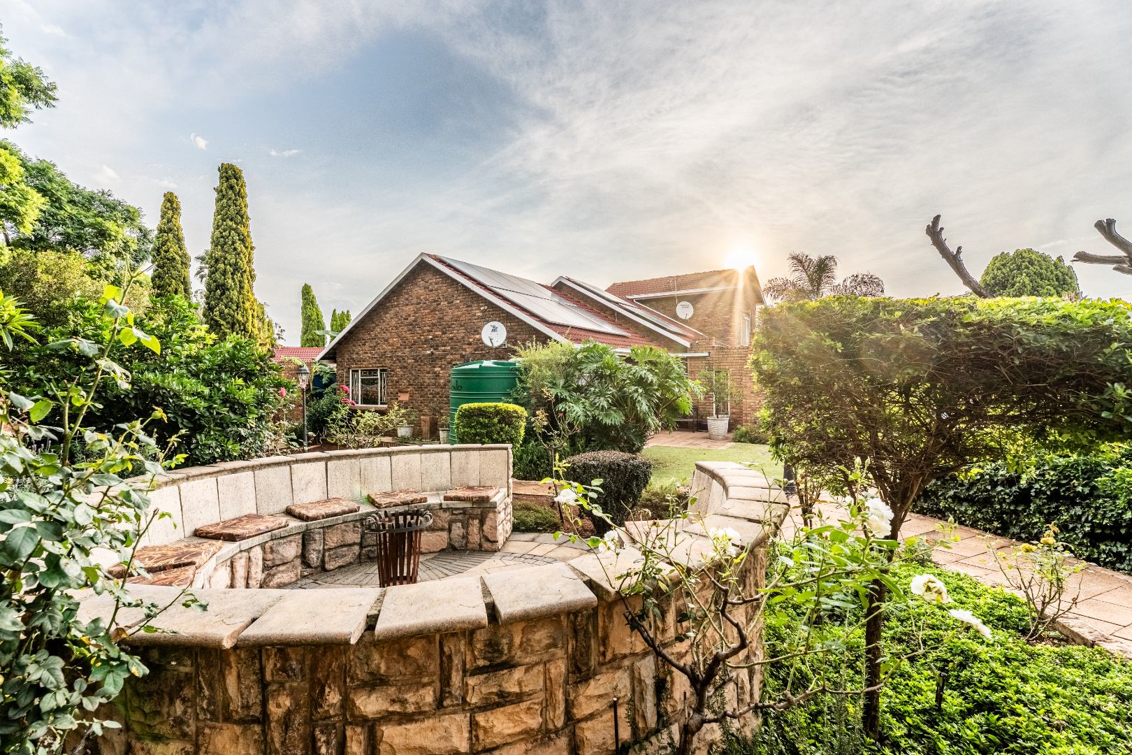 The exterior presents a traditional low maintenance brick facade complemented by a lush, well-established garden and extensive paved patio areas. A private swimming pool invites relaxation, while a dedicated outdoor entertainment area with a built-in bar is ideal for hosting gatherings. Sustainability is thoughtfully integrated with visible solar panels, a solar geyser, and a 5,000 liter Jojo water tank for water resilience, alongside a battery inverter system for energy independence (Lux Power 5KVA with 3 batteries). You will also find this property is registered with business rights making it the perfect work-from-home experience.