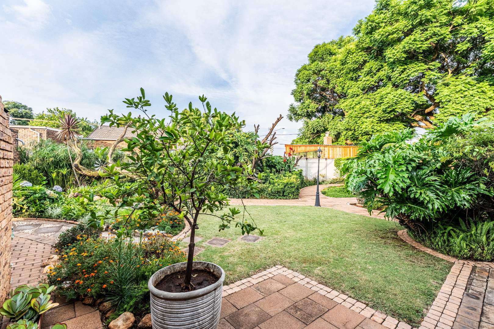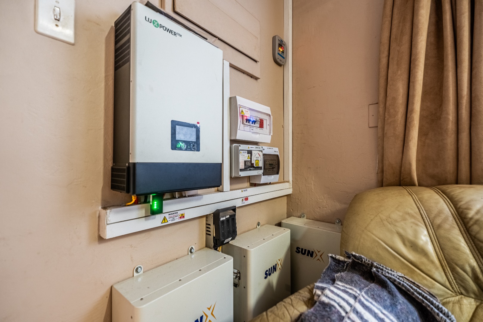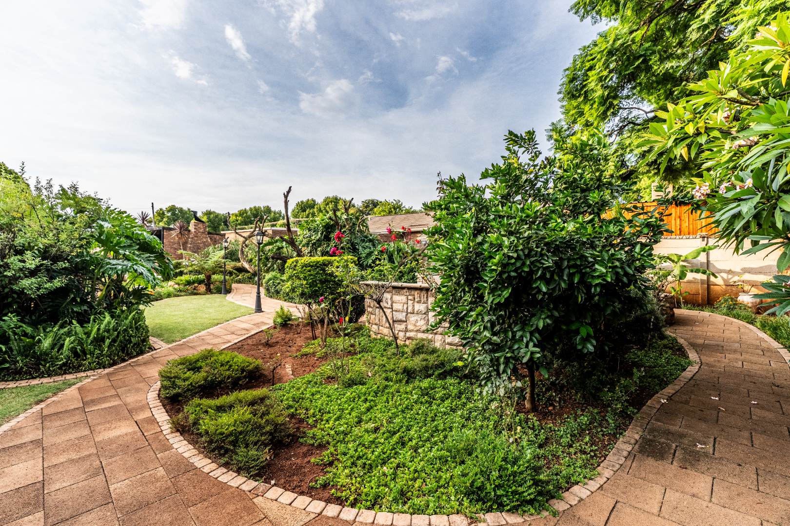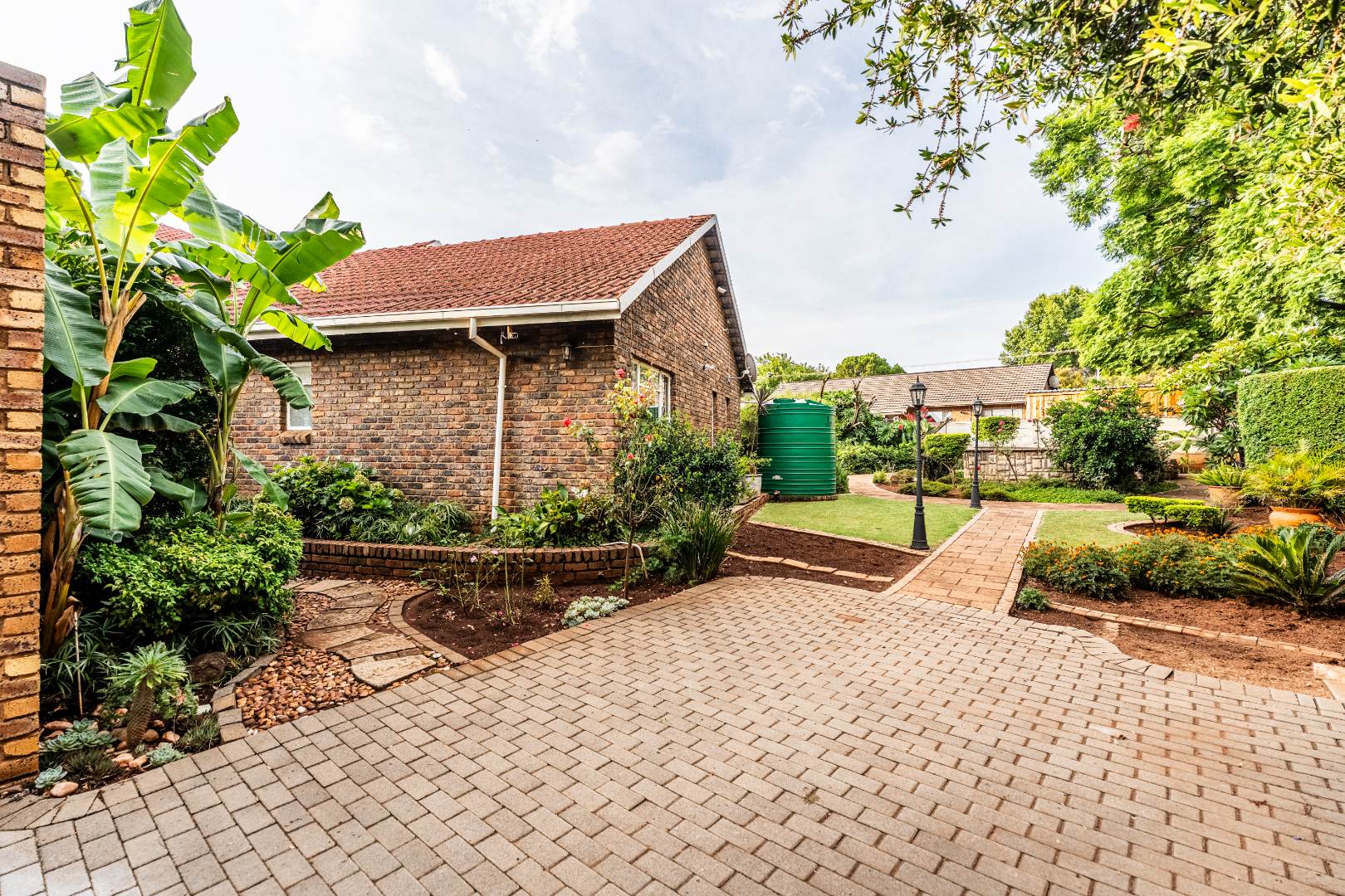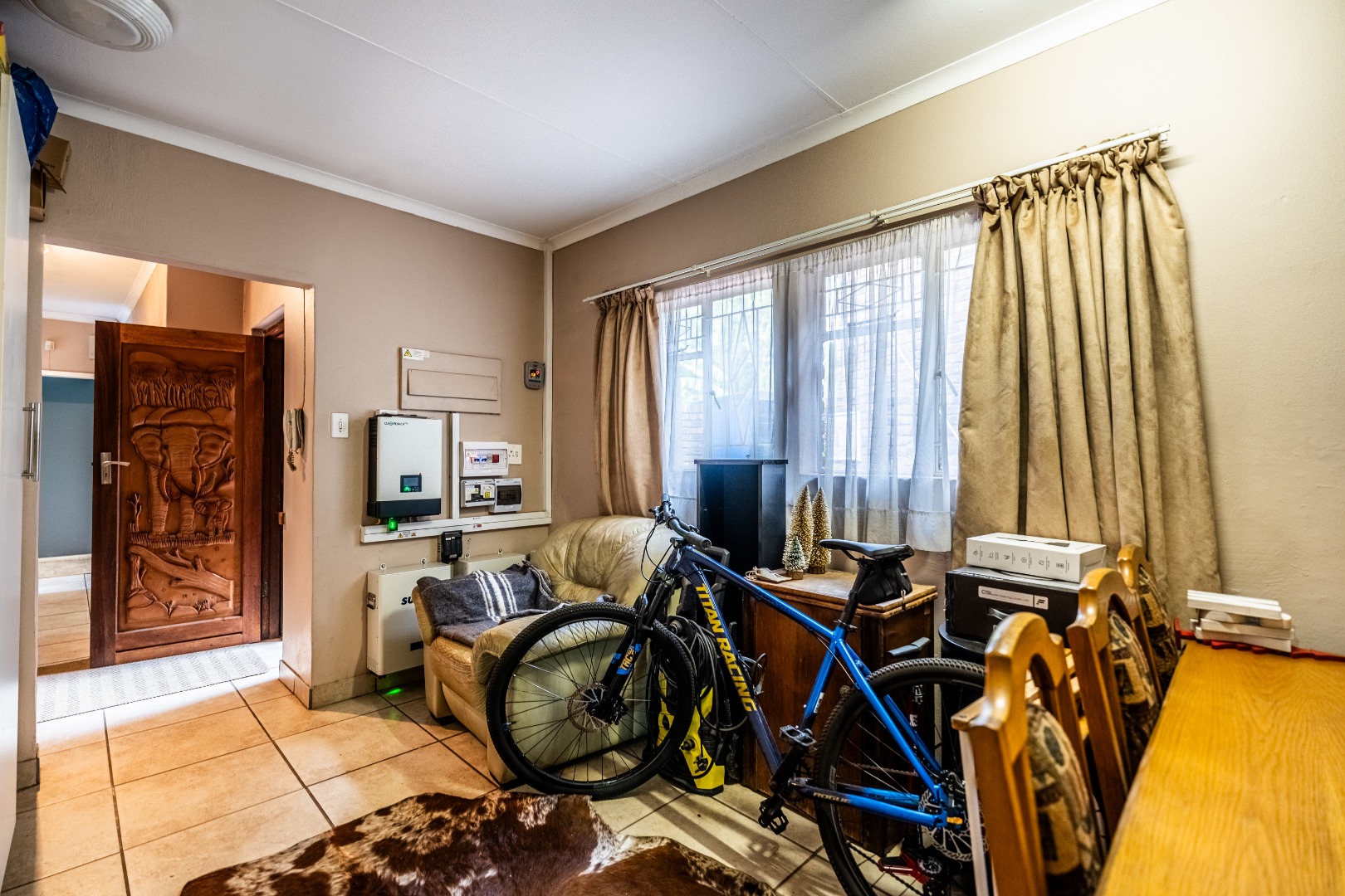 The exterior presents a traditional low maintenance brick facade complemented by a lush, well-established garden and extensive paved patio areas. A private swimming pool invites relaxation, while a dedicated outdoor entertainment area with a built-in bar is ideal for hosting gatherings. Sustainability is thoughtfully integrated with visible solar panels, a solar geyser, and a 5,000 liter Jojo water tank for water resilience, alongside a battery inverter system for energy independence (Lux Power 5KVA with 3 batteries). You will also find this property is registered with business rights making it the perfect work-from-home experience.