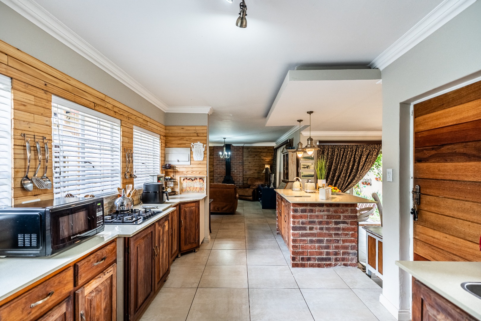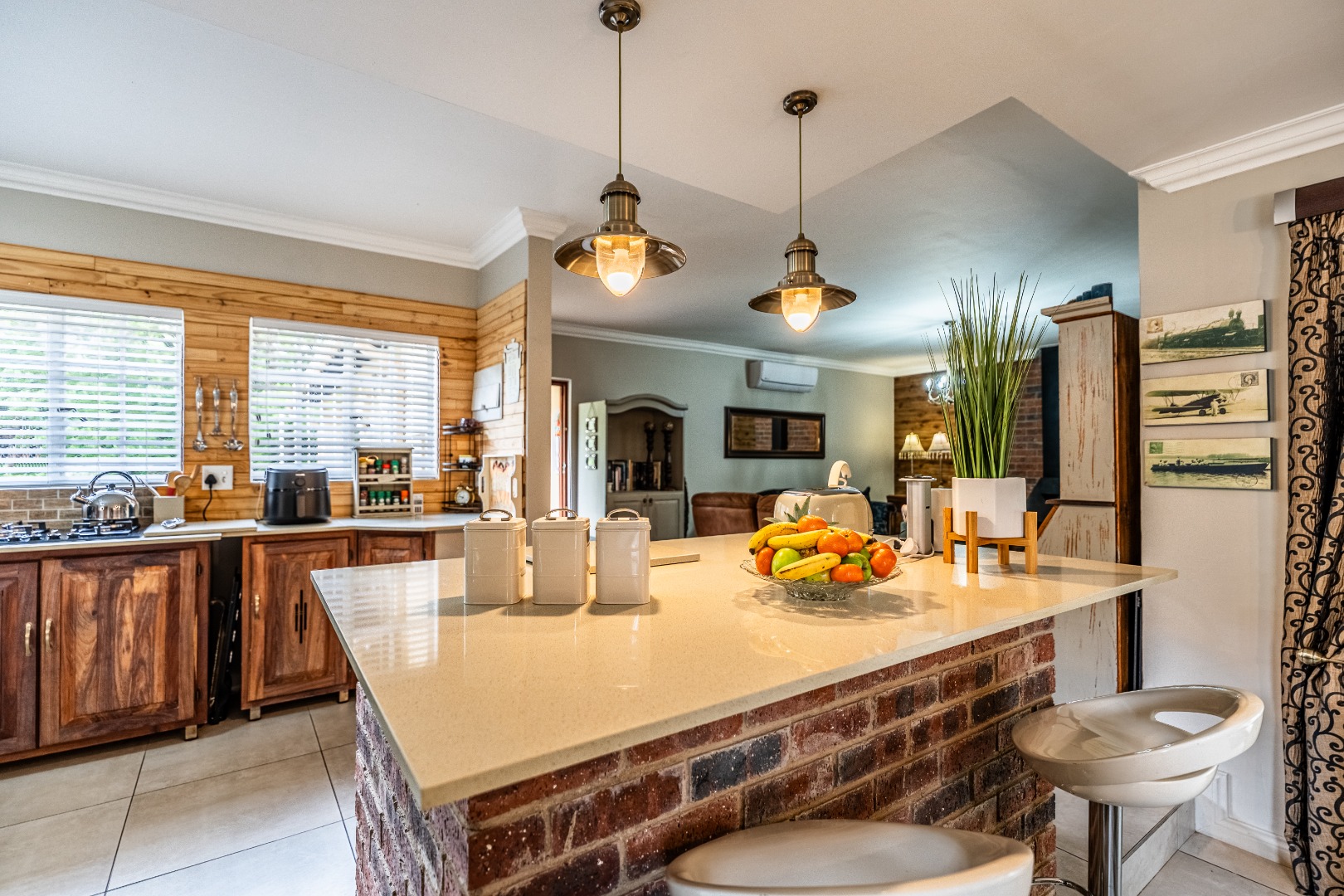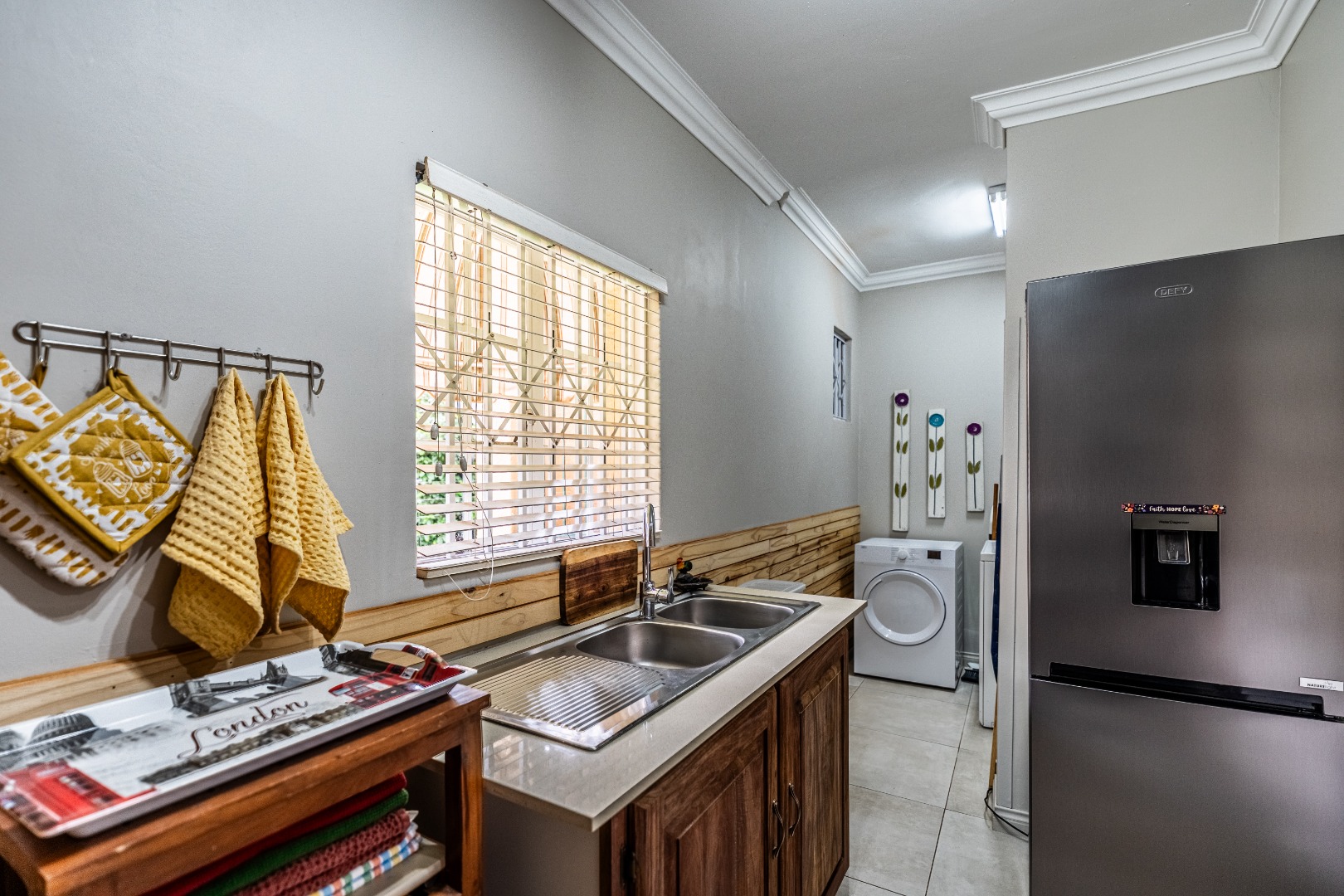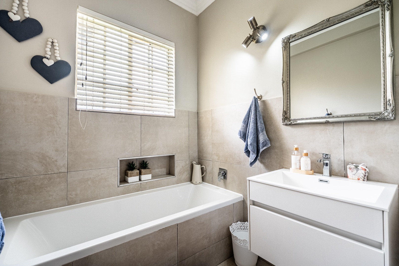 The residence comprises three comfortable bedrooms, including a luxurious main bedroom with a private en-suite bathroom, complete with a double shower and double basins, and provision for a gas geyser. A second well-appointed bathroom serves the remaining bedrooms. For those working from home, a dedicated office provides a convenient and productive space. Security is paramount, with an 8-channel CCTV camera system, an alarm system with outside beams, an access gate, burglar bars, and security gates ensuring peace of mind.
