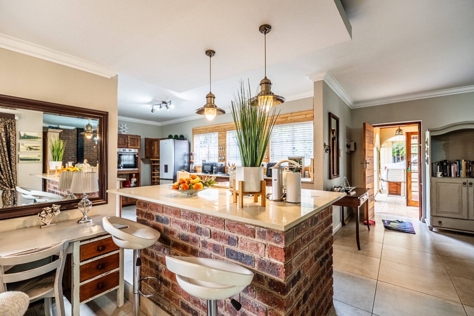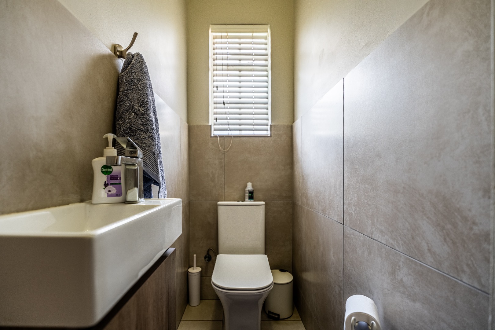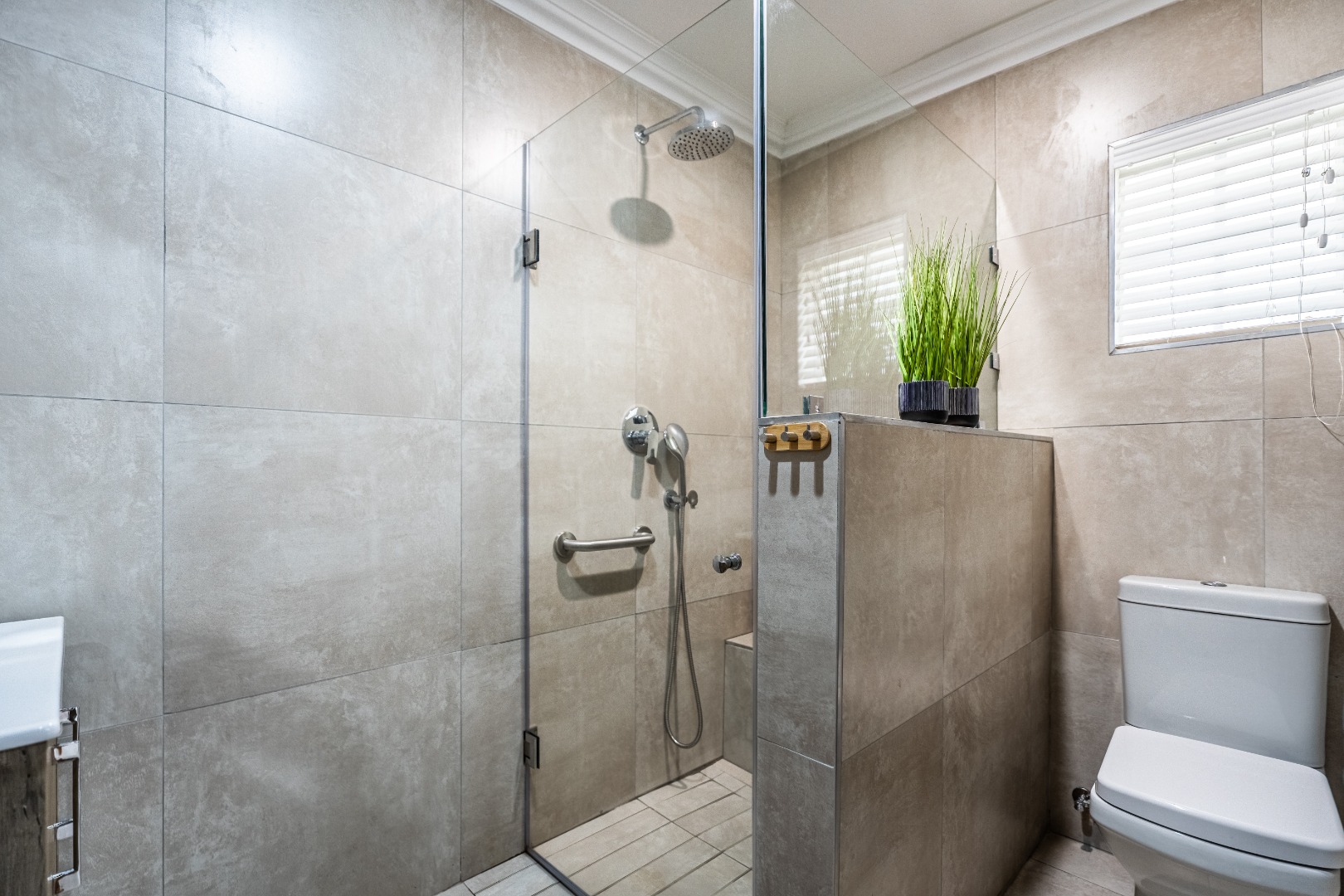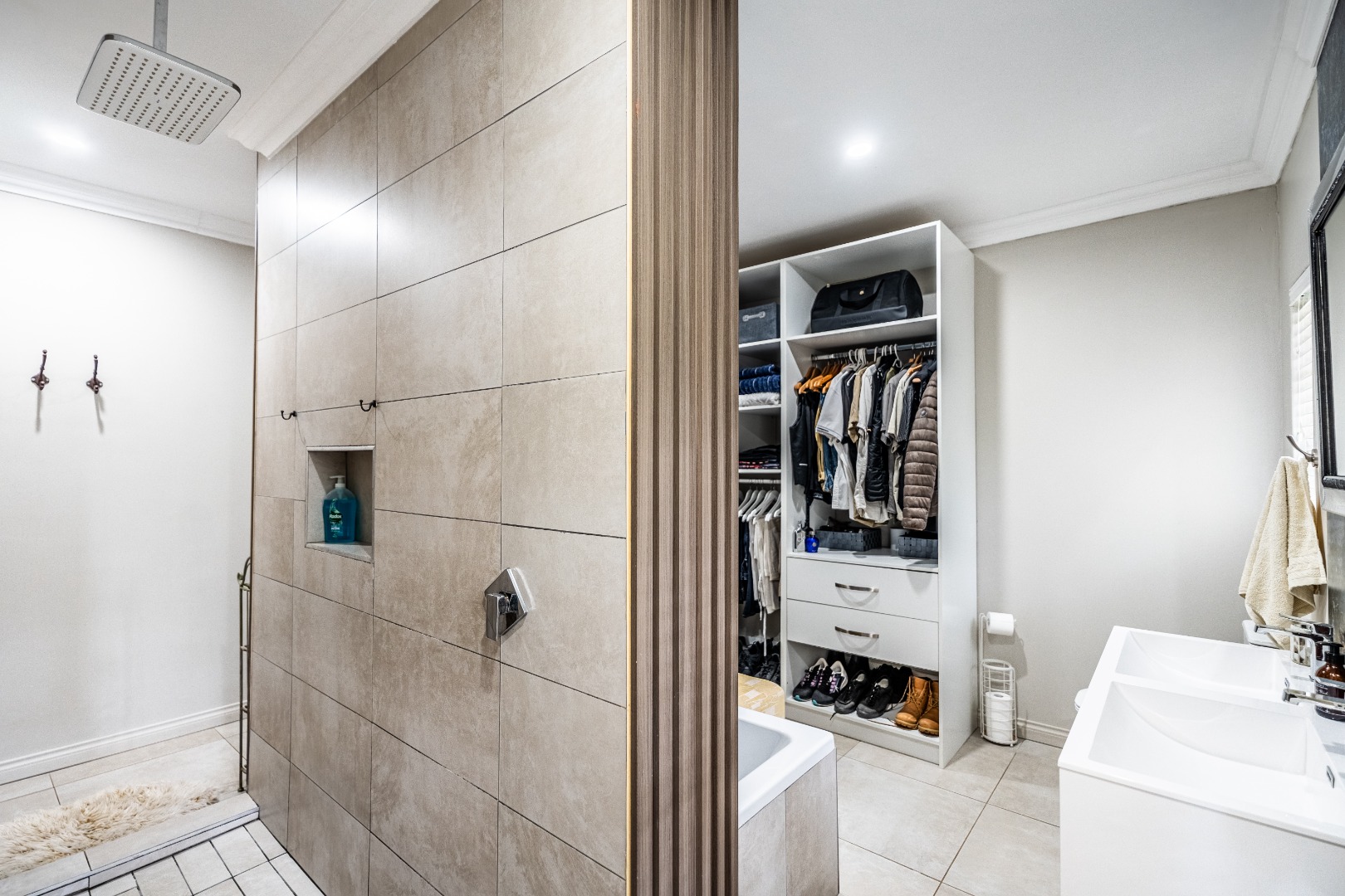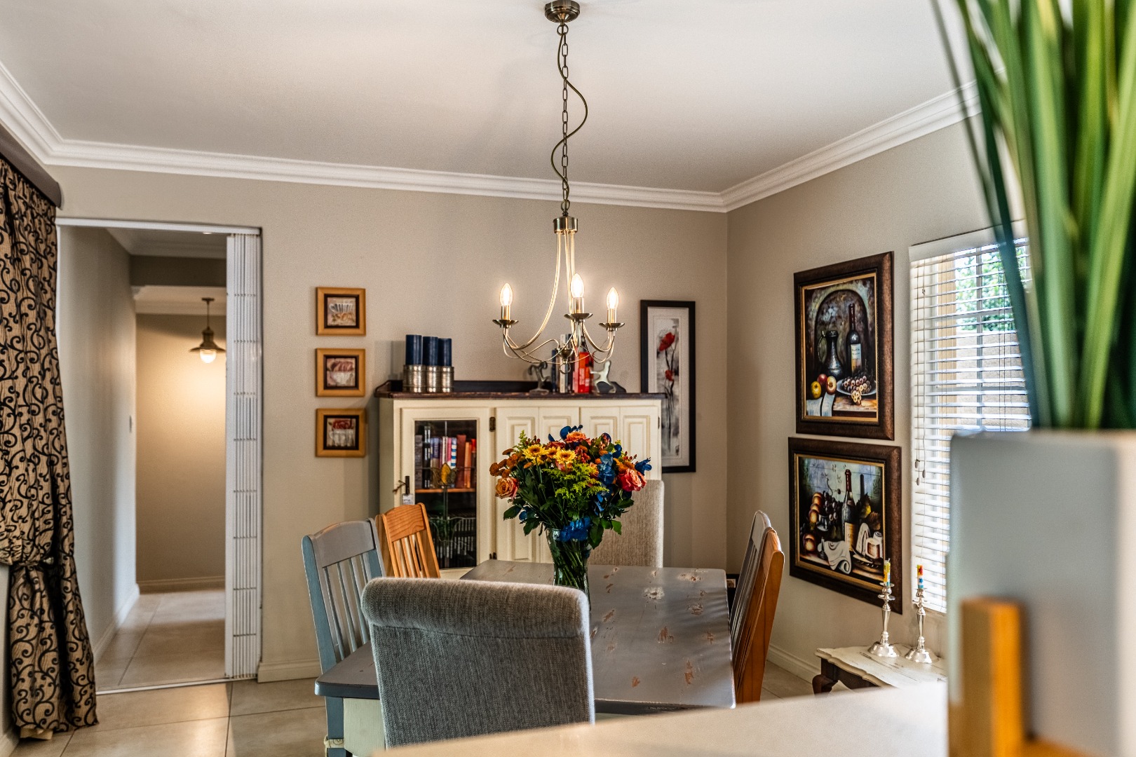 The residence comprises three comfortable bedrooms, including a luxurious main bedroom with a private en-suite bathroom, complete with a double shower and double basins, and provision for a gas geyser. A second well-appointed bathroom serves the remaining bedrooms. For those working from home, a dedicated office provides a convenient and productive space. Security is paramount, with an 8-channel CCTV camera system, an alarm system with outside beams, an access gate, burglar bars, and security gates ensuring peace of mind.