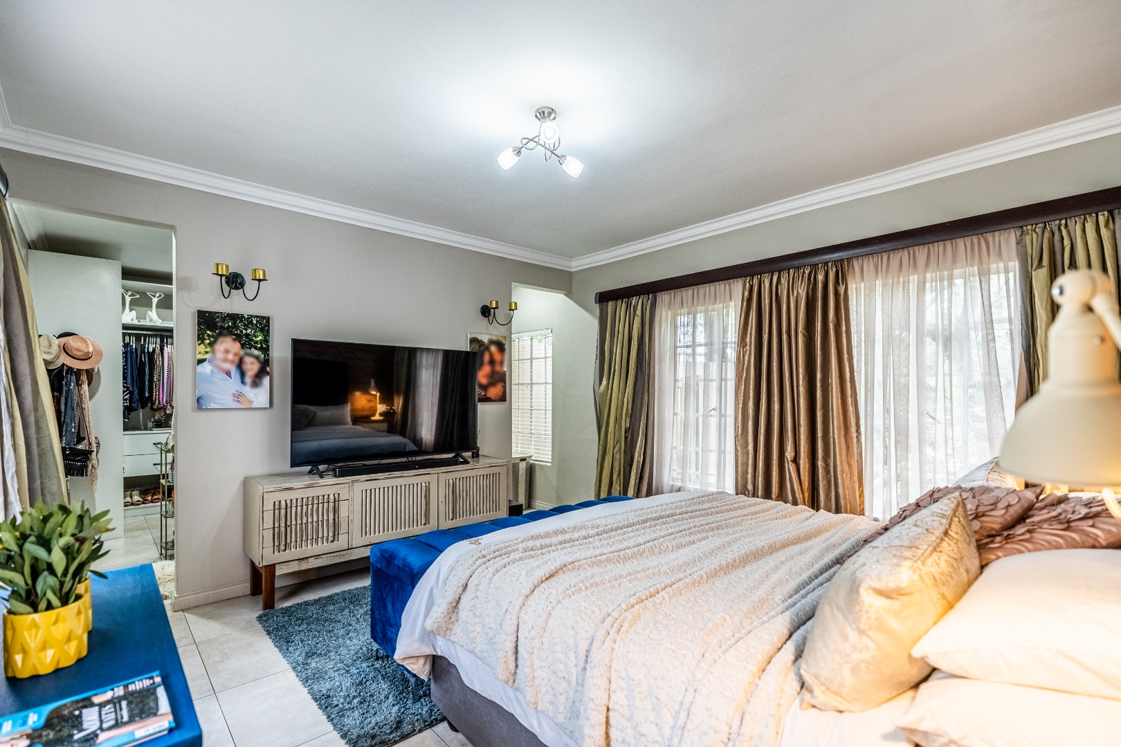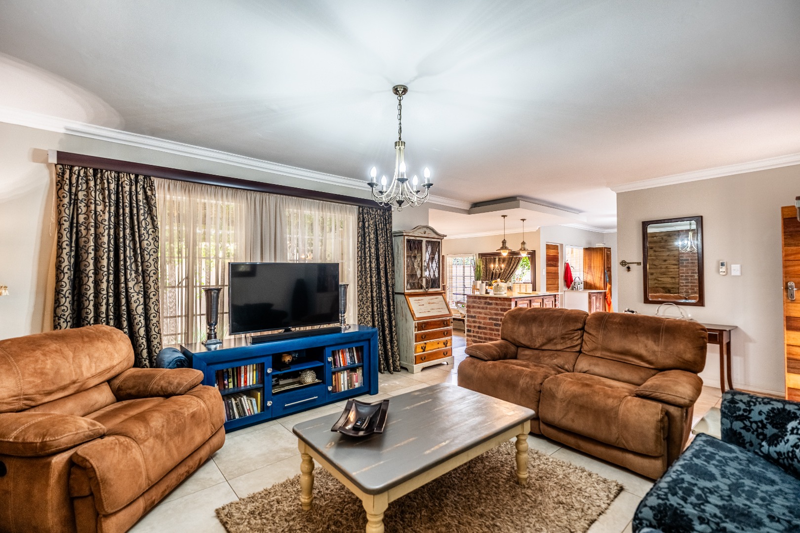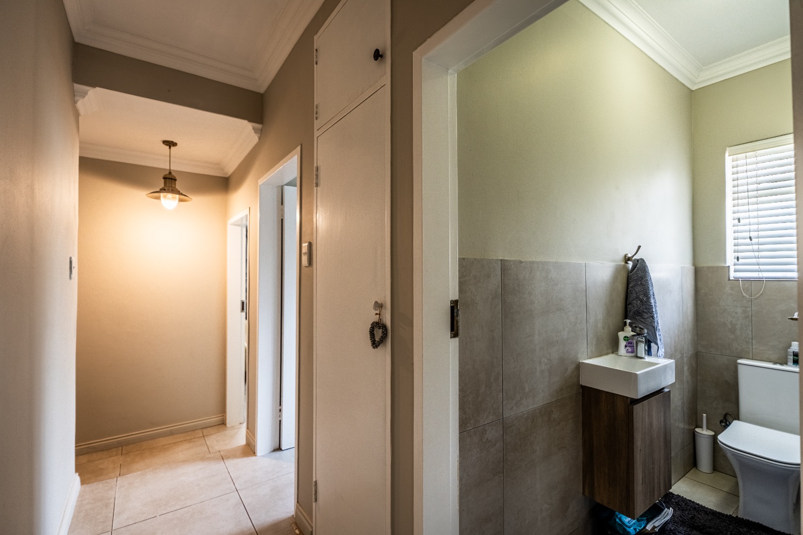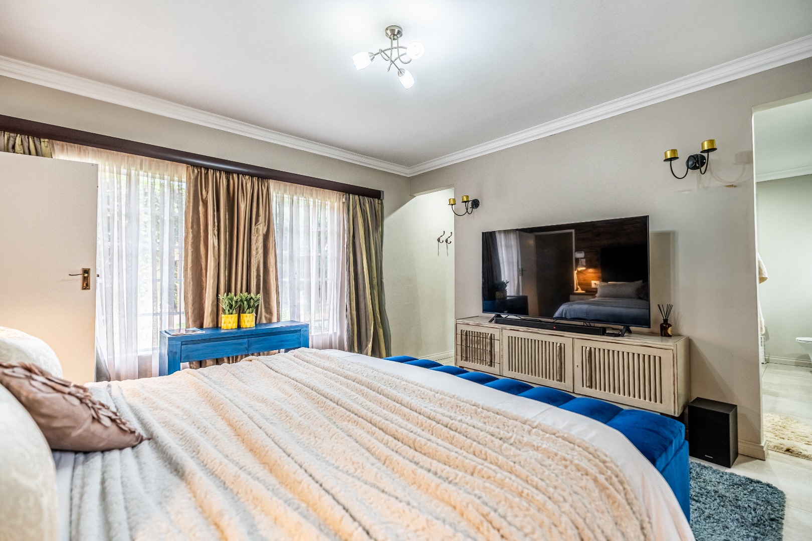 The residence comprises three comfortable bedrooms, including a luxurious main bedroom with a private en-suite bathroom, complete with a double shower and double basins, and provision for a gas geyser. A second well-appointed bathroom serves the remaining bedrooms. For those working from home, a dedicated office provides a convenient and productive space. Security is paramount, with an 8-channel CCTV camera system, an alarm system with outside beams, an access gate, burglar bars, and security gates ensuring peace of mind.