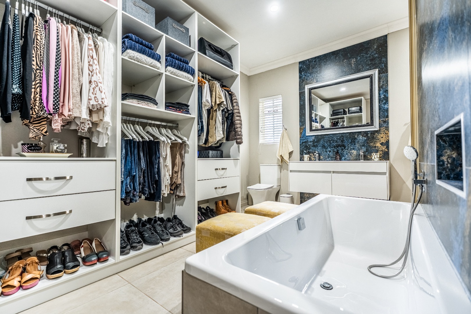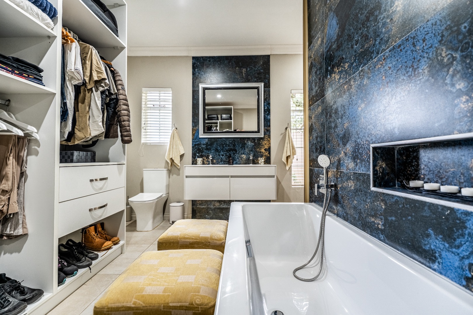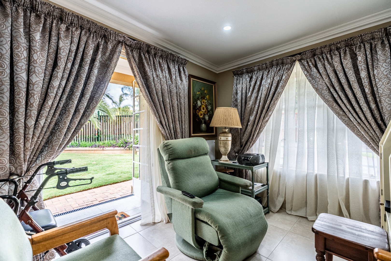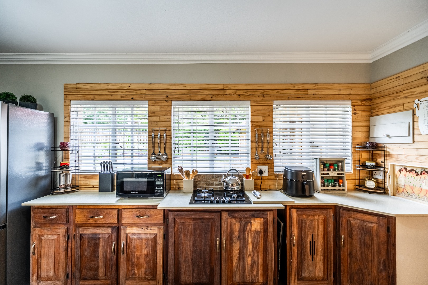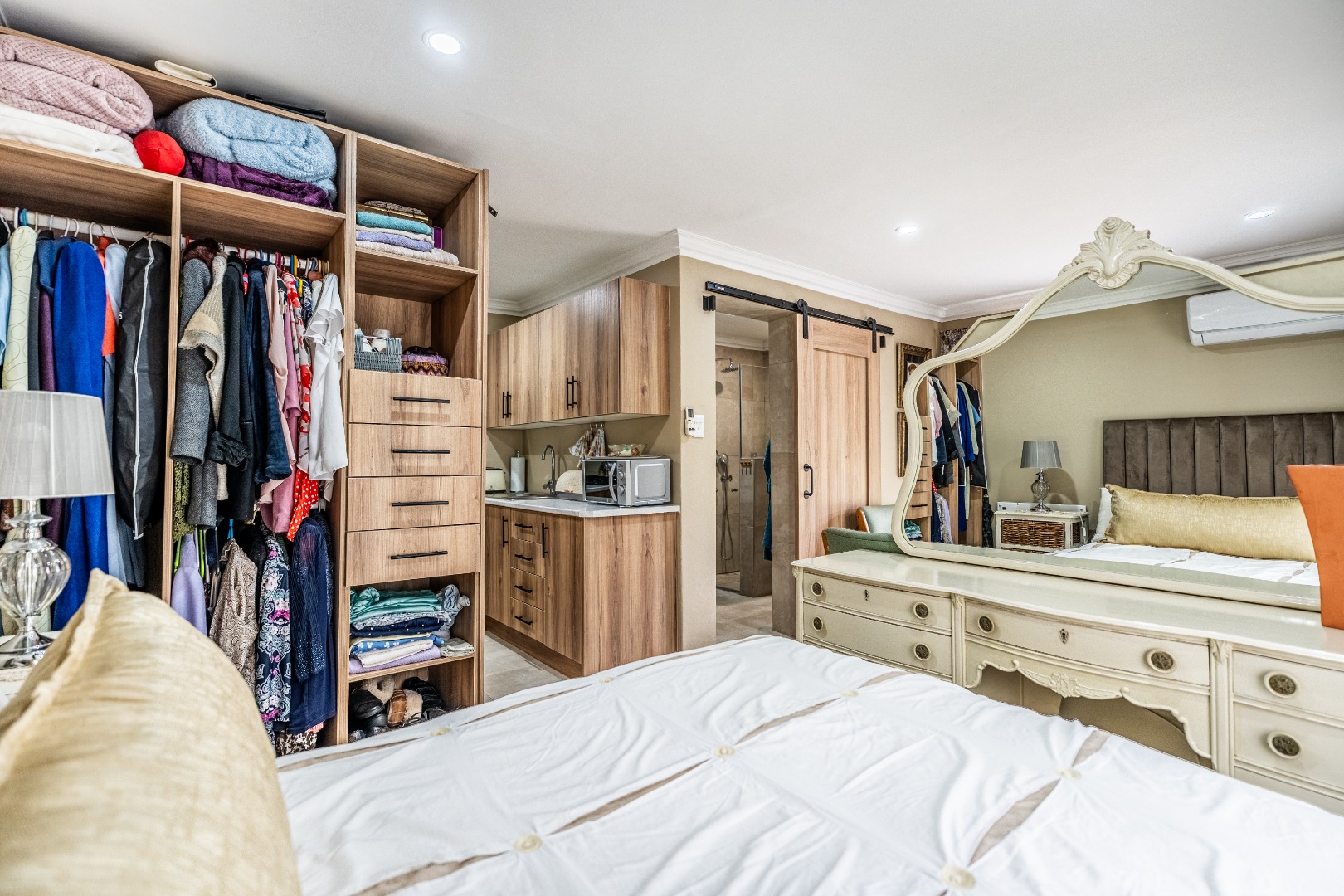 The residence comprises three comfortable bedrooms, including a luxurious main bedroom with a private en-suite bathroom, complete with a double shower and double basins, and provision for a gas geyser. A second well-appointed bathroom serves the remaining bedrooms. For those working from home, a dedicated office provides a convenient and productive space. Security is paramount, with an 8-channel CCTV camera system, an alarm system with outside beams, an access gate, burglar bars, and security gates ensuring peace of mind.