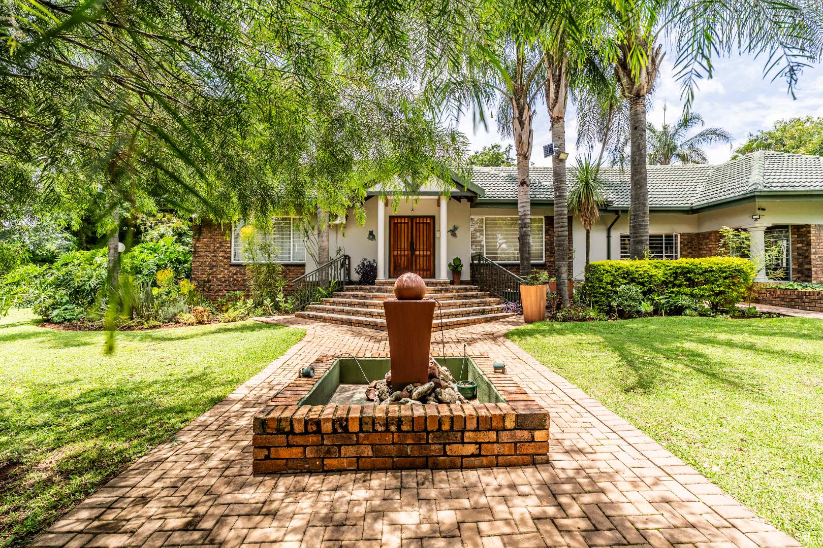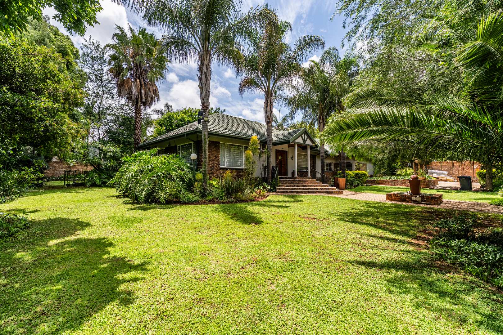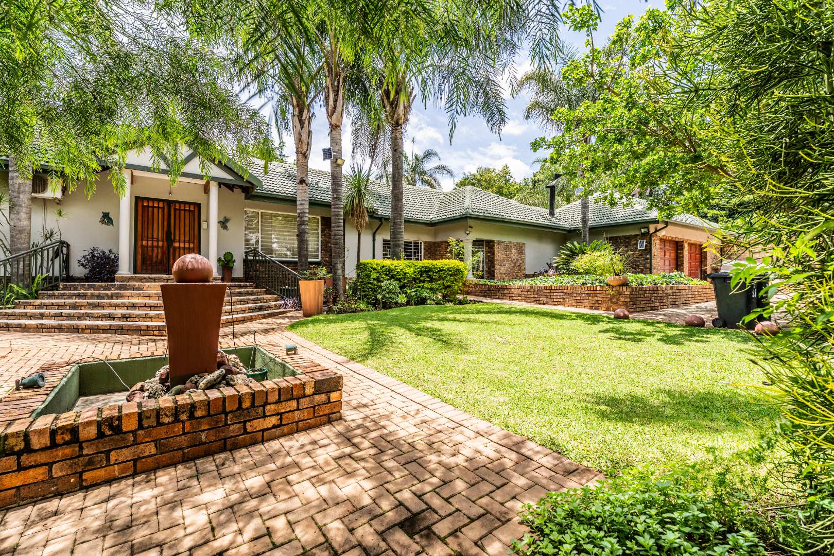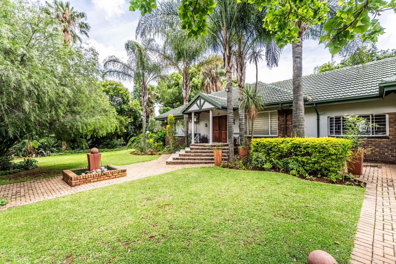 Upon arrival, you are greeted by a lush, well-maintained garden with mature trees and attractive brick pathways leading to an elevated entrance featuring a decorative water feature, enhancing its curb appeal. The interior presents an inviting entrance hall and multiple living areas, including a family TV room, all benefiting from abundant natural light. A functional fireplace adds warmth and ambiance, while the open-plan design seamlessly connects living spaces.