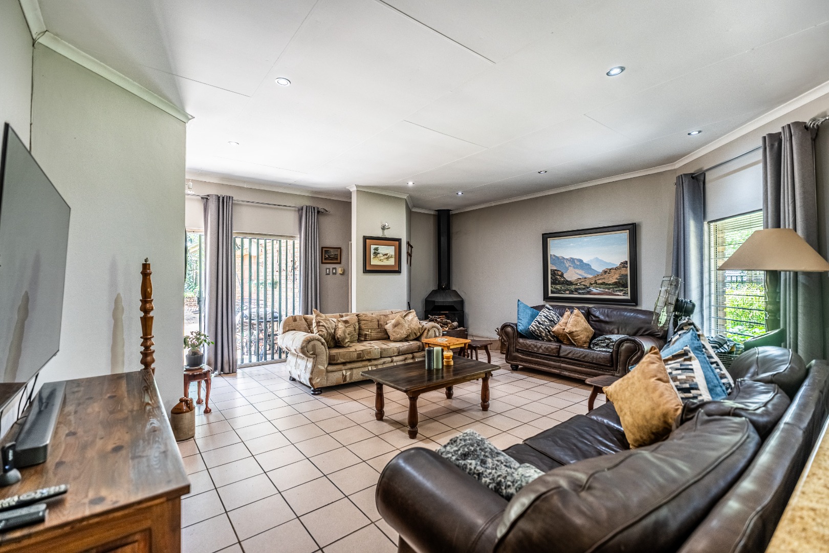 Outdoor living is a delight with a private patio, a refreshing swimming pool, ideal for relaxation and entertaining guests. The property also includes 1 outside room and a 2.5-car garage. Security is well-addressed with an alarm system, electric fencing, an access gate, burglar bars, and a security gate, ensuring peace of mind. Fibre connectivity is available.