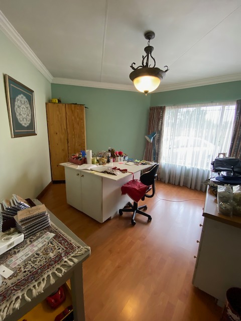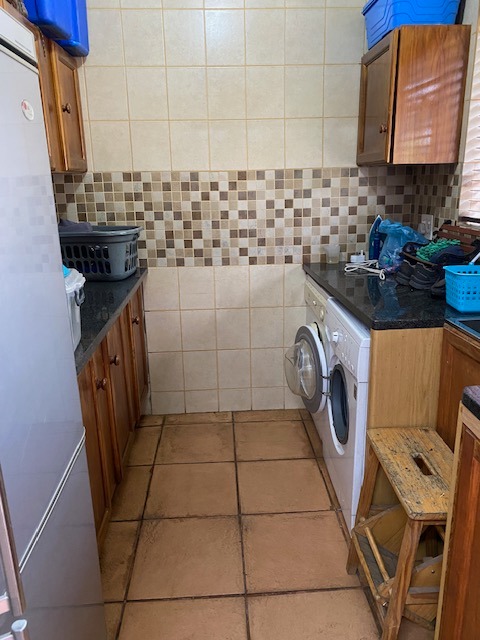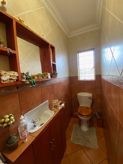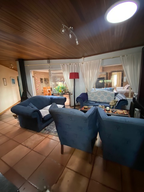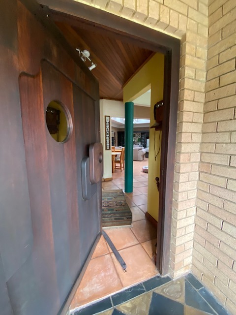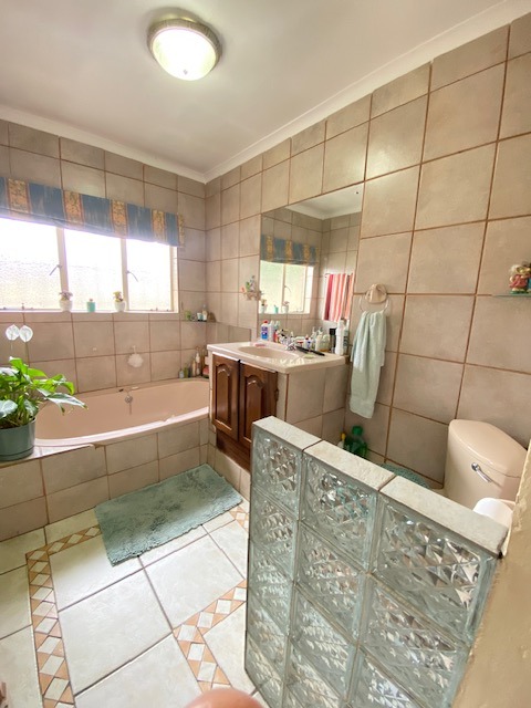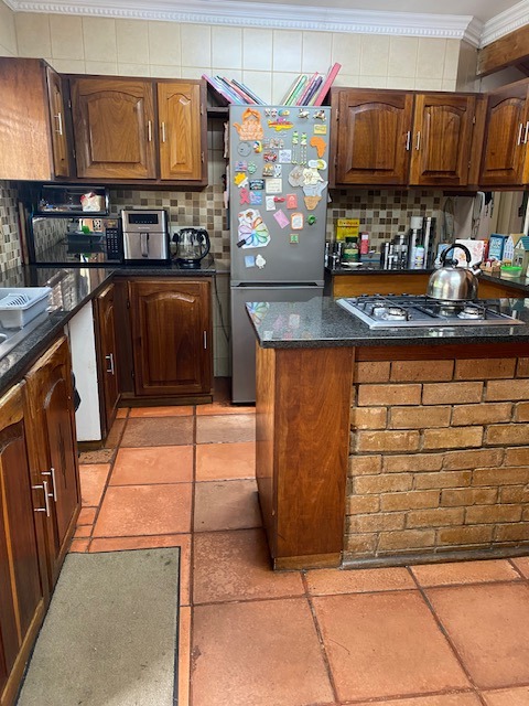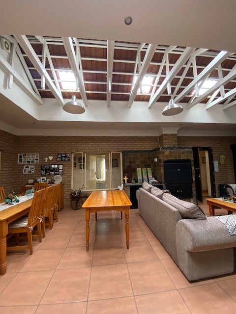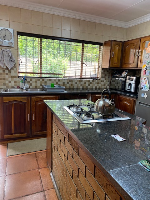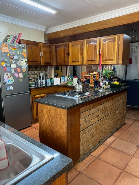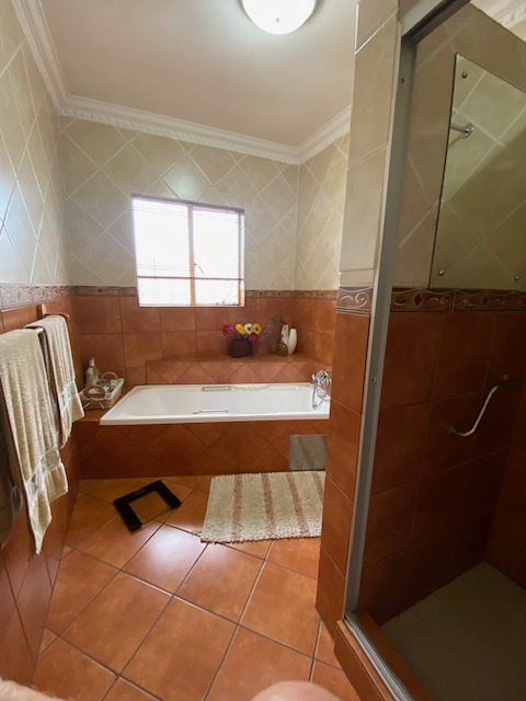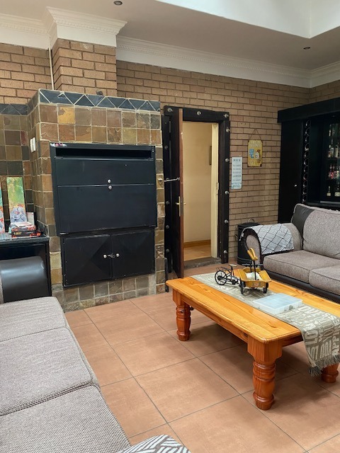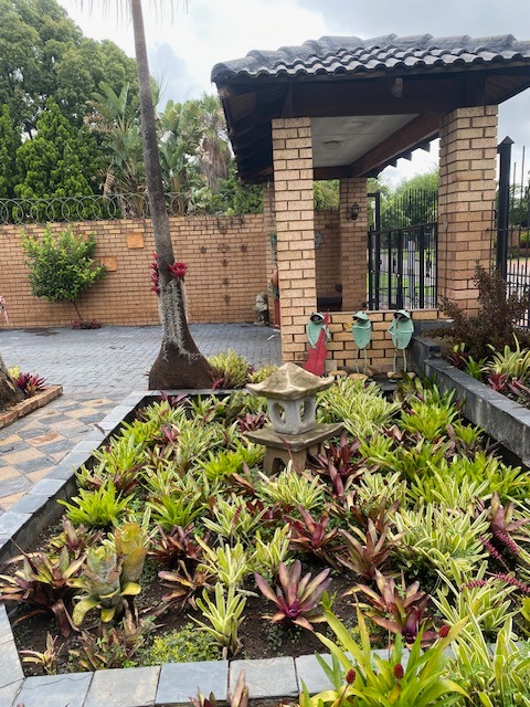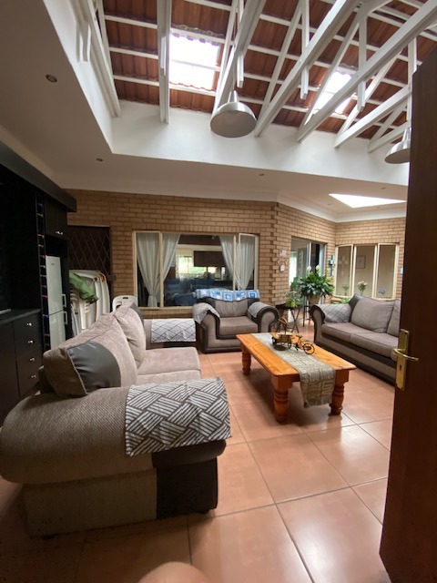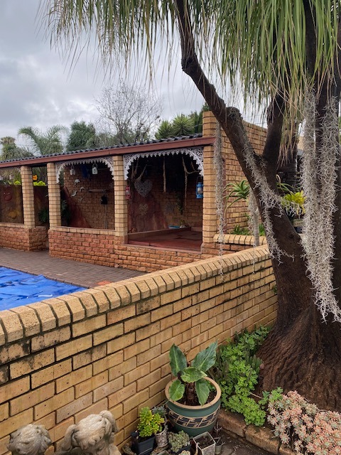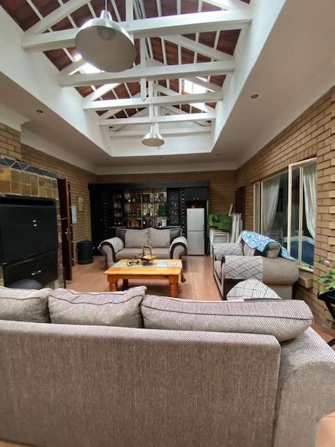 This distinguished four-bedroom residence in Zwartkop, Centurion, presents a secure and inviting facade within a gated community. The interior features an open-plan design with three lounges, including a family TV room, and a dedicated study. Unique vaulted wooden ceilings with exposed beams and terracotta flooring add character, while a built-in bar and jacuzzi enhance leisure. The spacious kitchen is equipped with a gas hob on a functional island, granite countertops, and ample wooden cabinetry. Four bedrooms and two bathrooms, including an en-suite, provide comfortable accommodation. Outdoors, the 1252 sqm erf boasts a swimming pool, built-in braai, and a meticulously maintained garden with an irrigation system. Six garages, solar panels, water tanks, and fibre connectivity complete this comprehensive offering.
