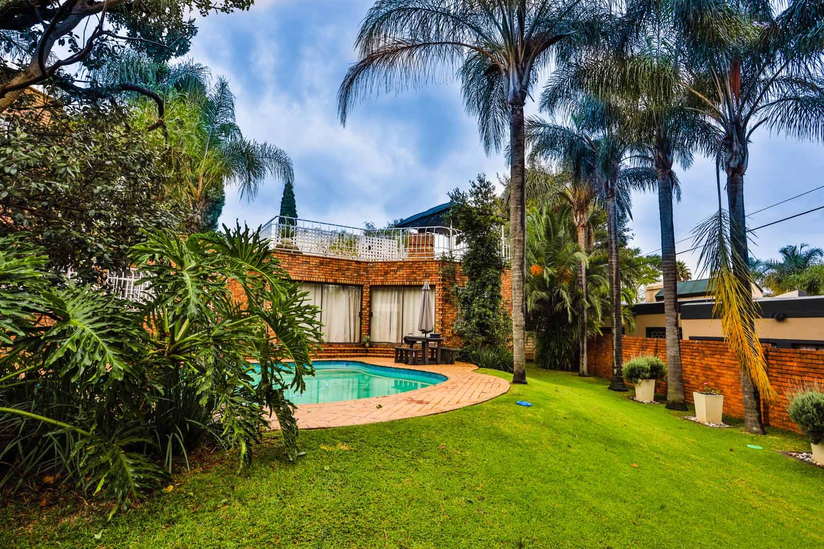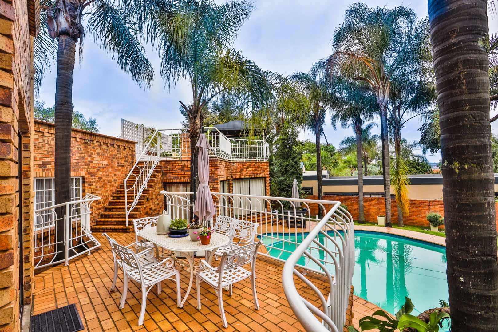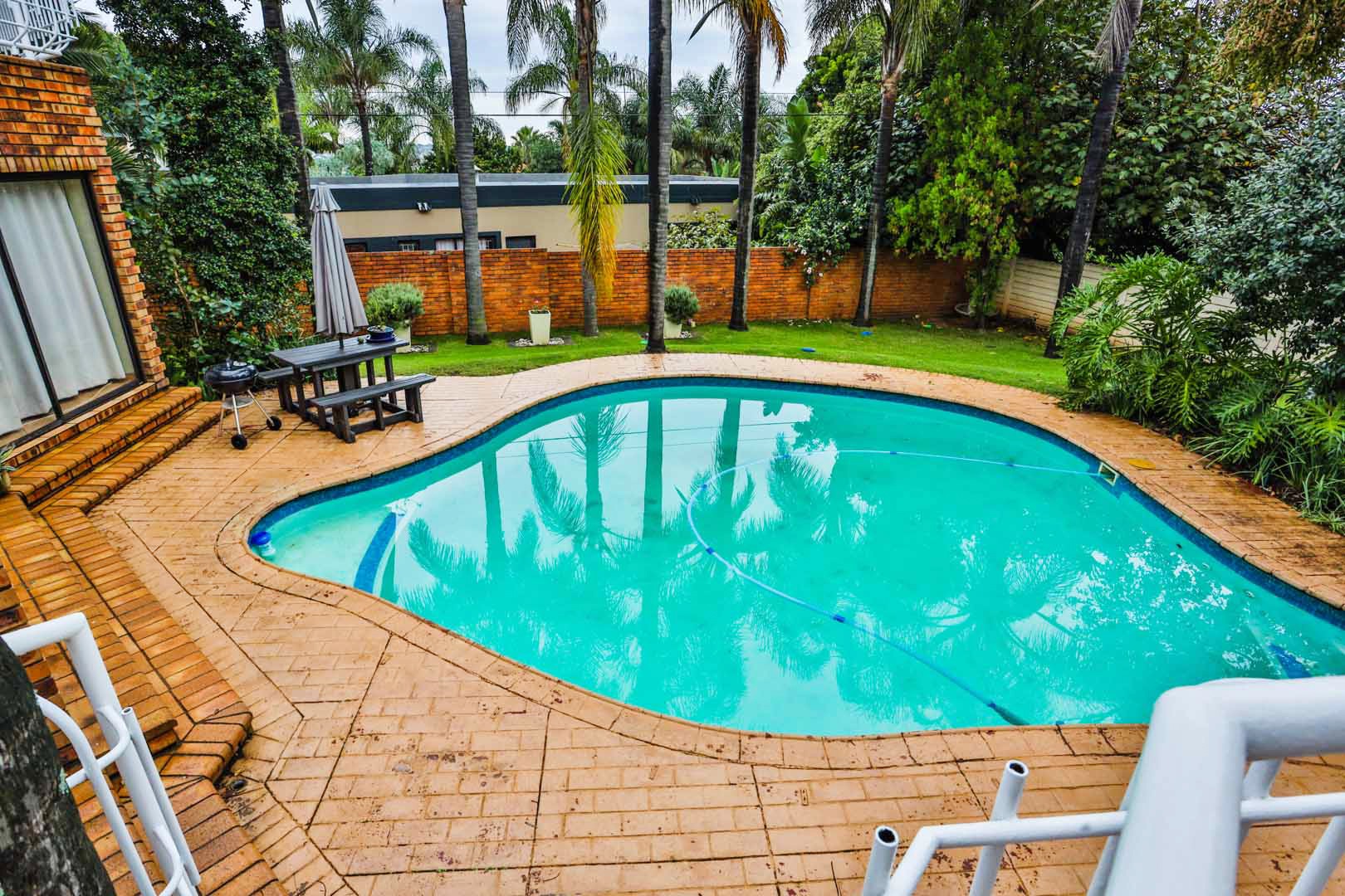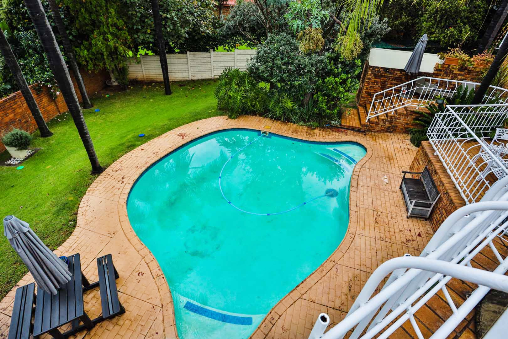 Patio overlooking a well-maintained garden and sparkling swimming pool