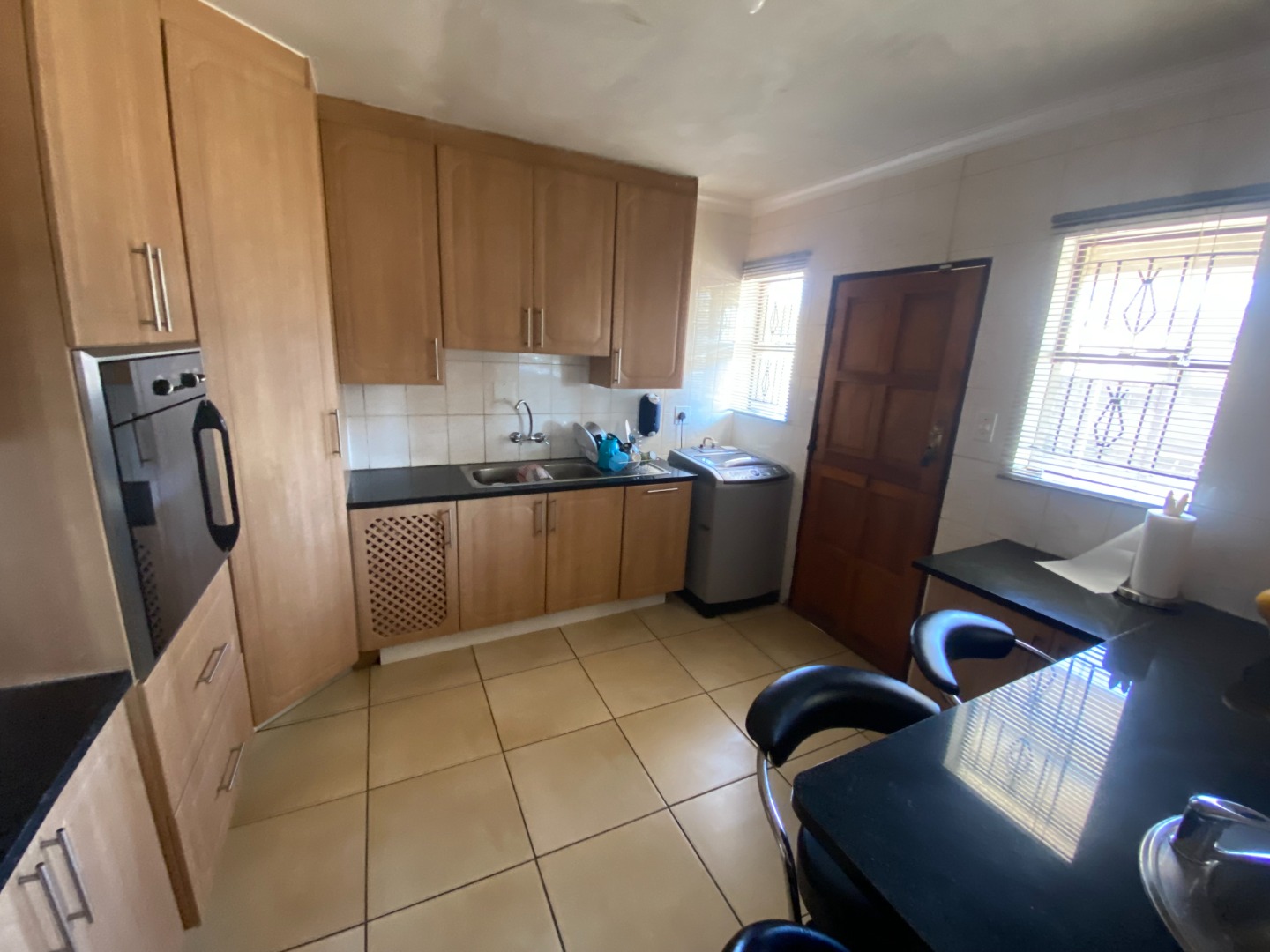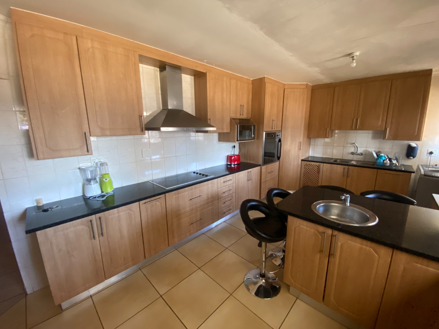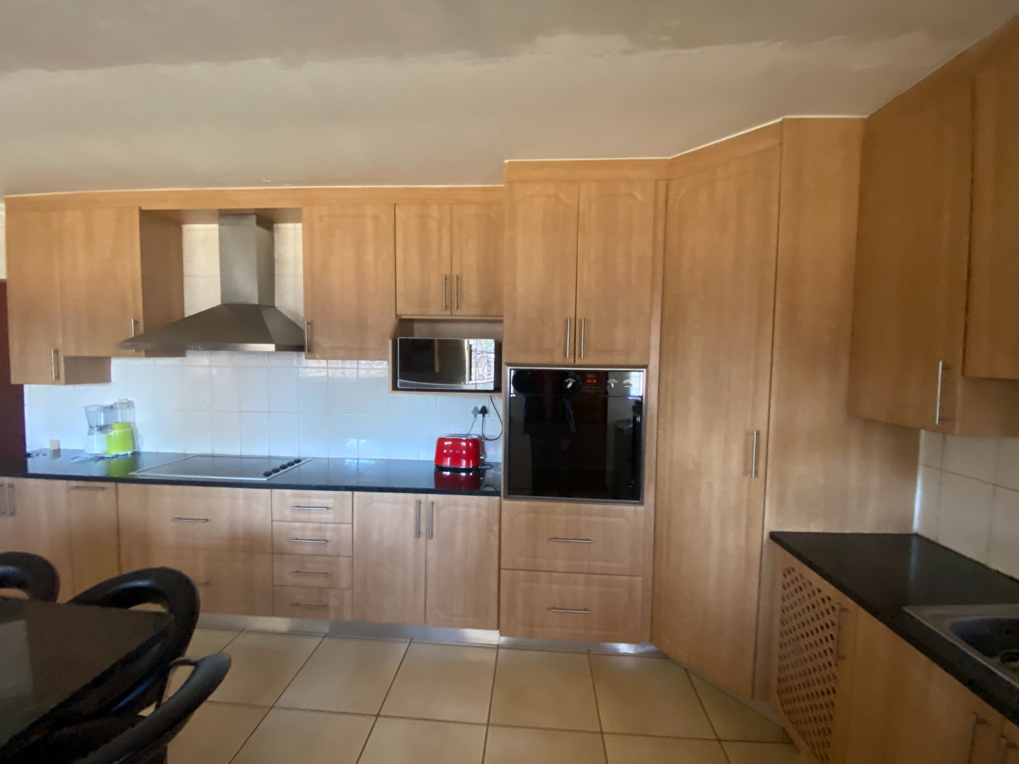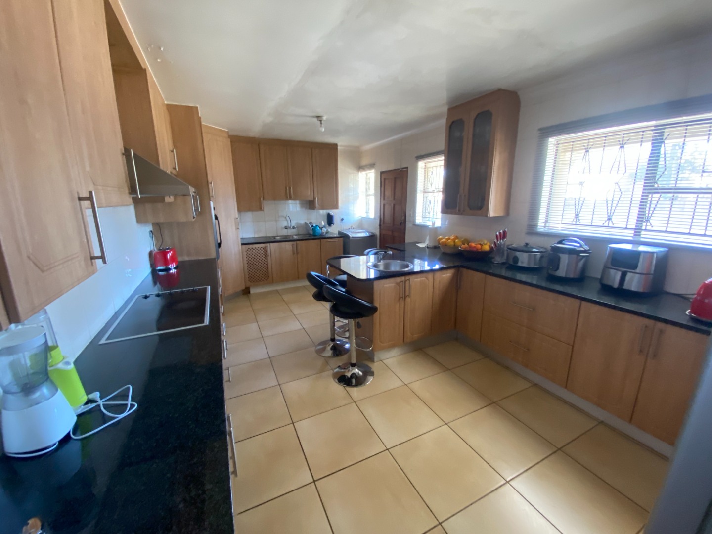 This beautiful and spacious 4-bedroom house is situated on a corner stand in Clayville Ext 7. The house has spacious living areas including a lounge, dining room and a TV/Family room walking onto a large, covered patio (sunroom). The dining room is linked with the open plan kitchen. The kitchen is large with a breakfast nook, many cupboards with granite tops, eye-level oven, glass hob with extractor fan, and washing machine/dishwasher outlet.