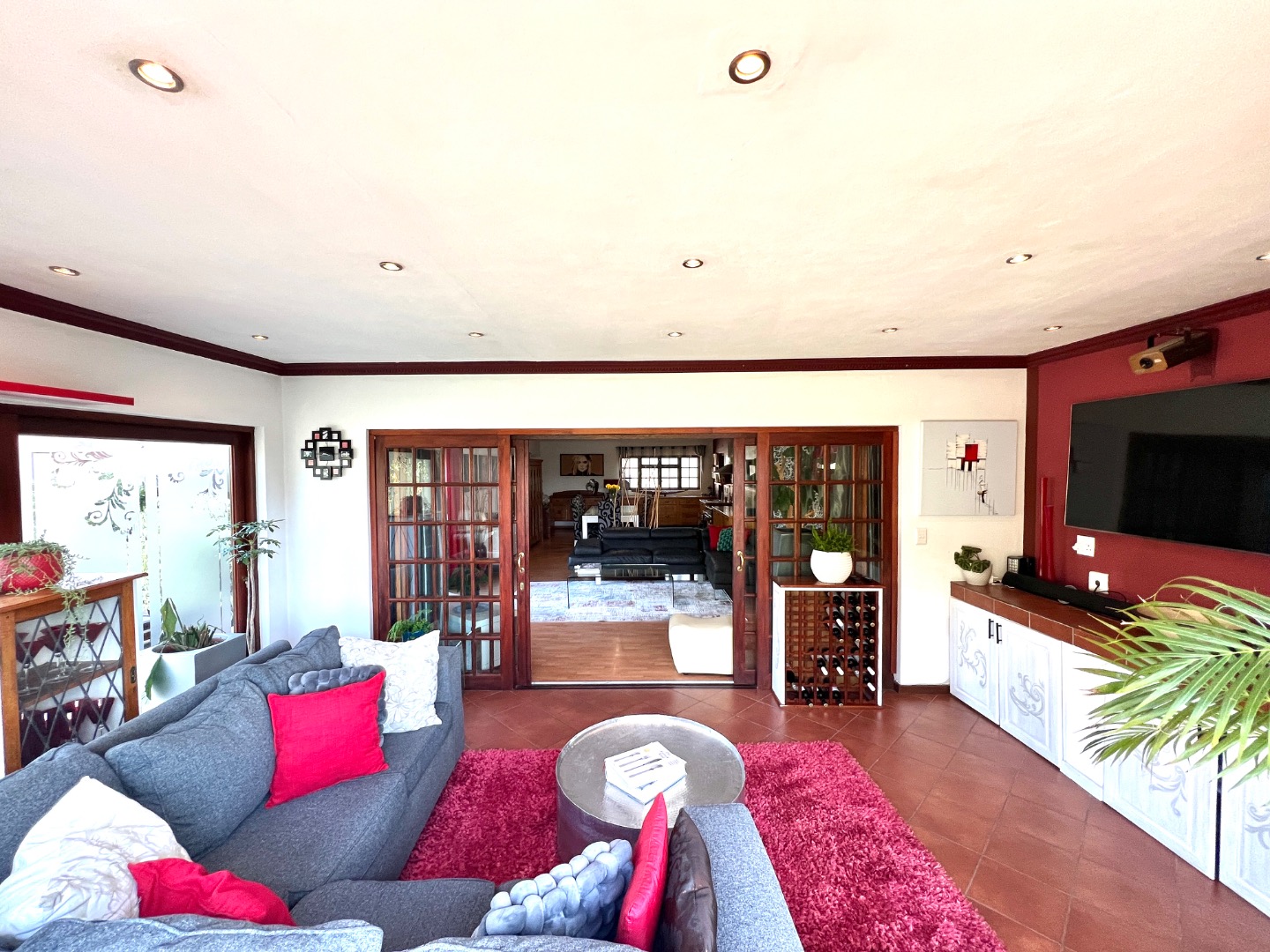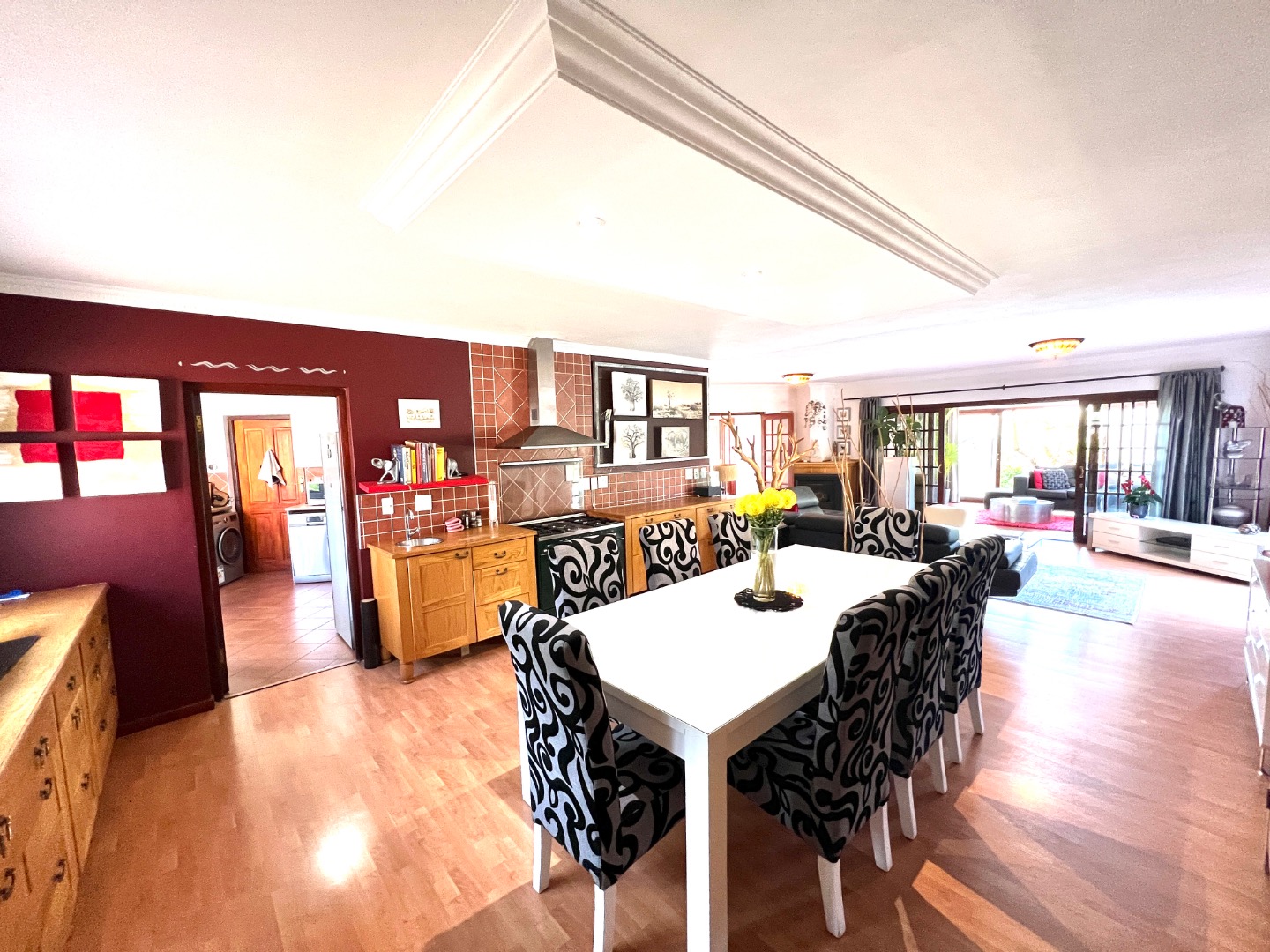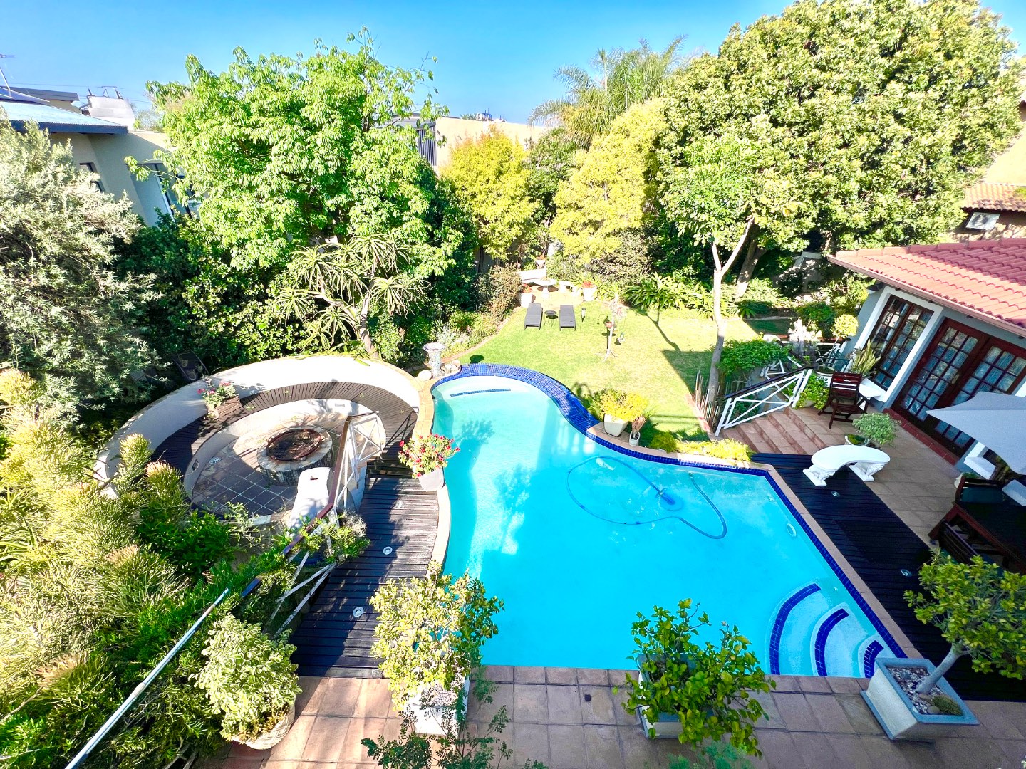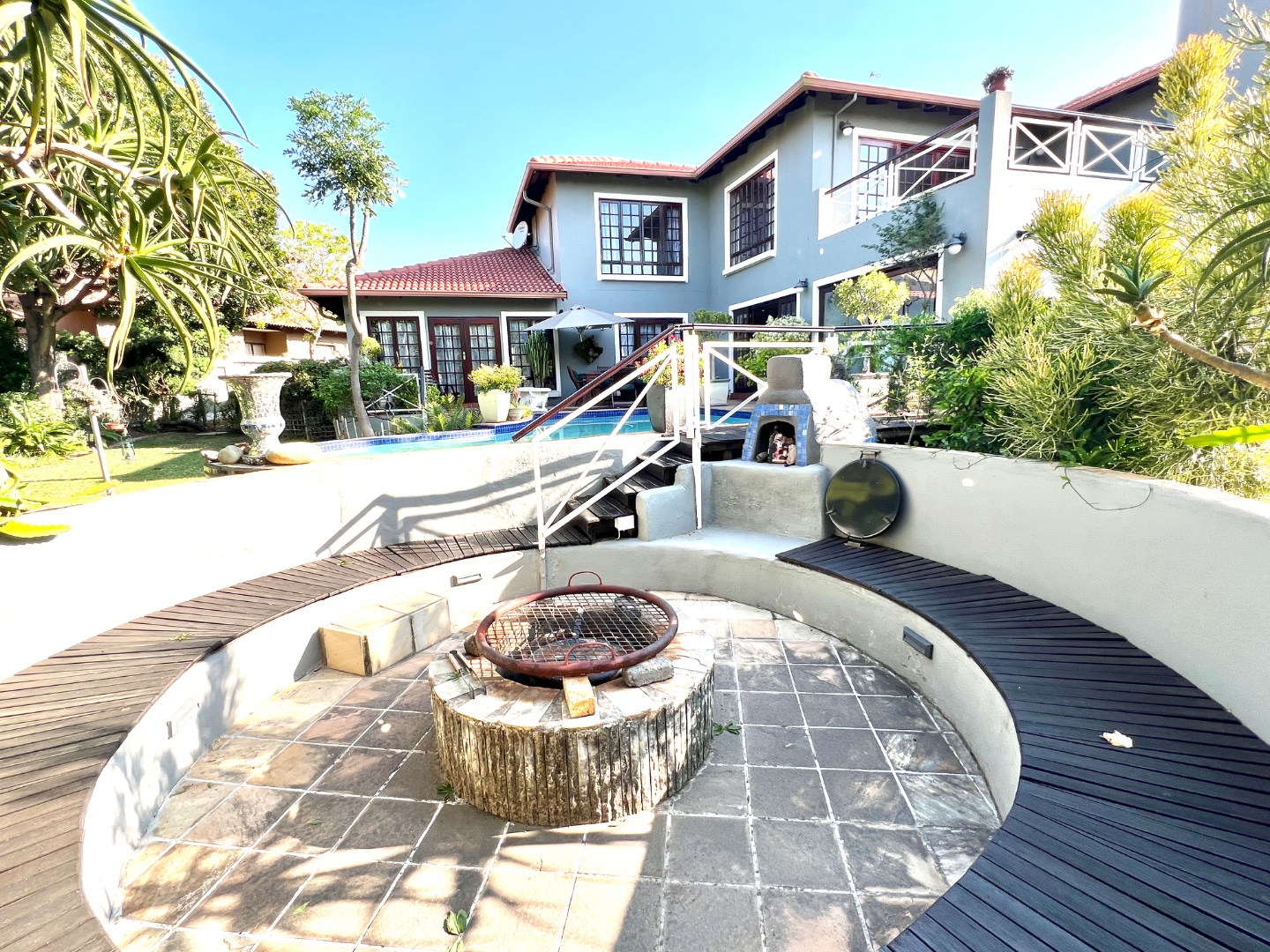 - Stacking glass doors opening to a covered patio with views of the manicured garden, sparkling pool, and boma area complete with pizza oven and outdoor braai – an entertainer’s dream.