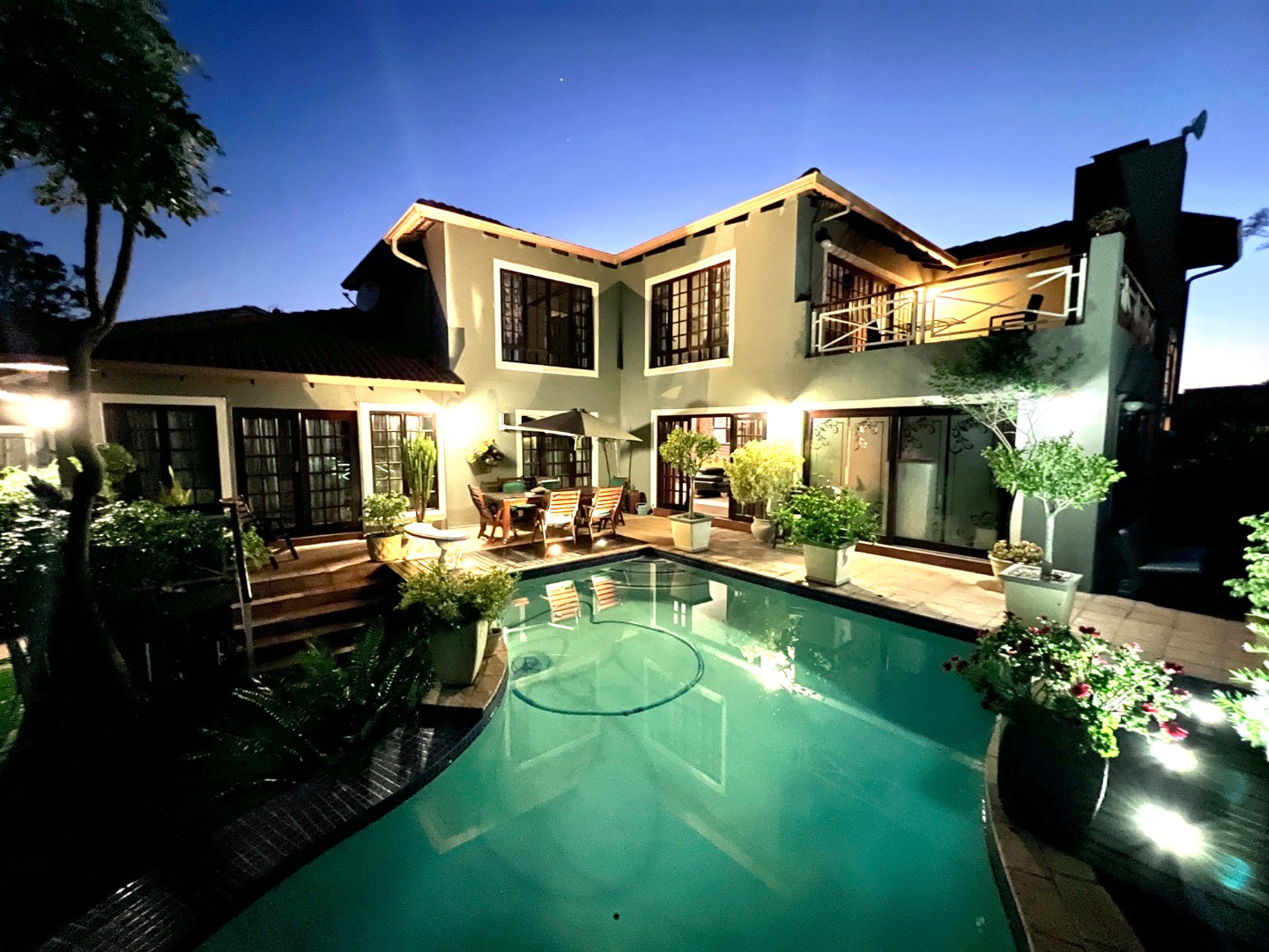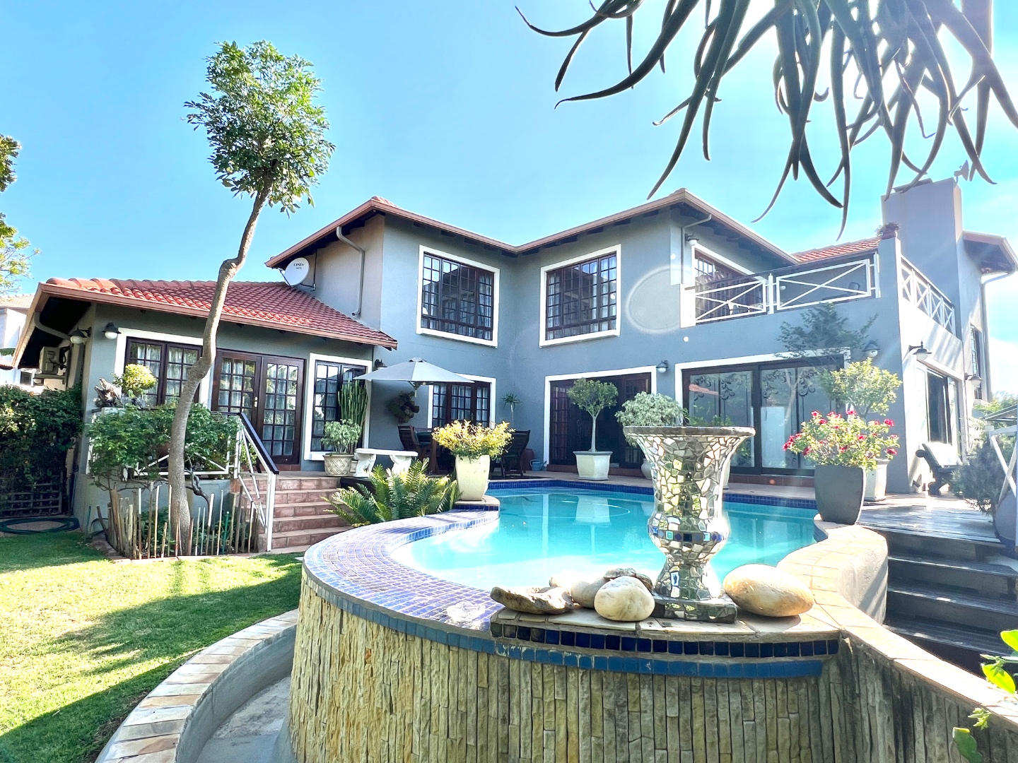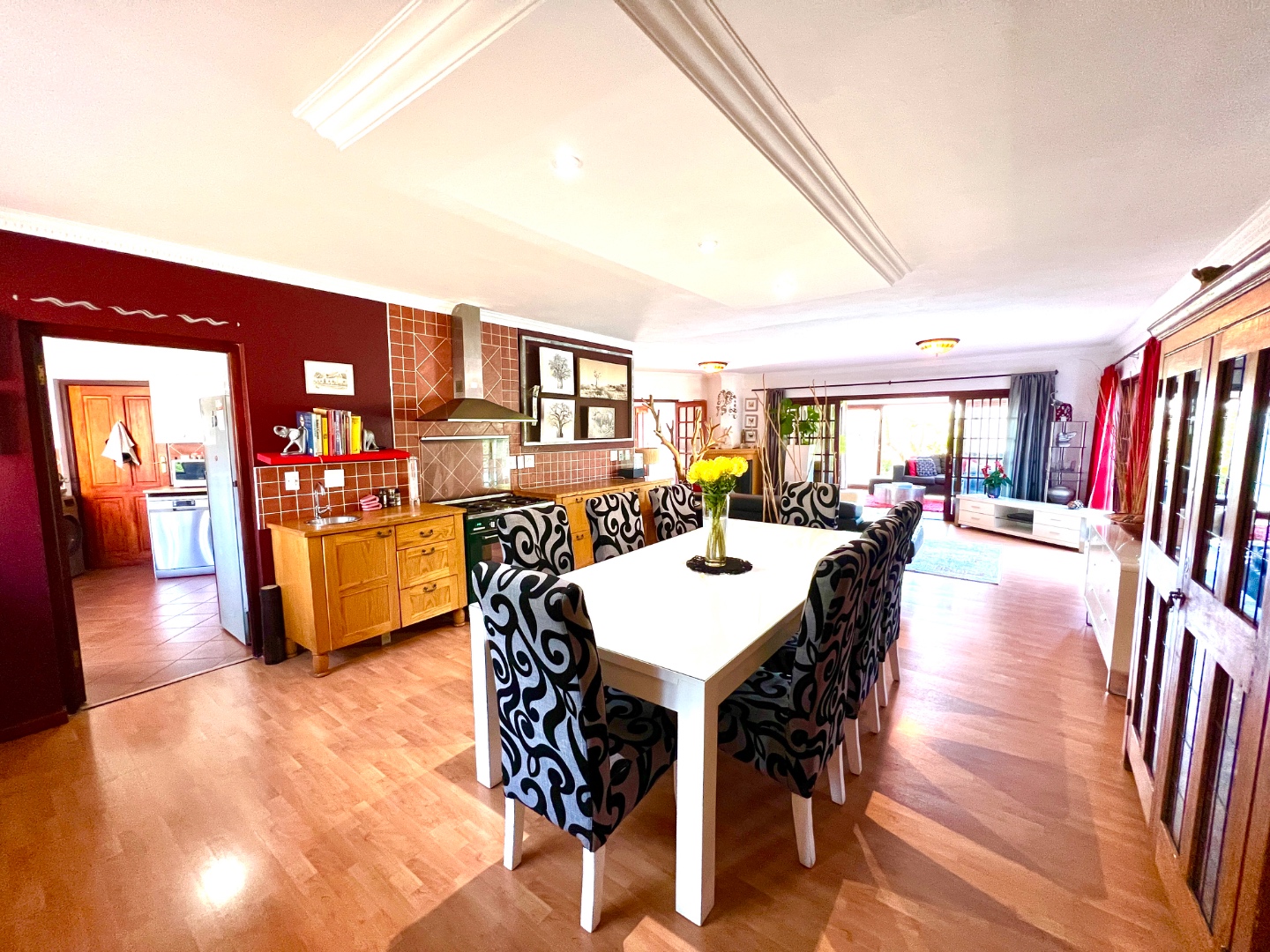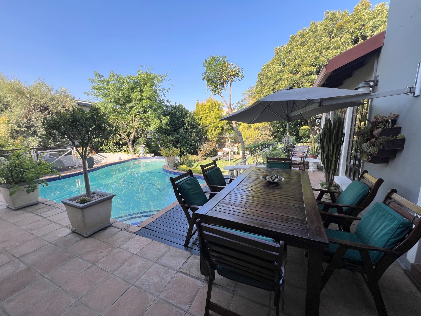 - Stacking glass doors opening to a covered patio with views of the manicured garden, sparkling pool, and boma area complete with pizza oven and outdoor braai – an entertainer’s dream.