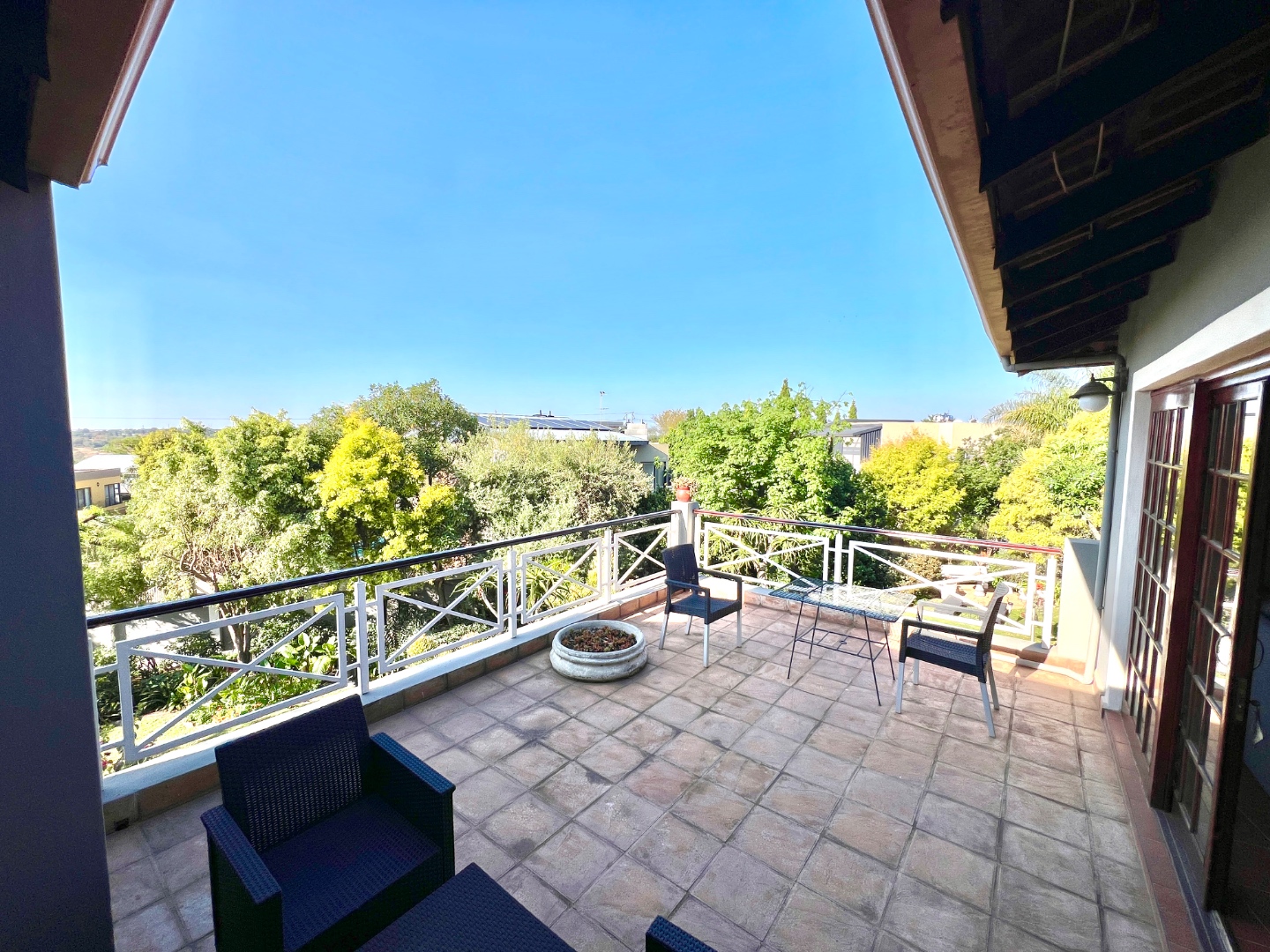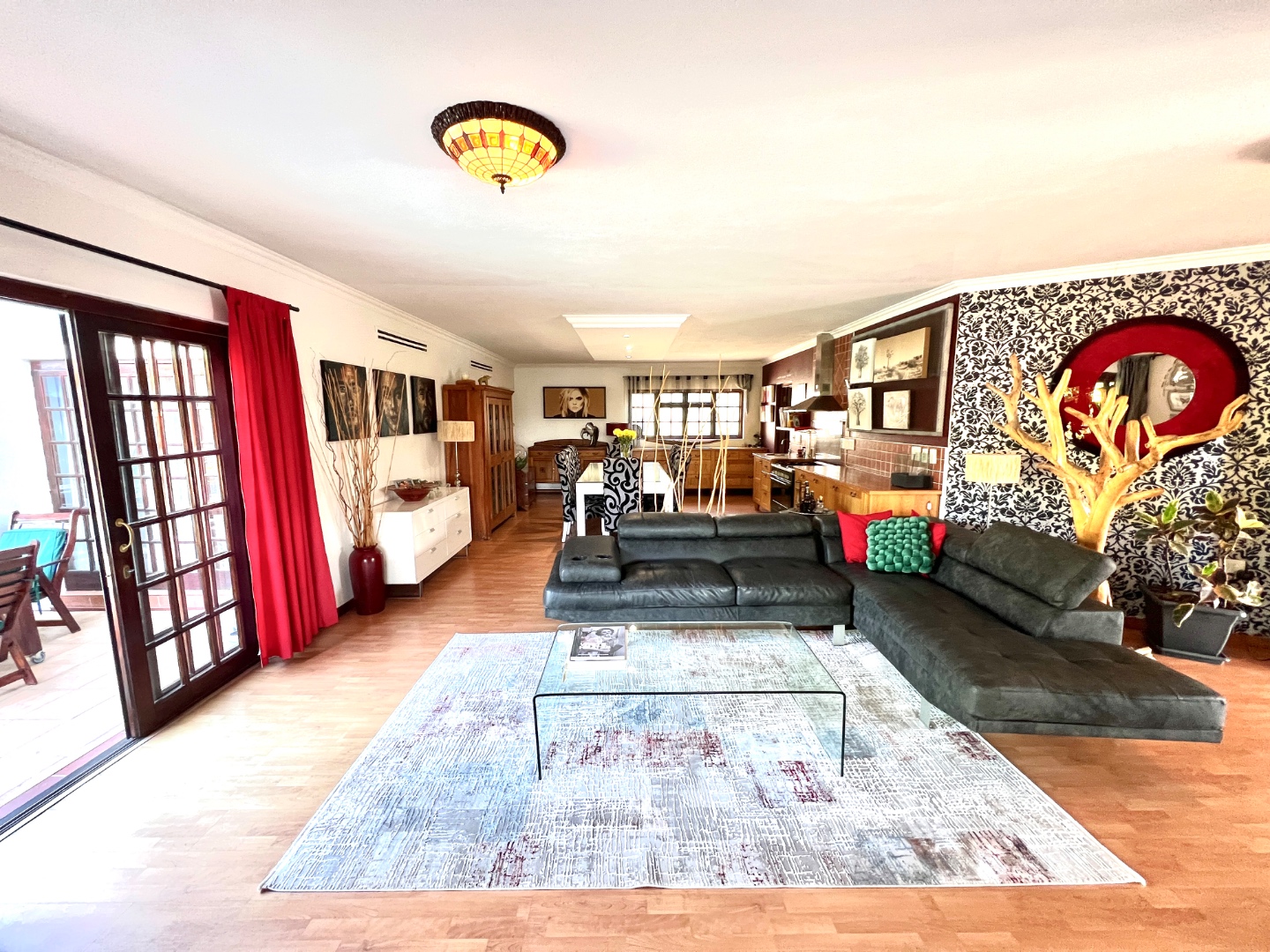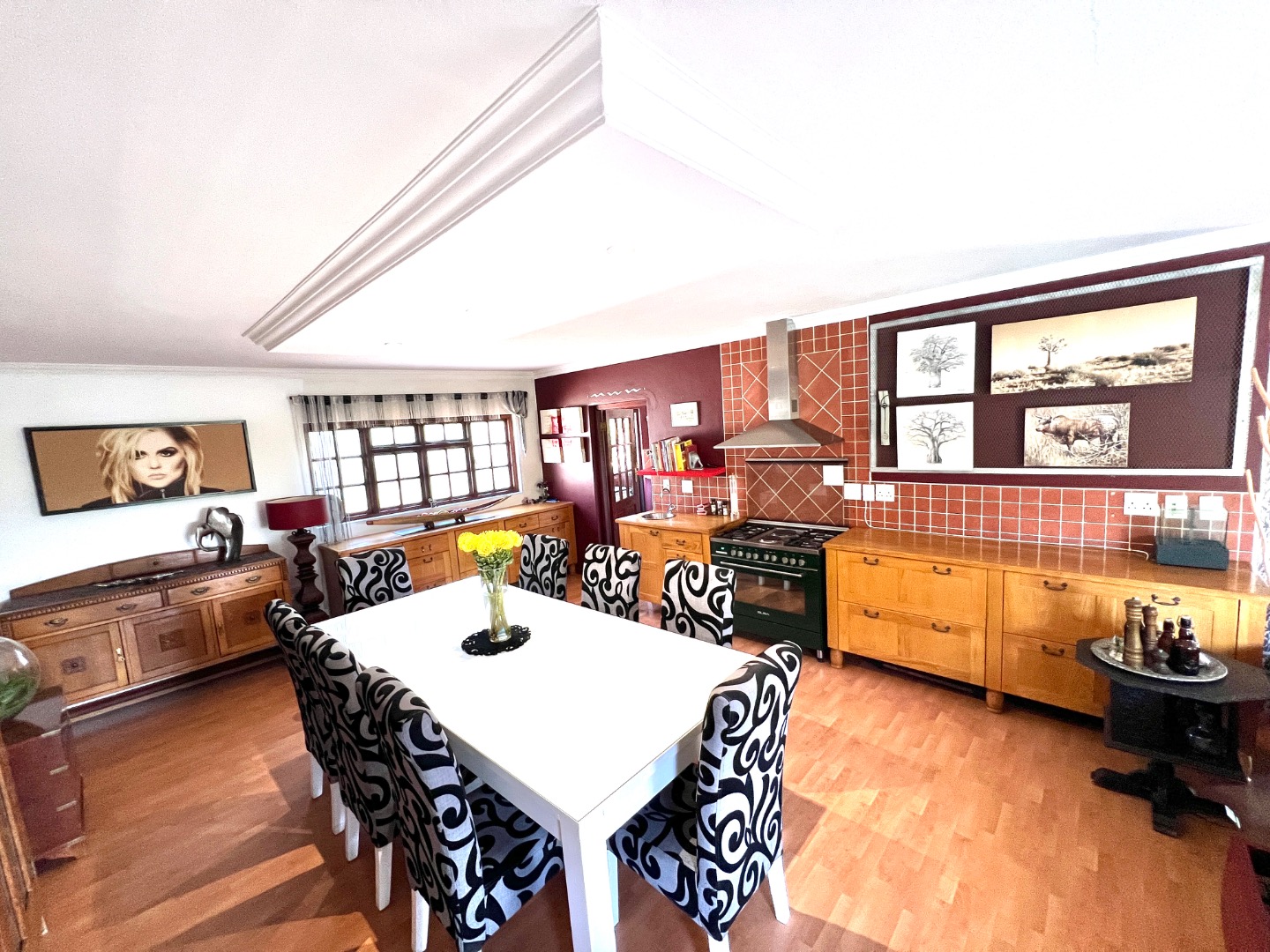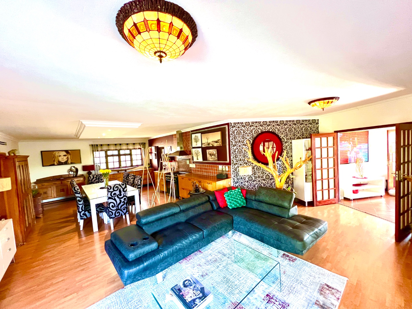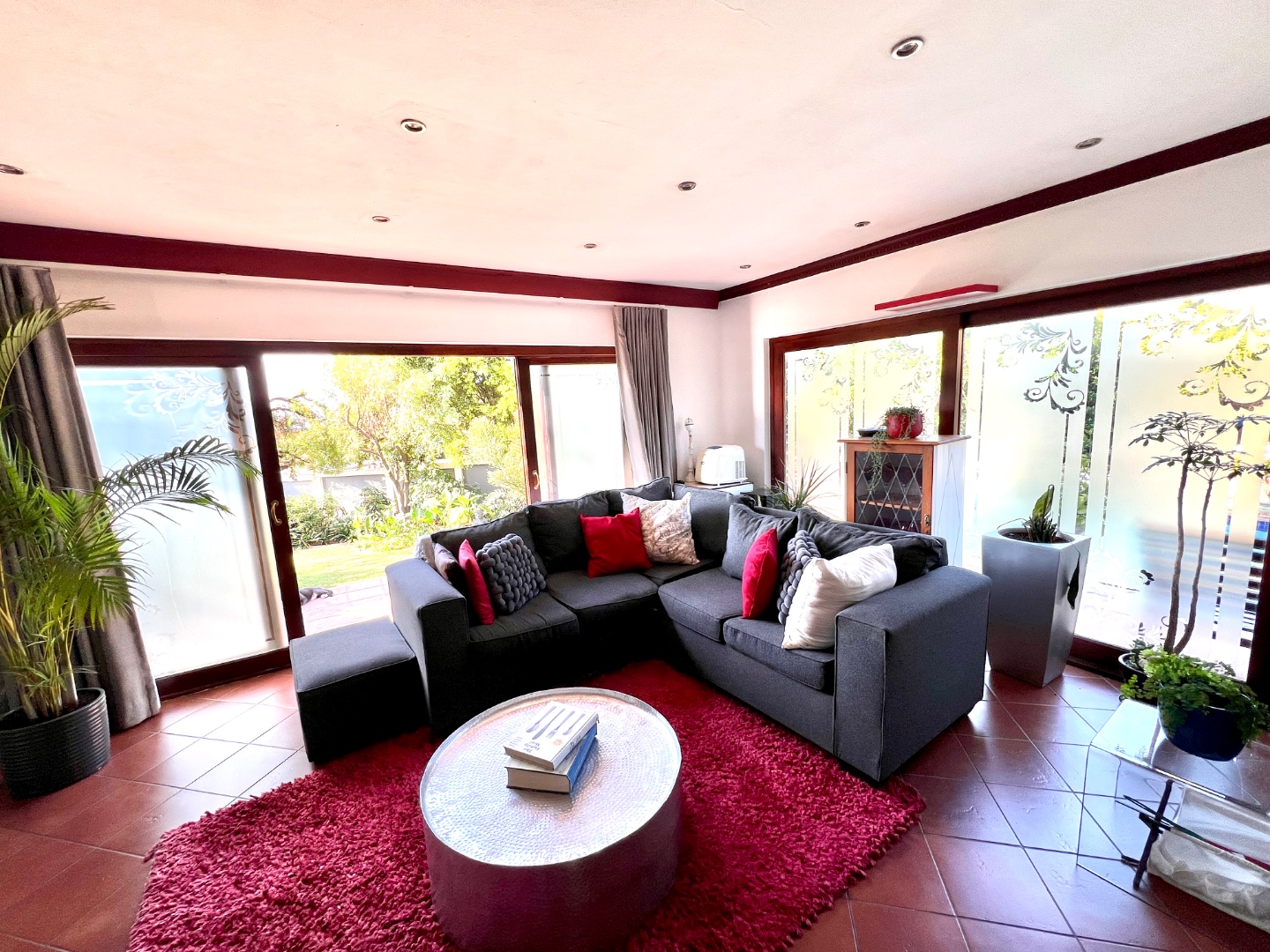 - Stacking glass doors opening to a covered patio with views of the manicured garden, sparkling pool, and boma area complete with pizza oven and outdoor braai – an entertainer’s dream.